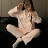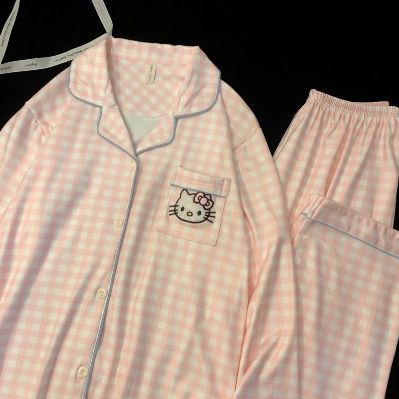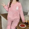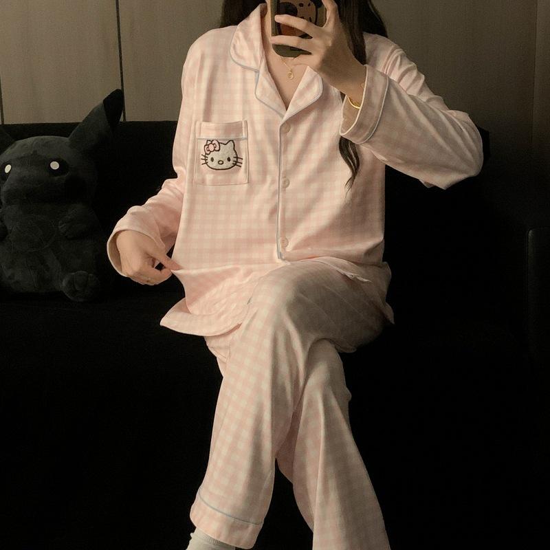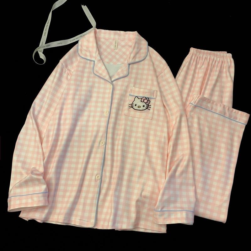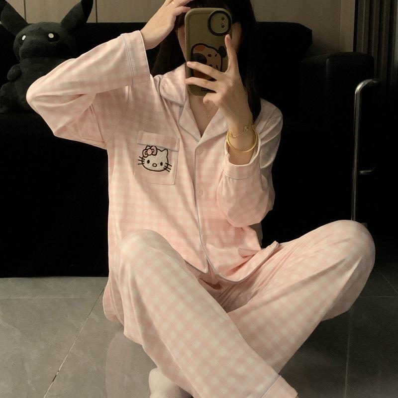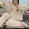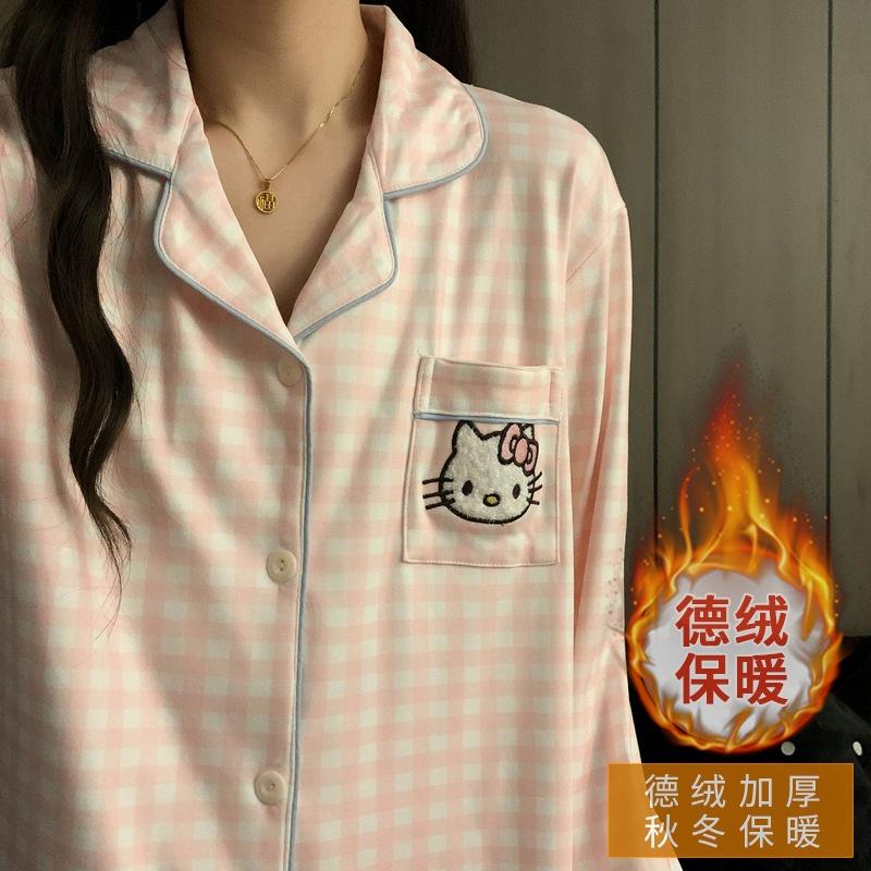 Pijama de talla grande de dibujos animados de gatito KT rosa en stock de fábrica para mujer, pantalones de otoño e invierno de manga larga para estar en casa, conjunto cálido de dos piezas