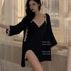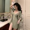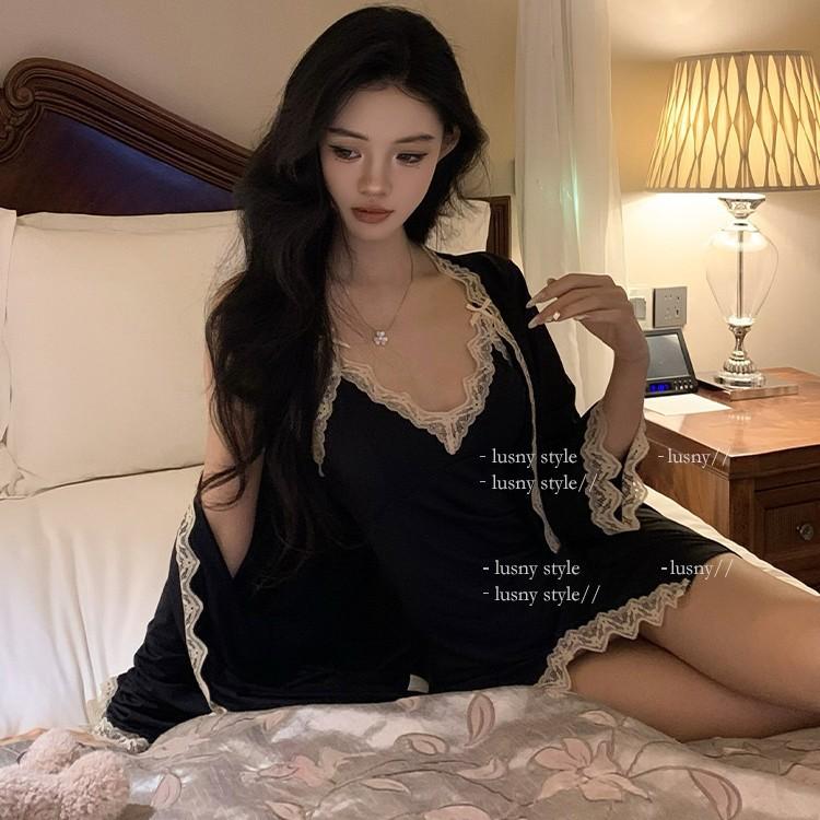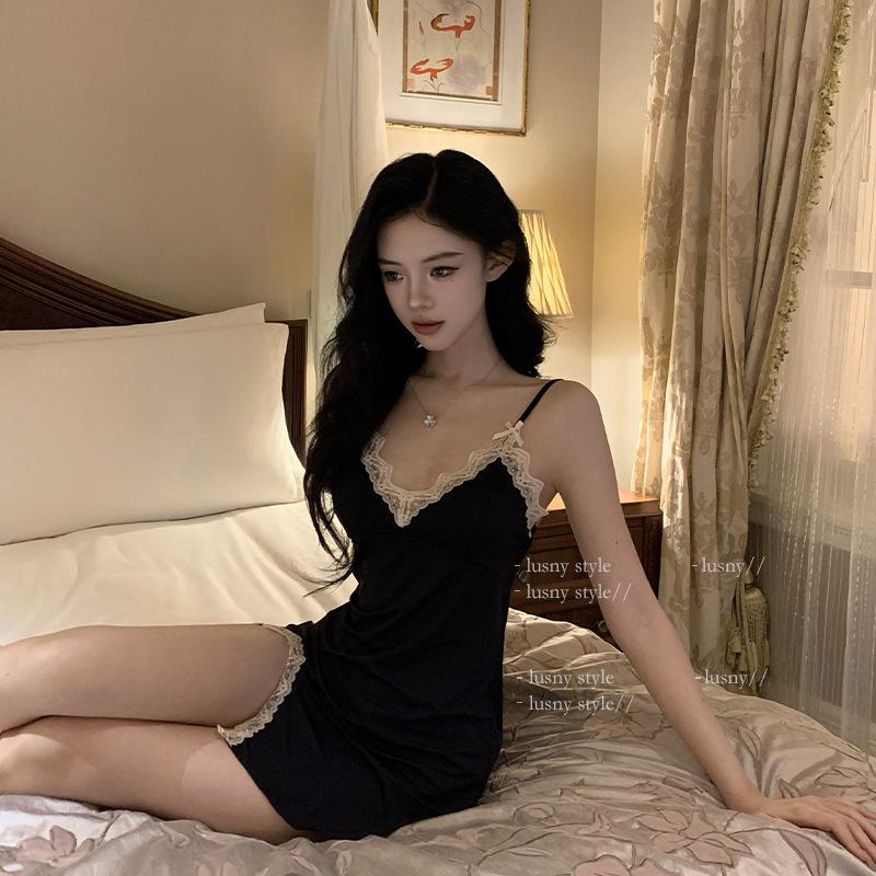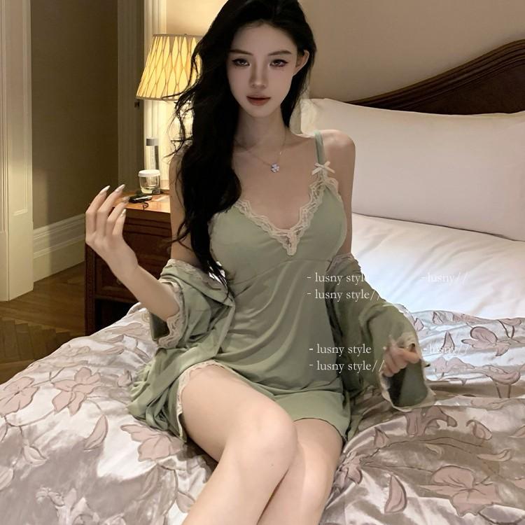 Camisón de pijama sexy de verano nuevo camisón de tirantes de dos piezas de seda de hielo de alta calidad con almohadilla para el pecho de encaje ropa de hogar de primavera y otoño