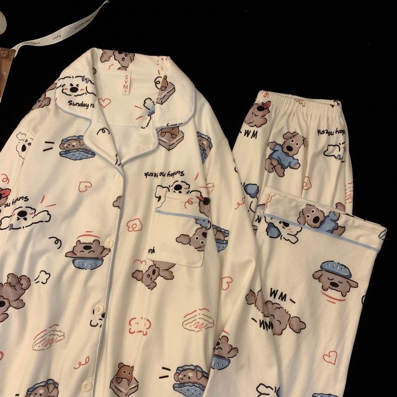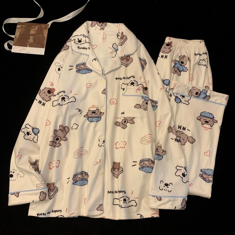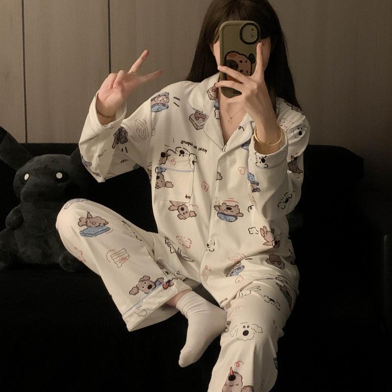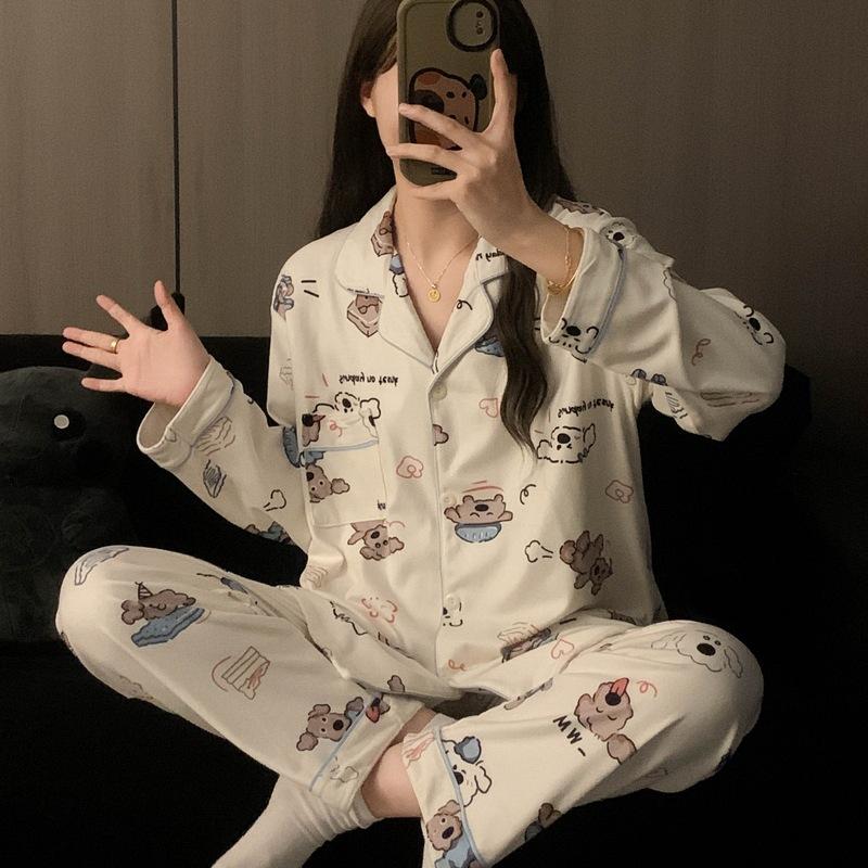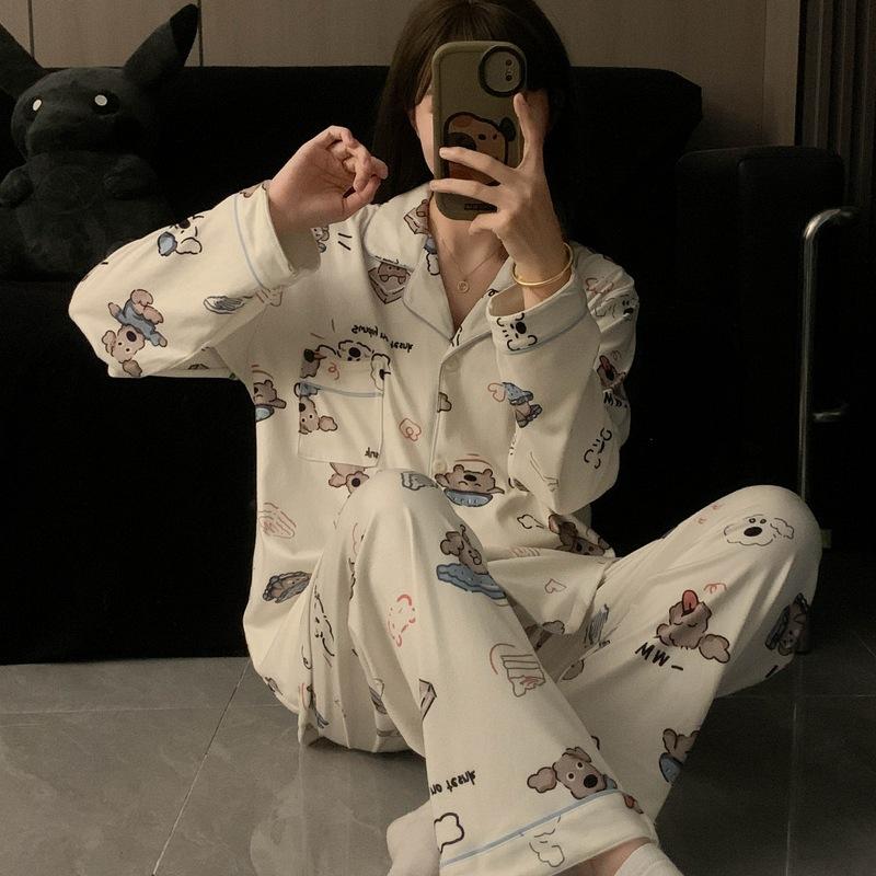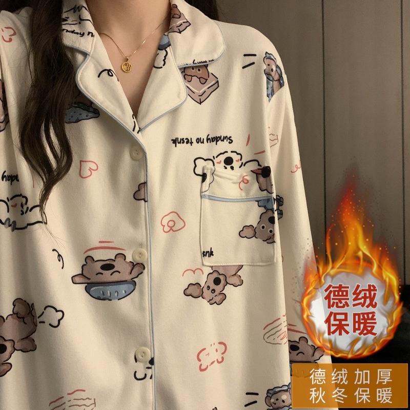 Pijama de talla grande de fábrica en stock para mujer, otoño e invierno, pantalones de manga larga, grueso y cálido, caricatura, lindo, divertido, cachorro, traje de dos piezas