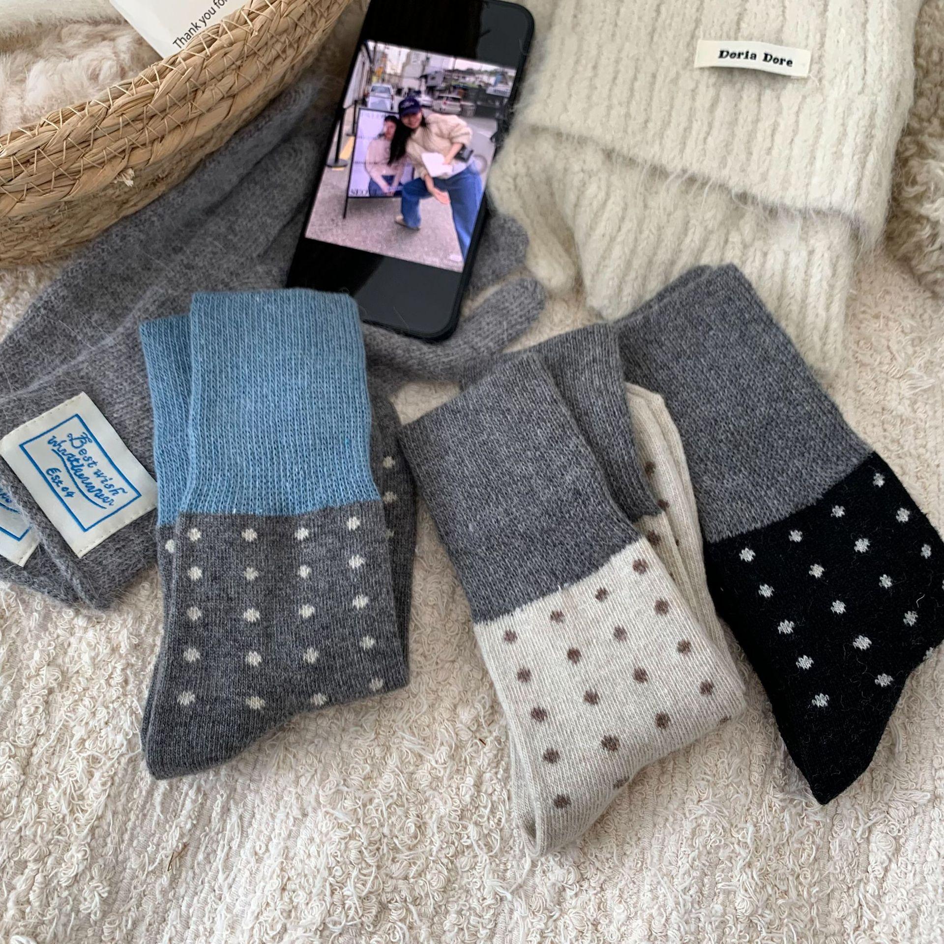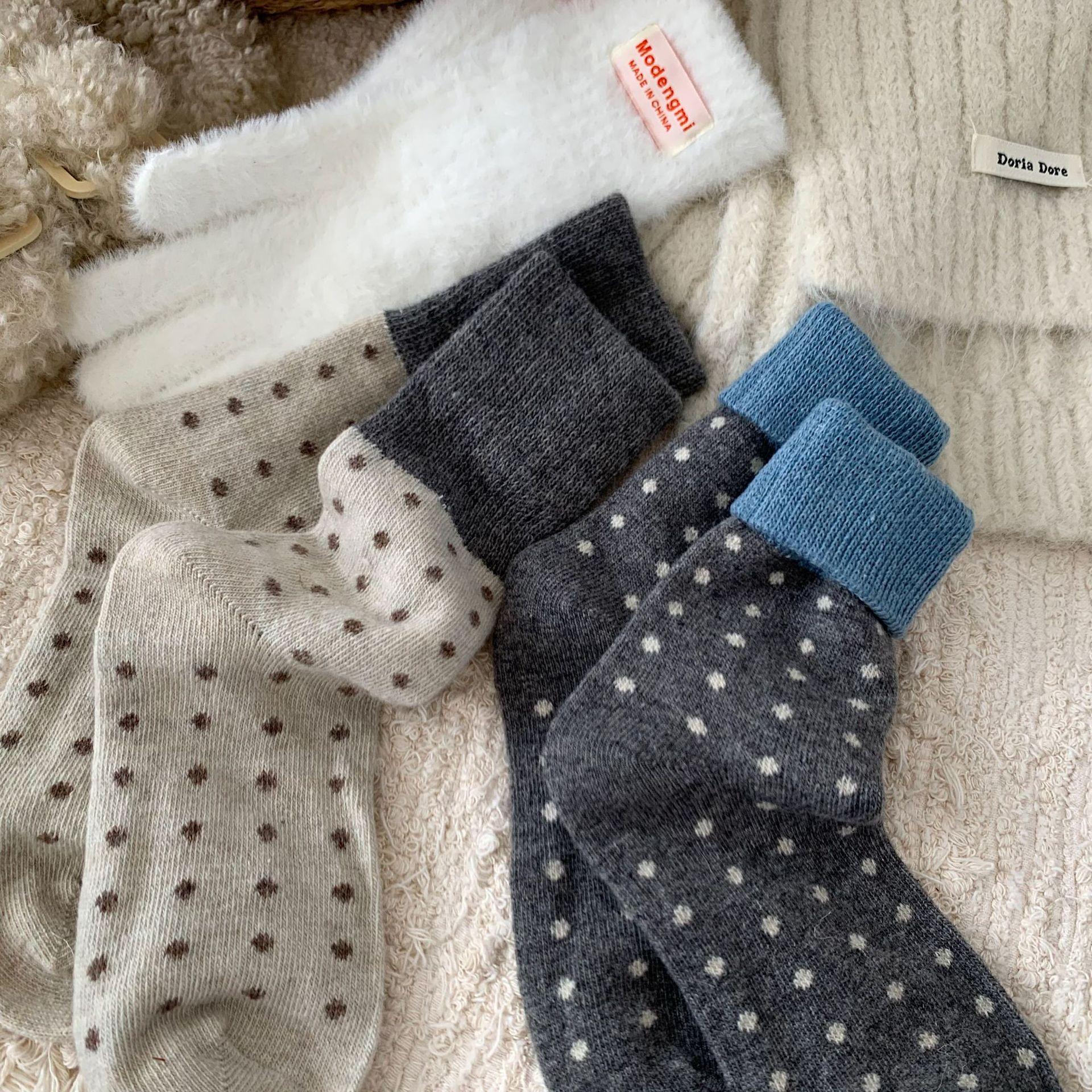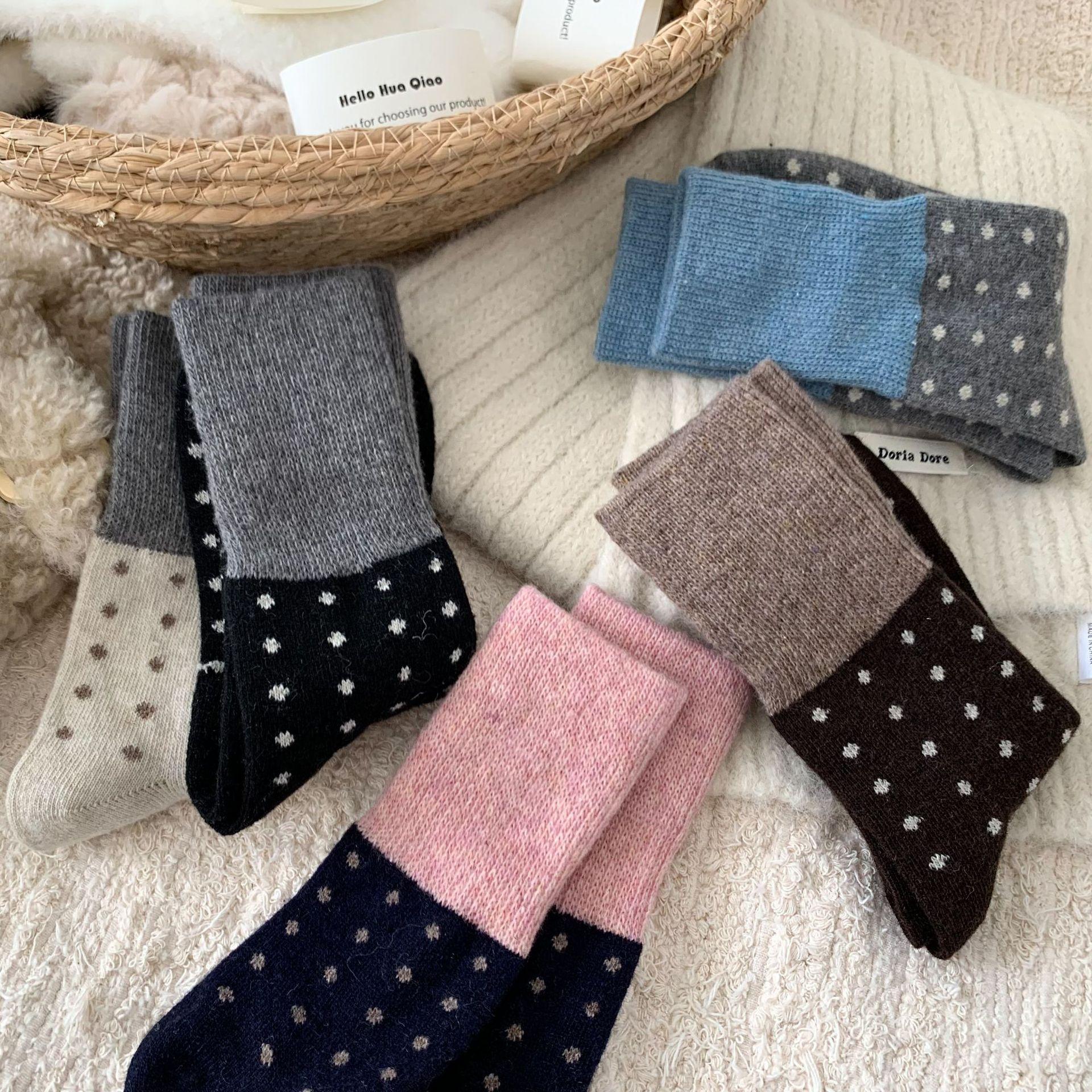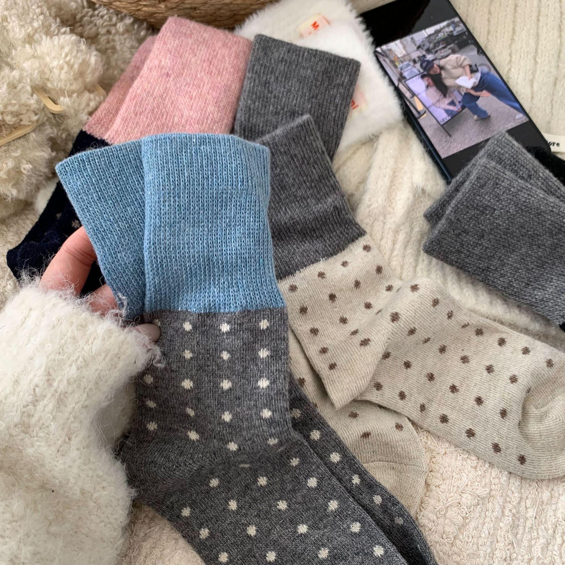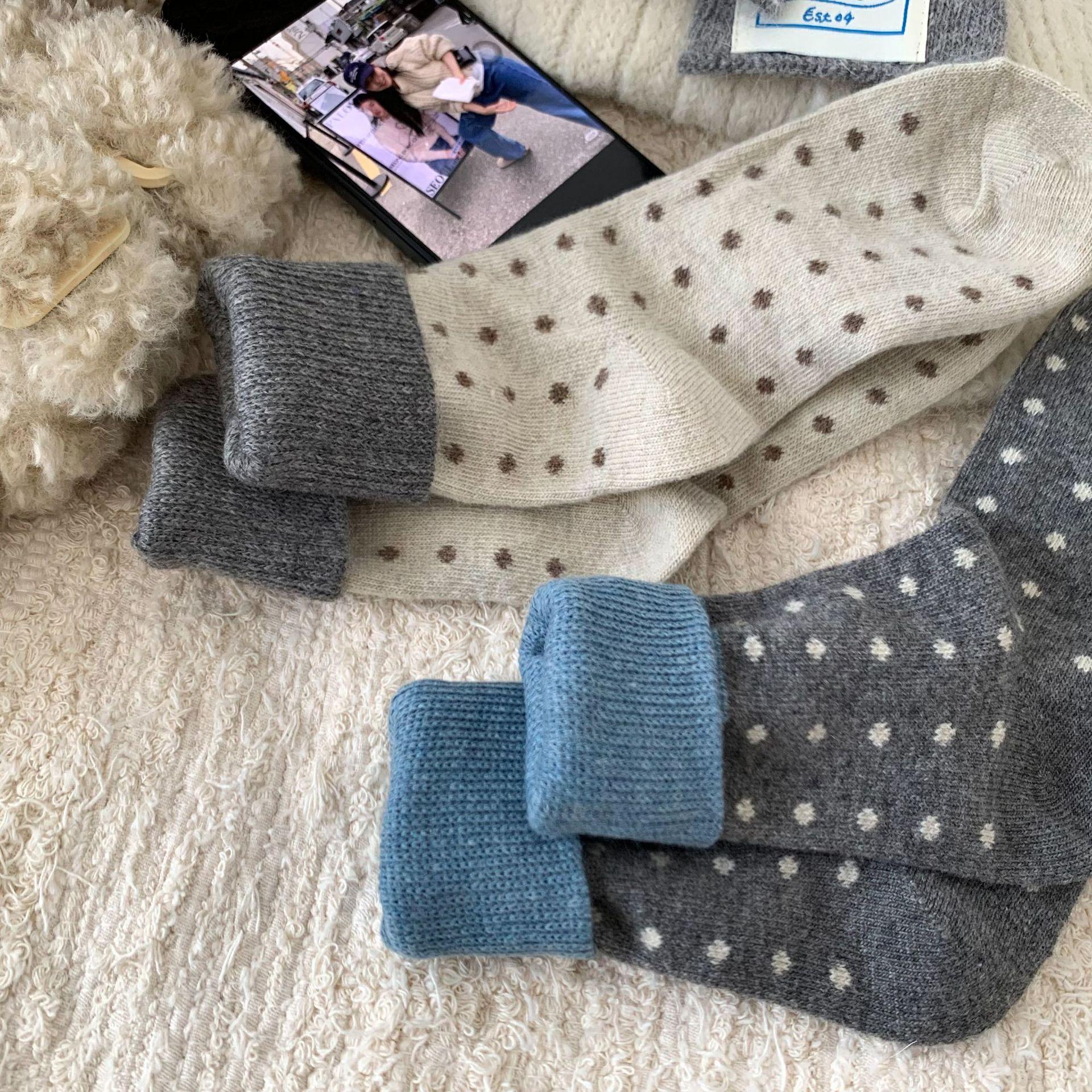 Calcetines de Lana Vintage para Mujer Otoño e Invierno Calcetines Gruesos Cálidos de Media Caña Ins Modernos Casuales Lunares Polares Marrón Maillard Medias