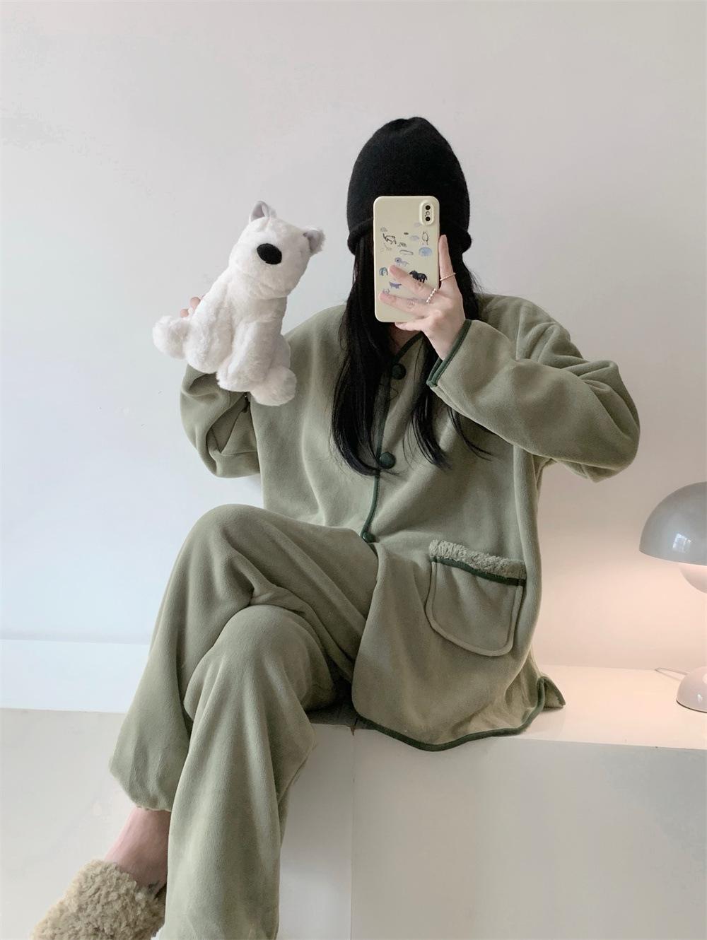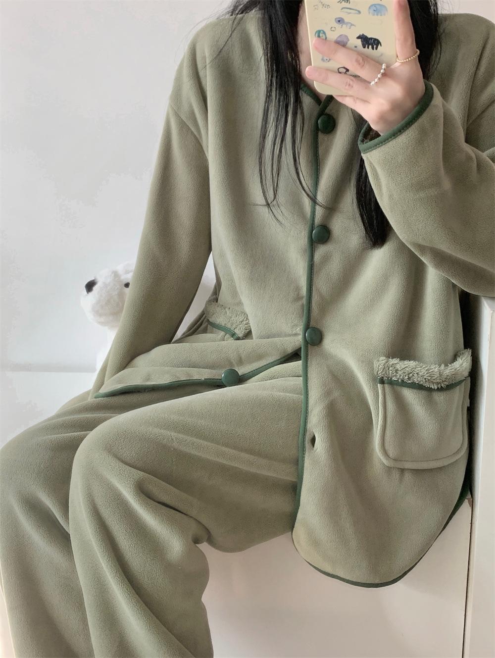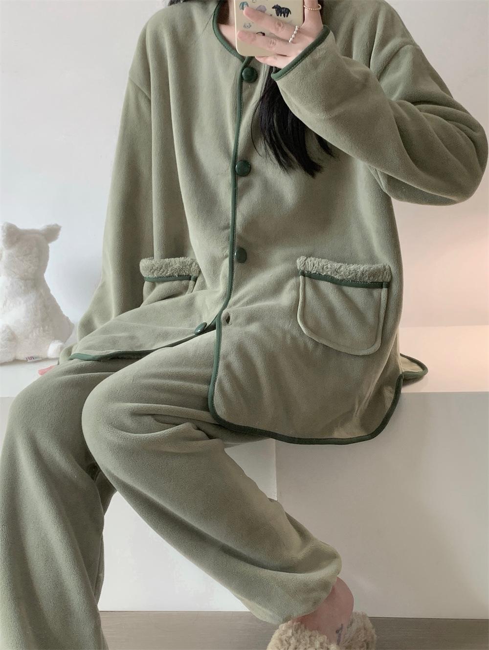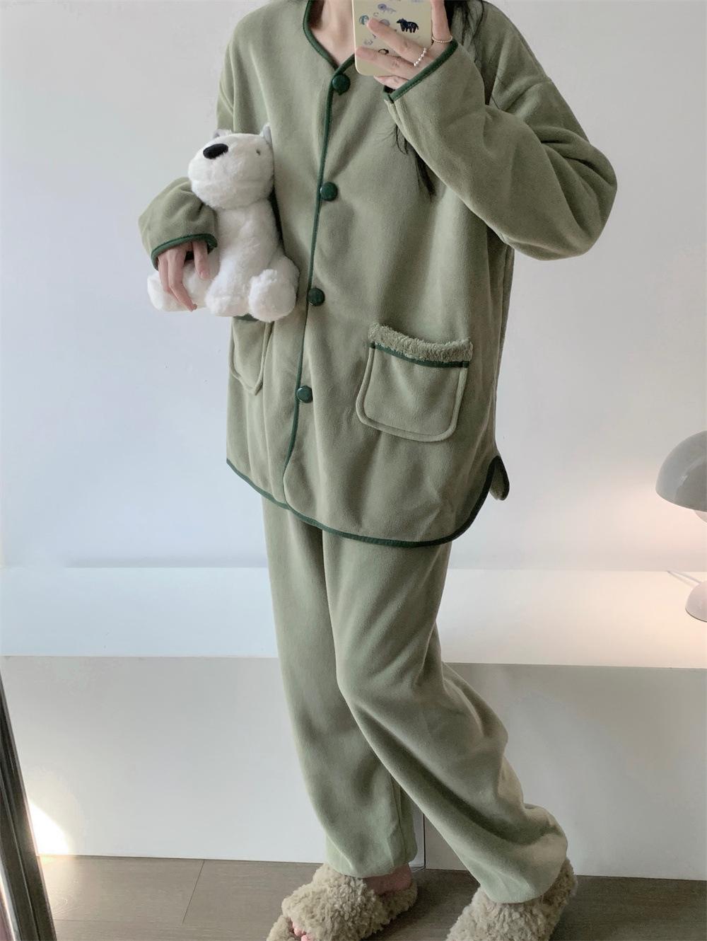 Pijama de Forro Polar Coral de Color Sólido de Alta Gama para Niña de Estilo Coreano para Otoño/Invierno, Conjunto de Ropa de Casa Cálido Grueso con Terciopelo Adicional para Mujer
