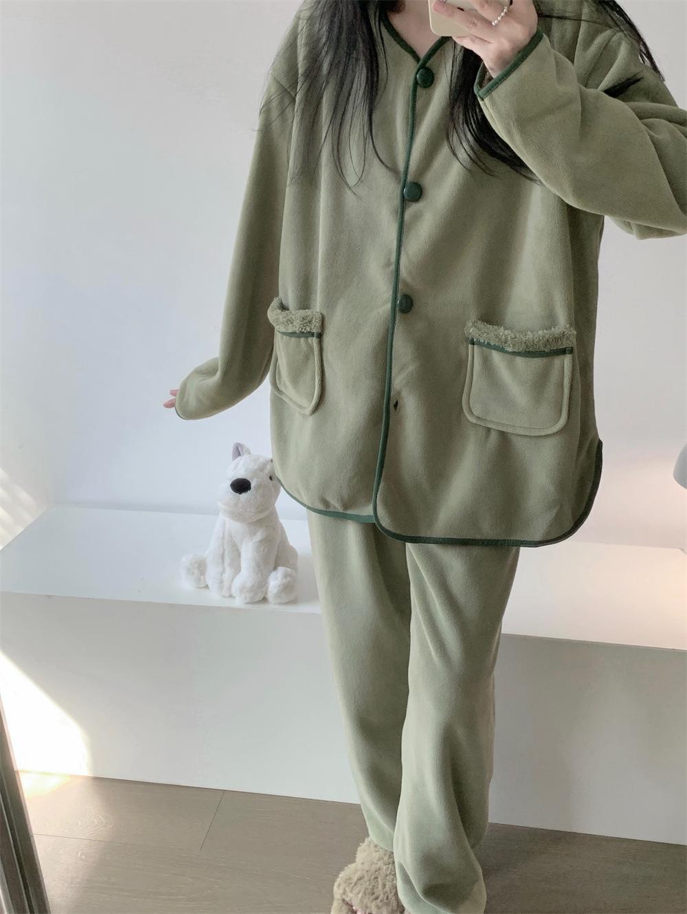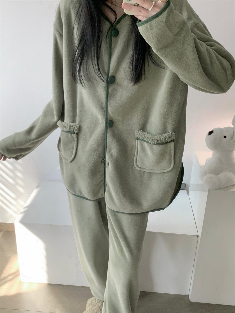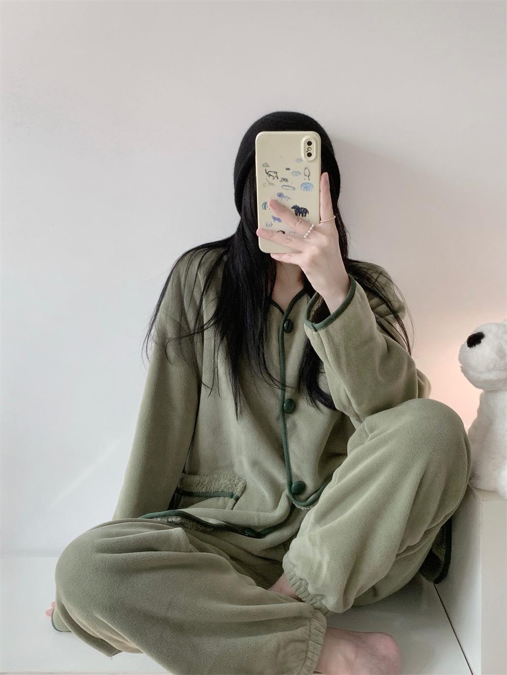 Pijama de Forro Polar Coral de Color Sólido de Alta Gama para Niña de Estilo Coreano para Otoño/Invierno, Conjunto de Ropa de Casa Cálido Grueso con Terciopelo Adicional para Mujer