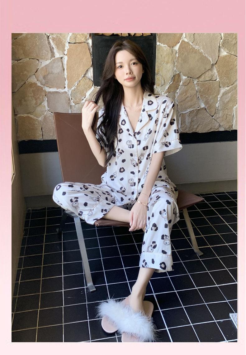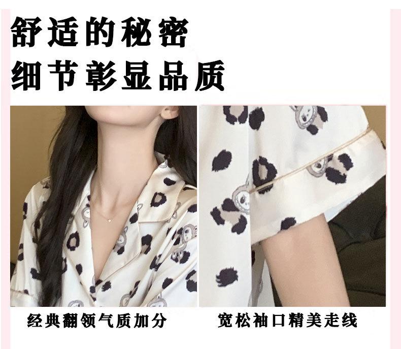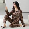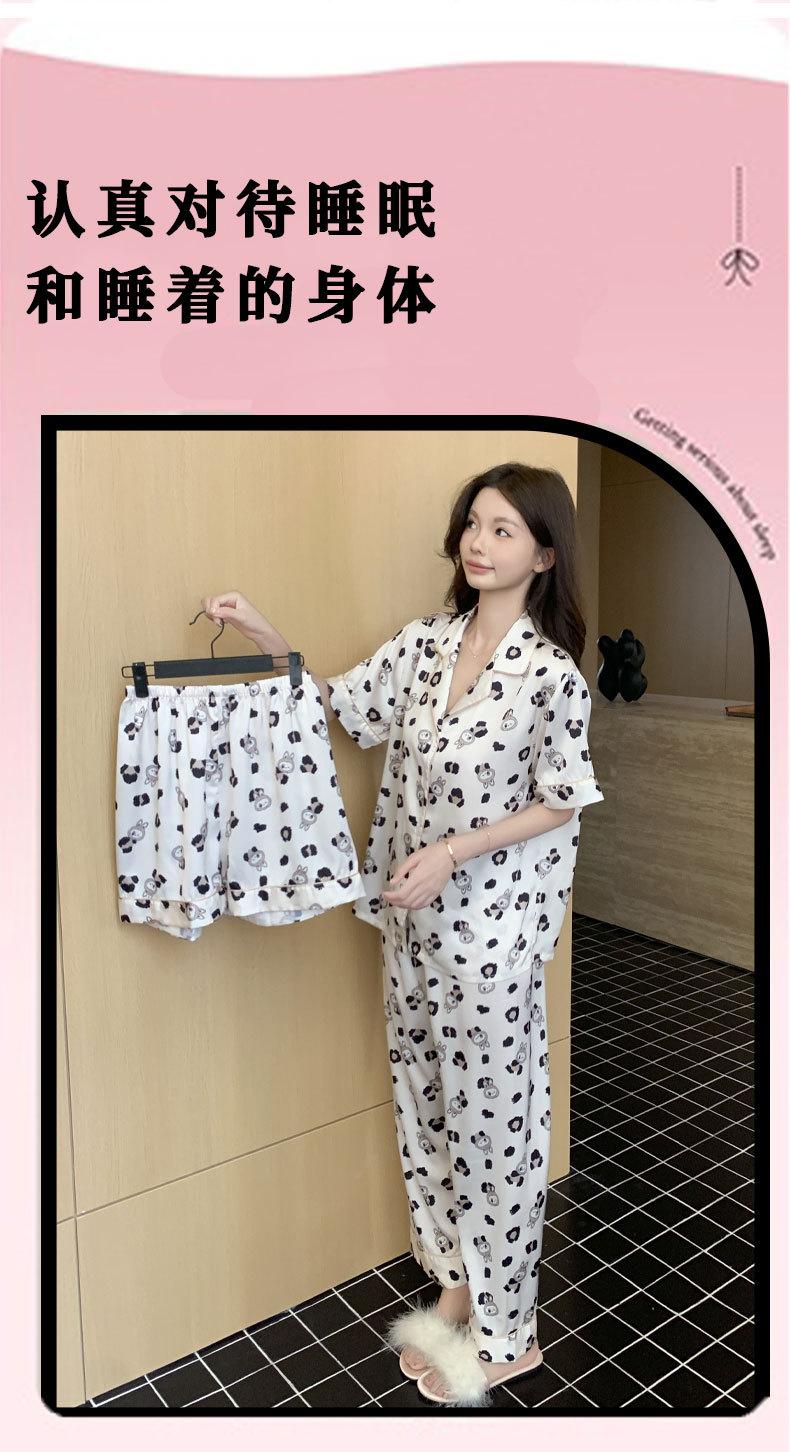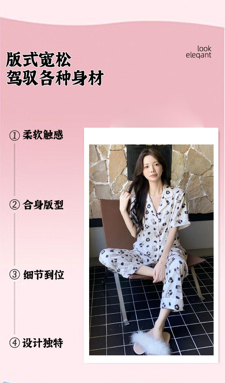 2025 Pijama Nuevo de Seda de Hielo para Mujer Delgado Estampado de Leopardo Tejido Conjunto de Tres Piezas Manga Corta Pantalón Largo Ropa de Casa Se Puede Usar Afuera