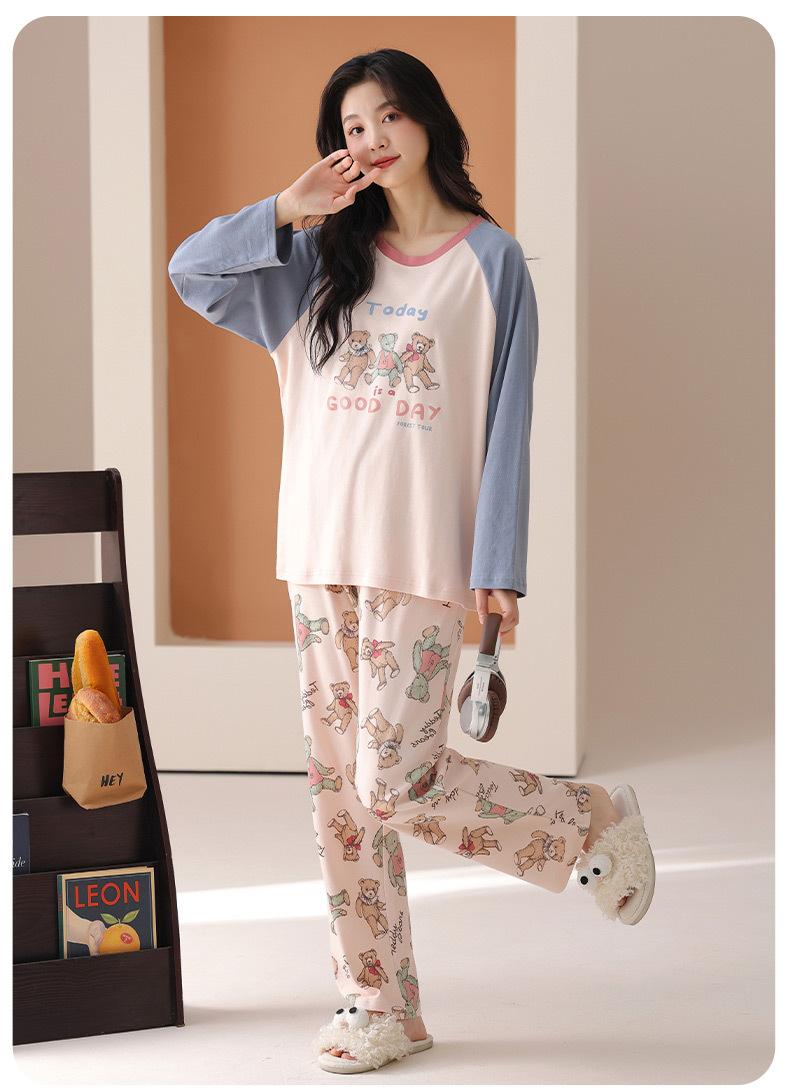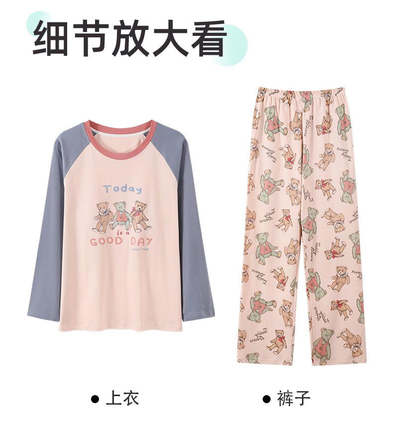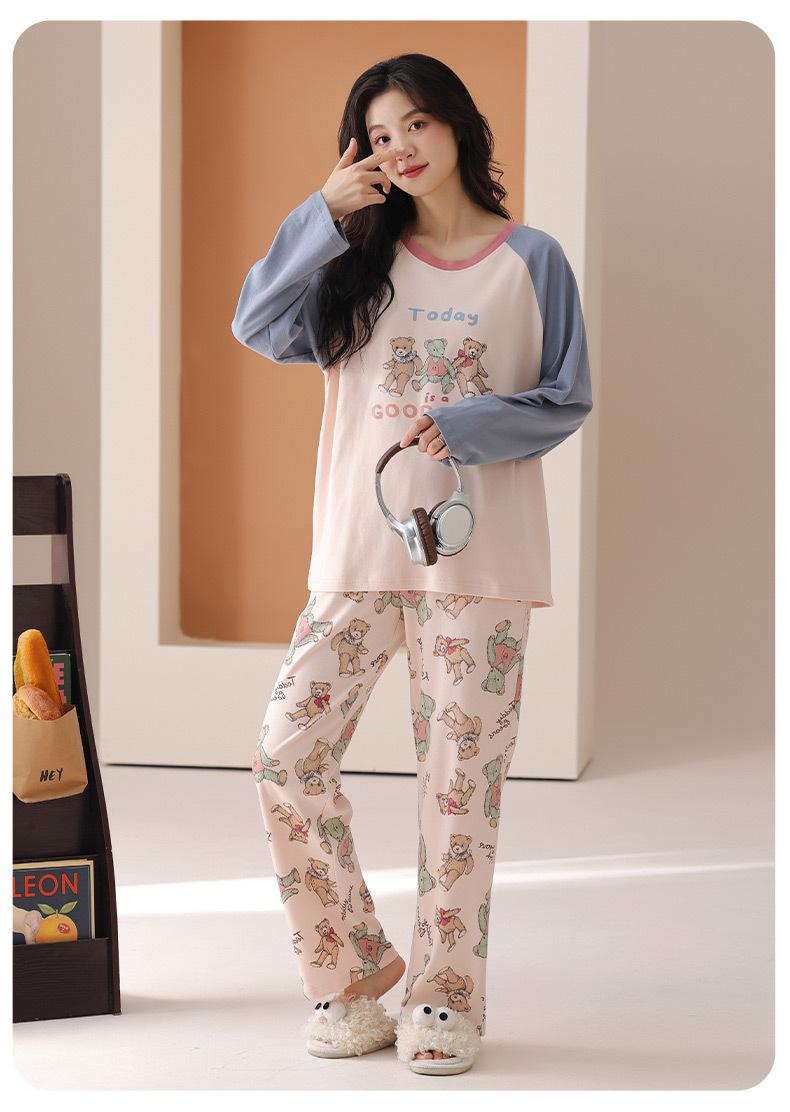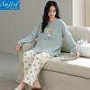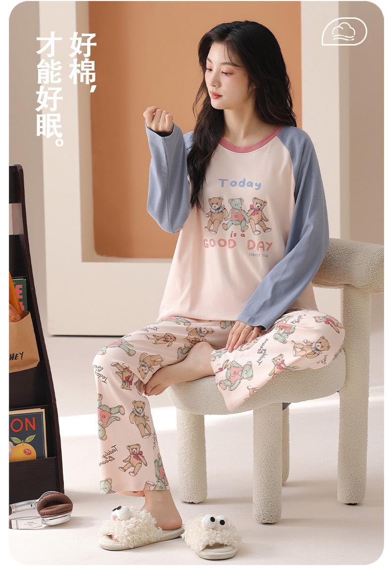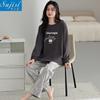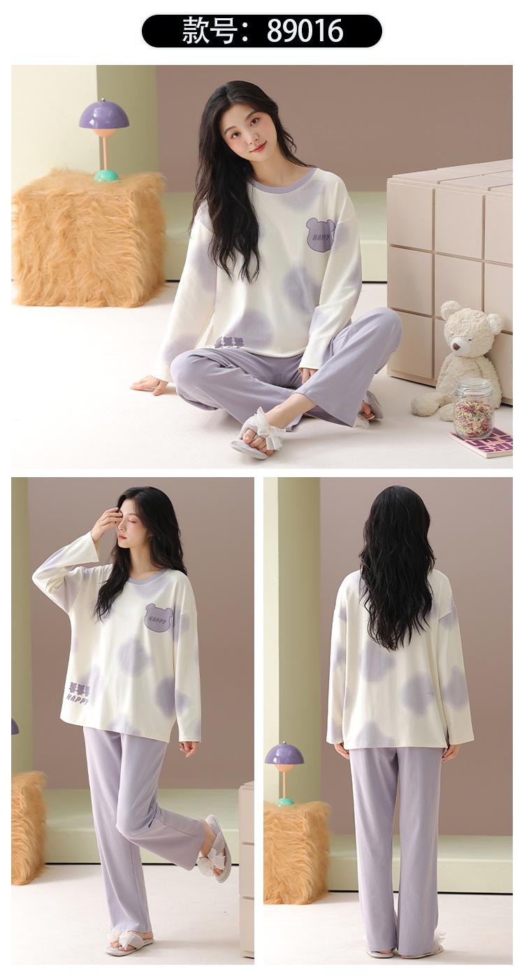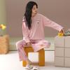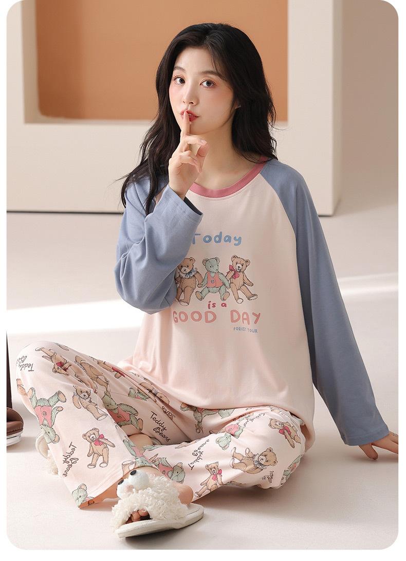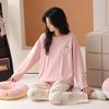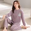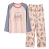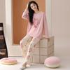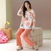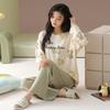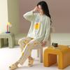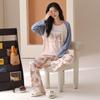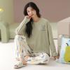 Conjunto de Ropa para el Hogar para Mujer de Estilo Coreano de Primavera y Otoño con Cuello Redondo, Manga Larga de Algodón Puro, Pantalón Largo Estampado Casual para Usar en el Exterior