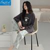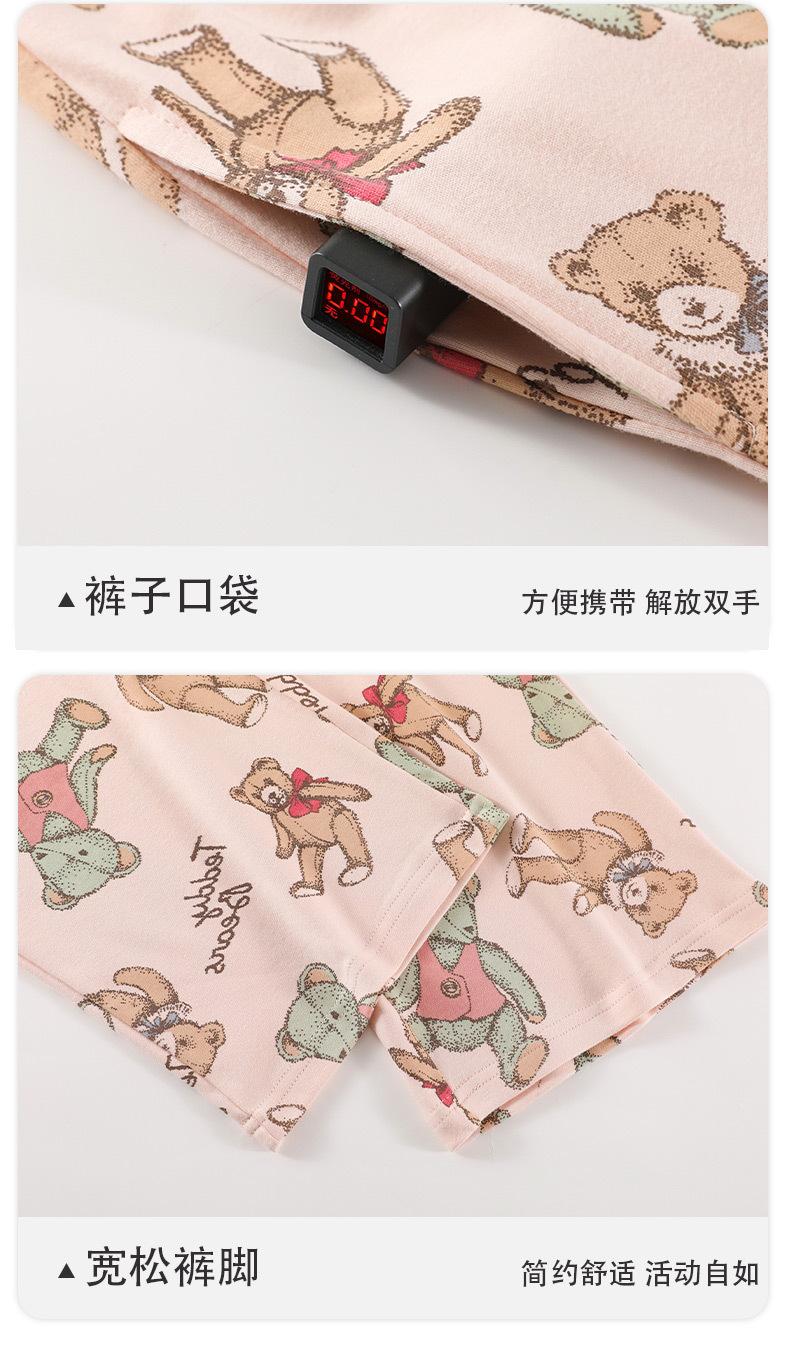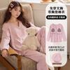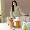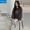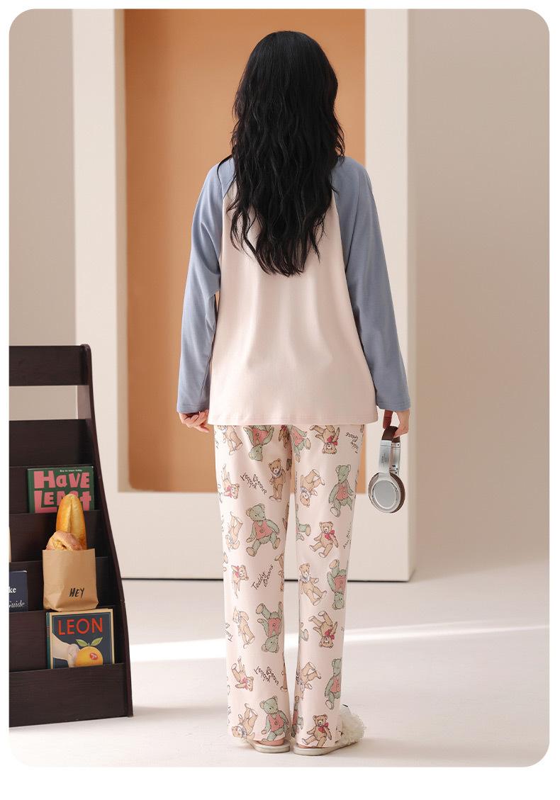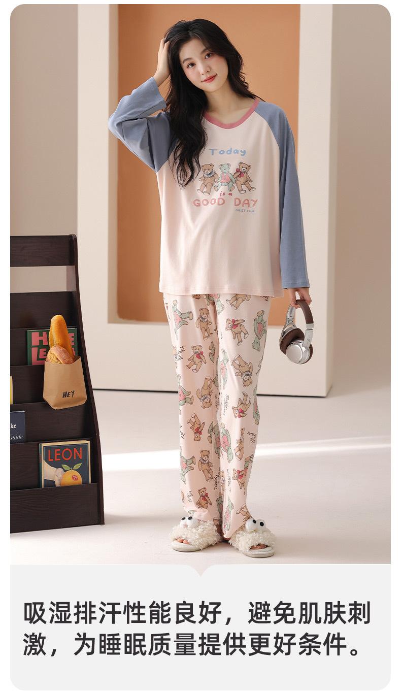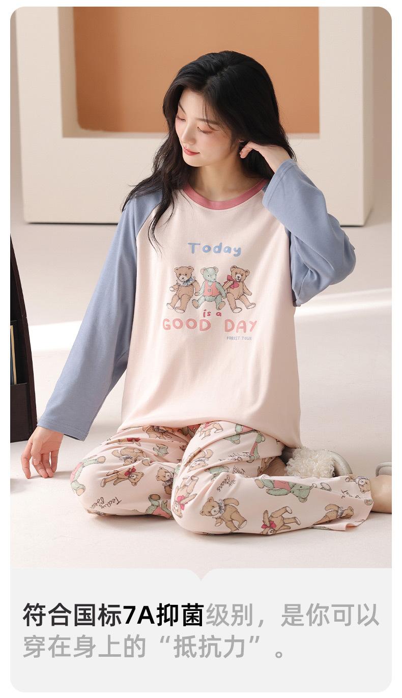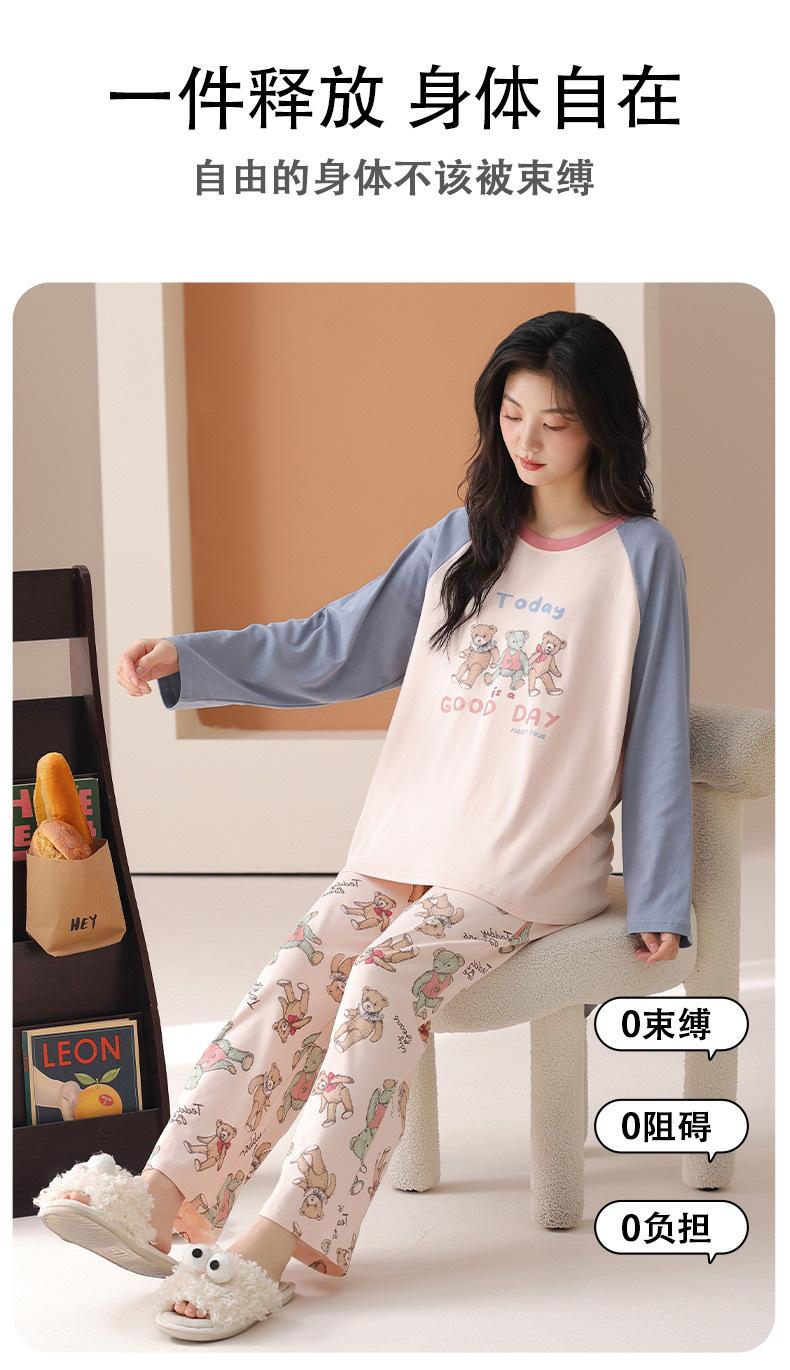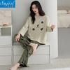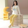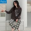Conjunto de Ropa para el Hogar para Mujer de Estilo Coreano de Primavera y Otoño con Cuello Redondo, Manga Larga de Algodón Puro, Pantalón Largo Estampado Casual para Usar en el Exterior