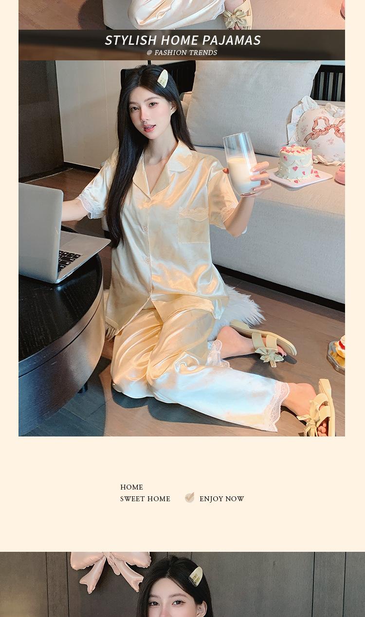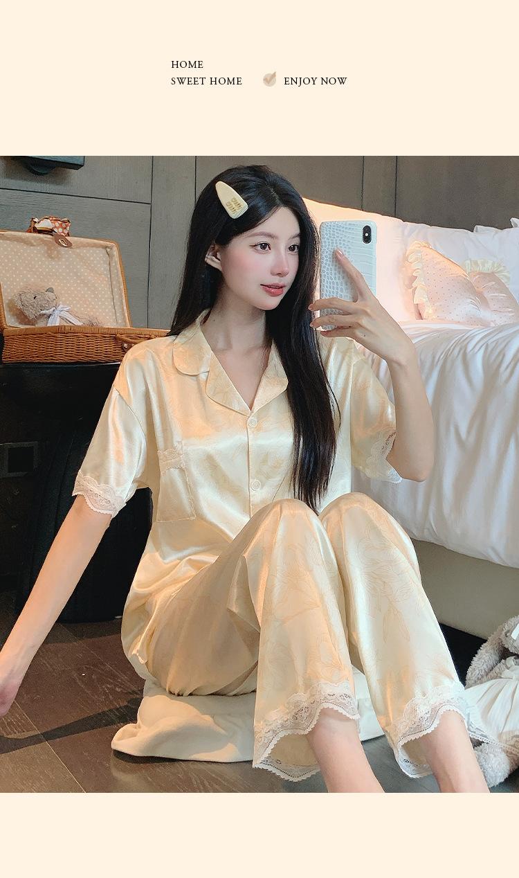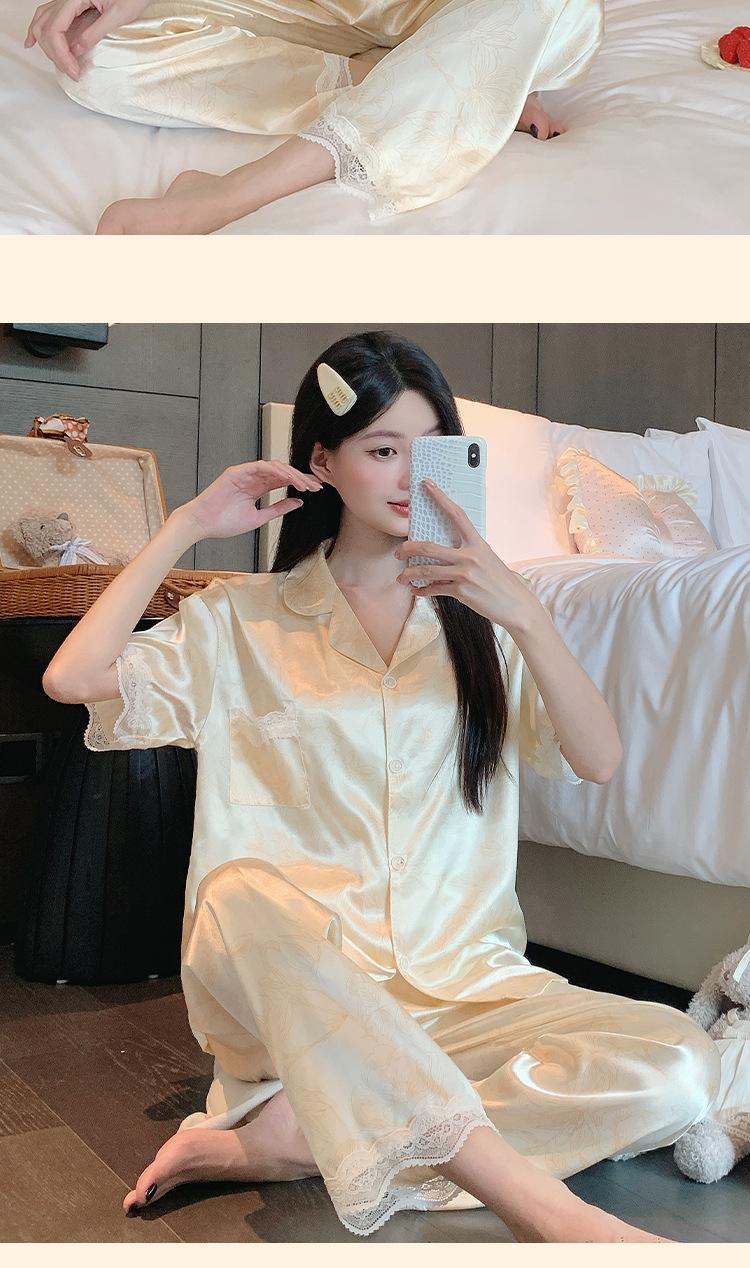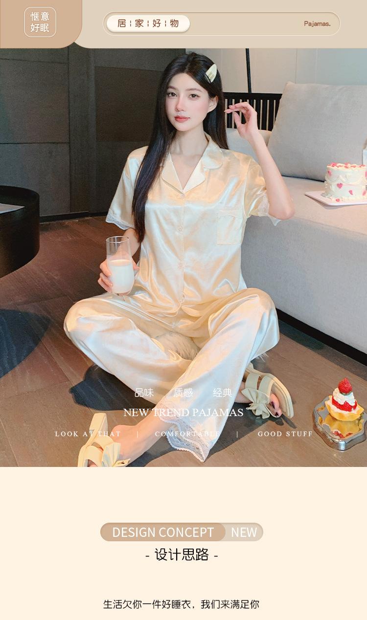 Lujo Ligero Color Sólido Encaje de Alta Gama Lujo Ligero Pijama de Seda Helada para Mujer Verano Manga Corta Pantalón Largo Conjunto de Ropa para el Hogar Venta al por Mayor