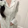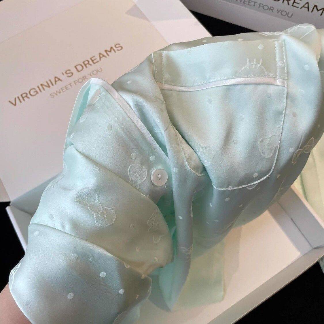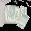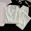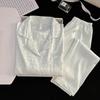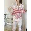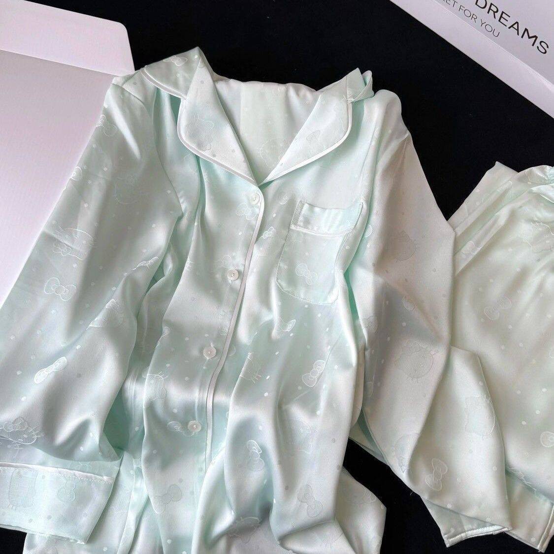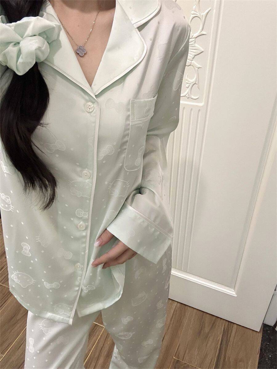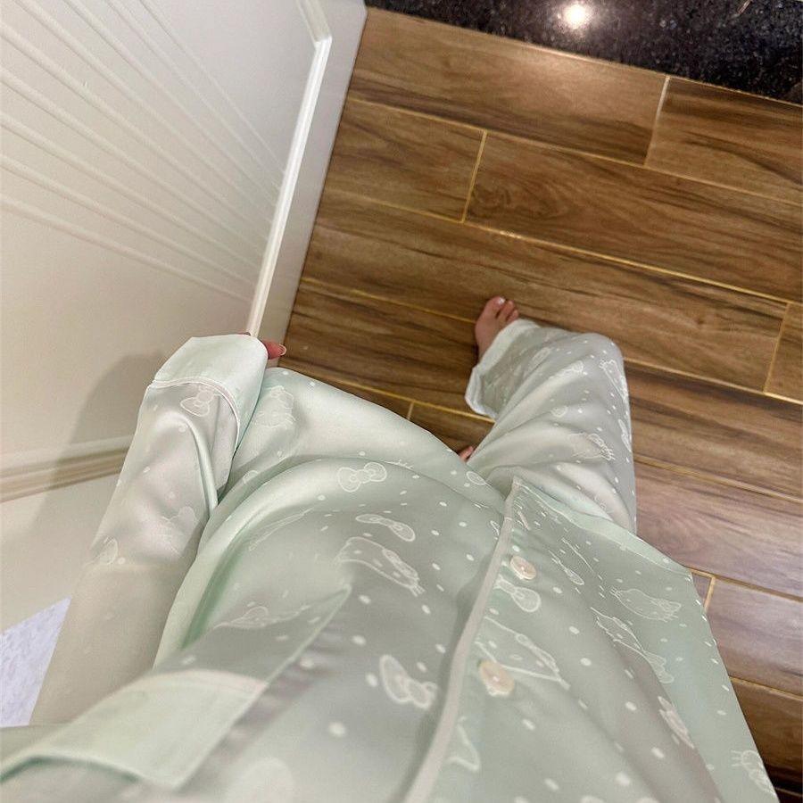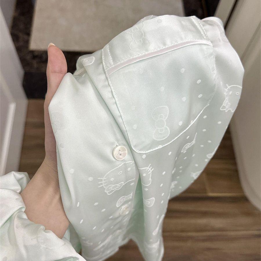 Pijama Casual de Primavera y Otoño para Mujer Verano Jacquard Seda Helada Gato de Dibujos Animados Cárdigan Manga Larga Pantalones Conjunto Ropa para el Hogar Mujer