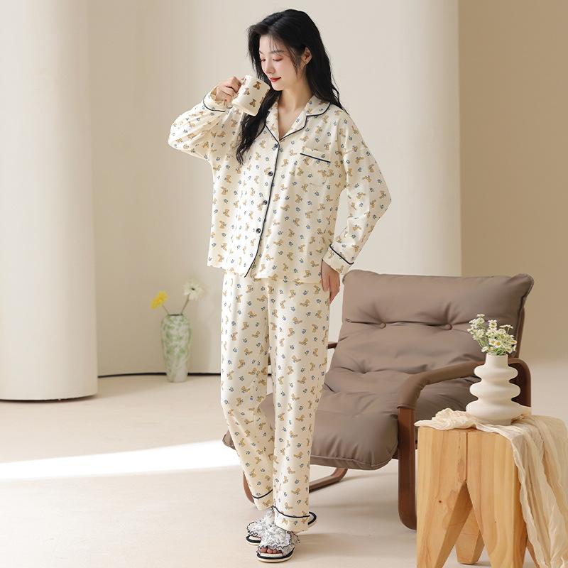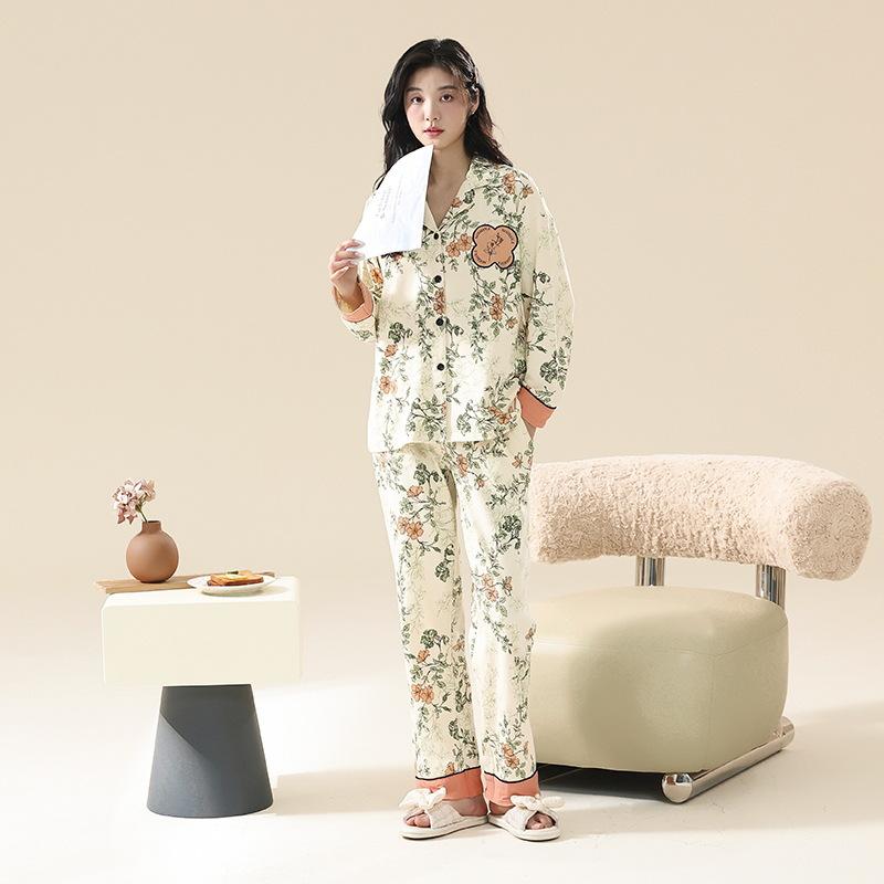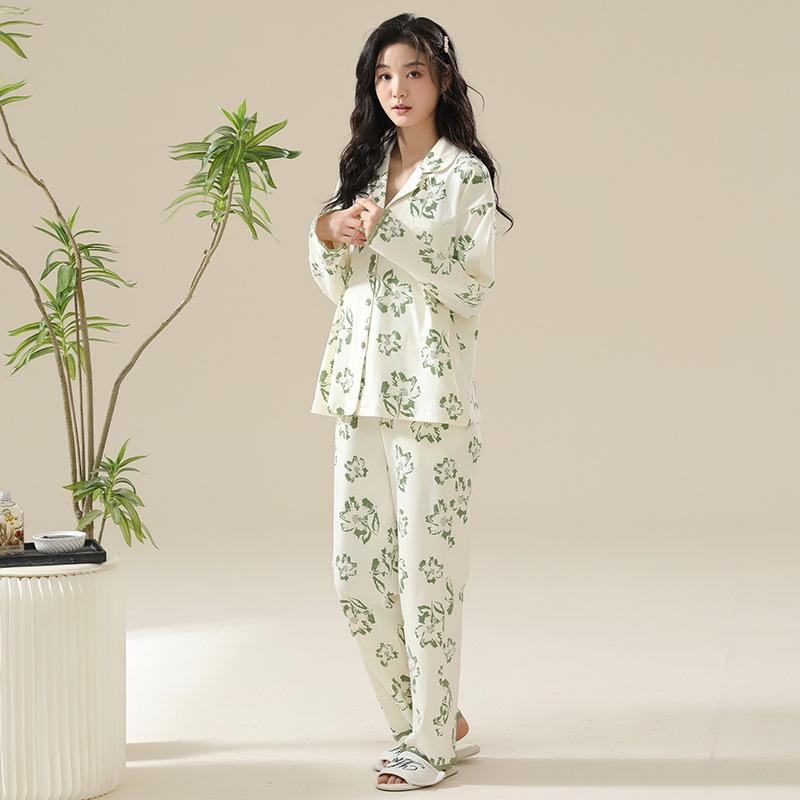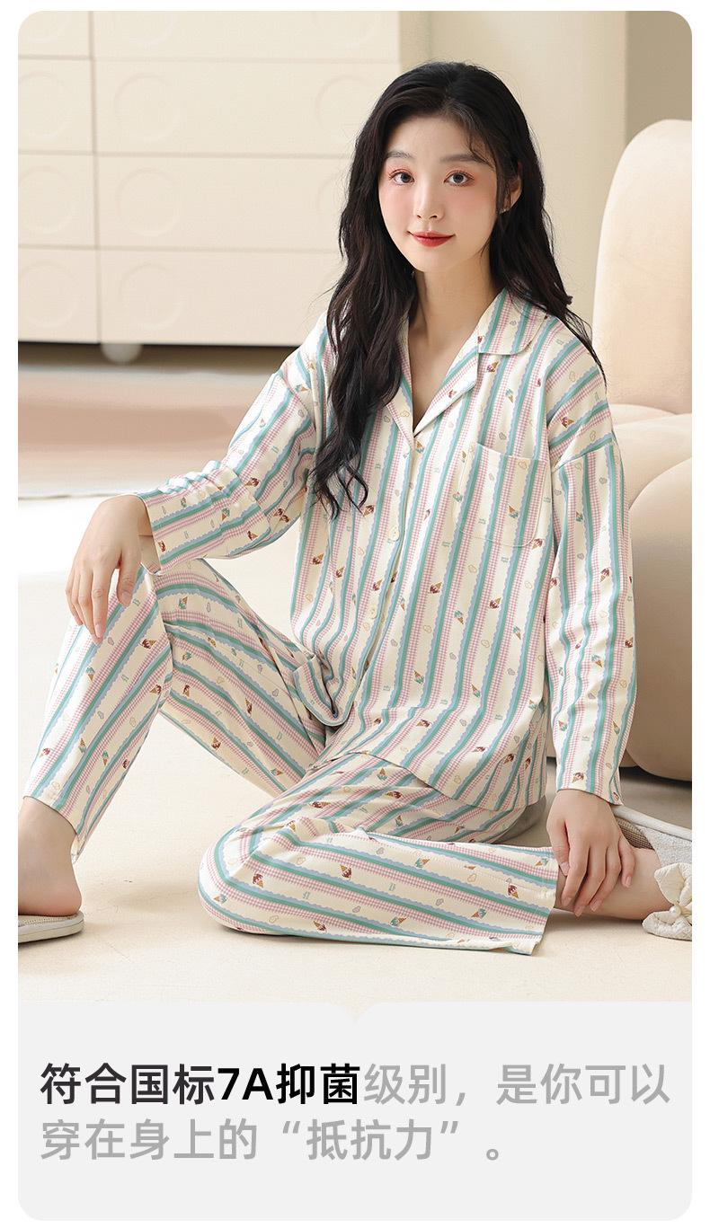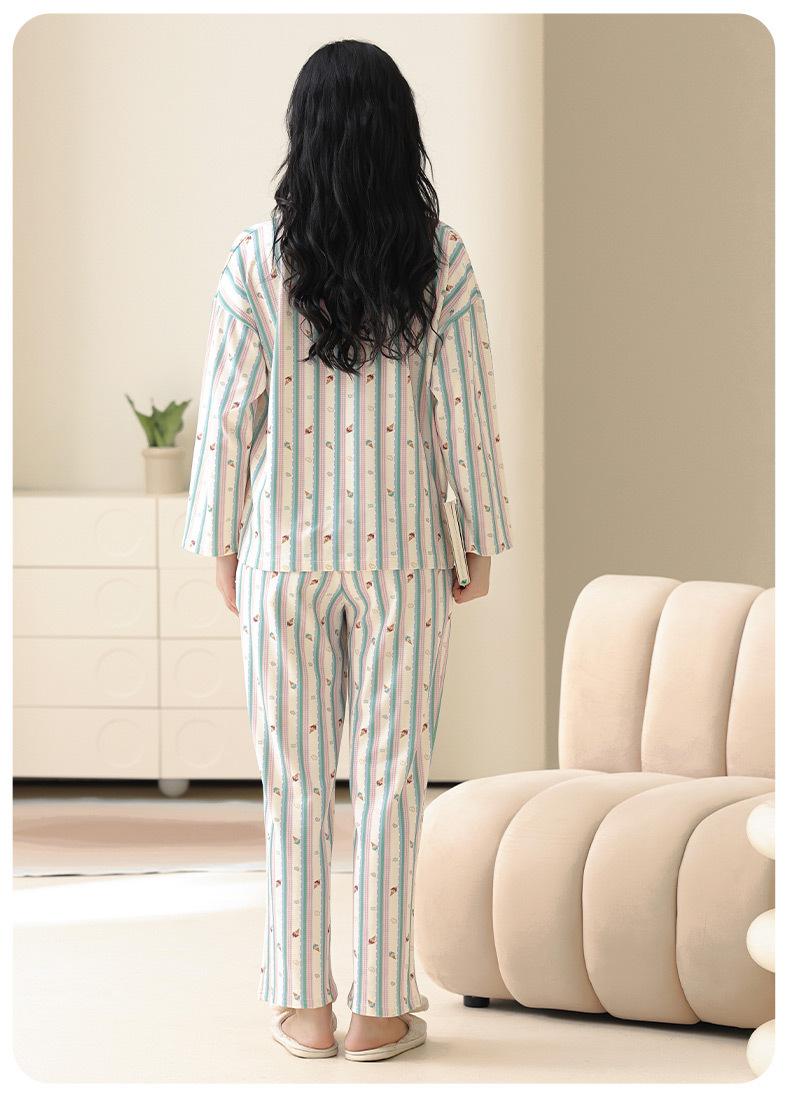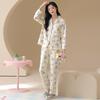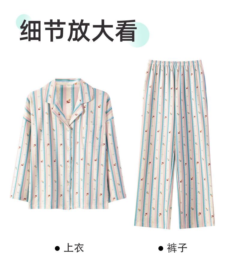 Pijama de Algodón Puro para Mujer Primavera y Otoño Manga Larga Antibacteriano Antiácaros Suave Cárdigan Holgado Dulce Se Puede Usar Fuera Conjunto Ropa para el Hogar
