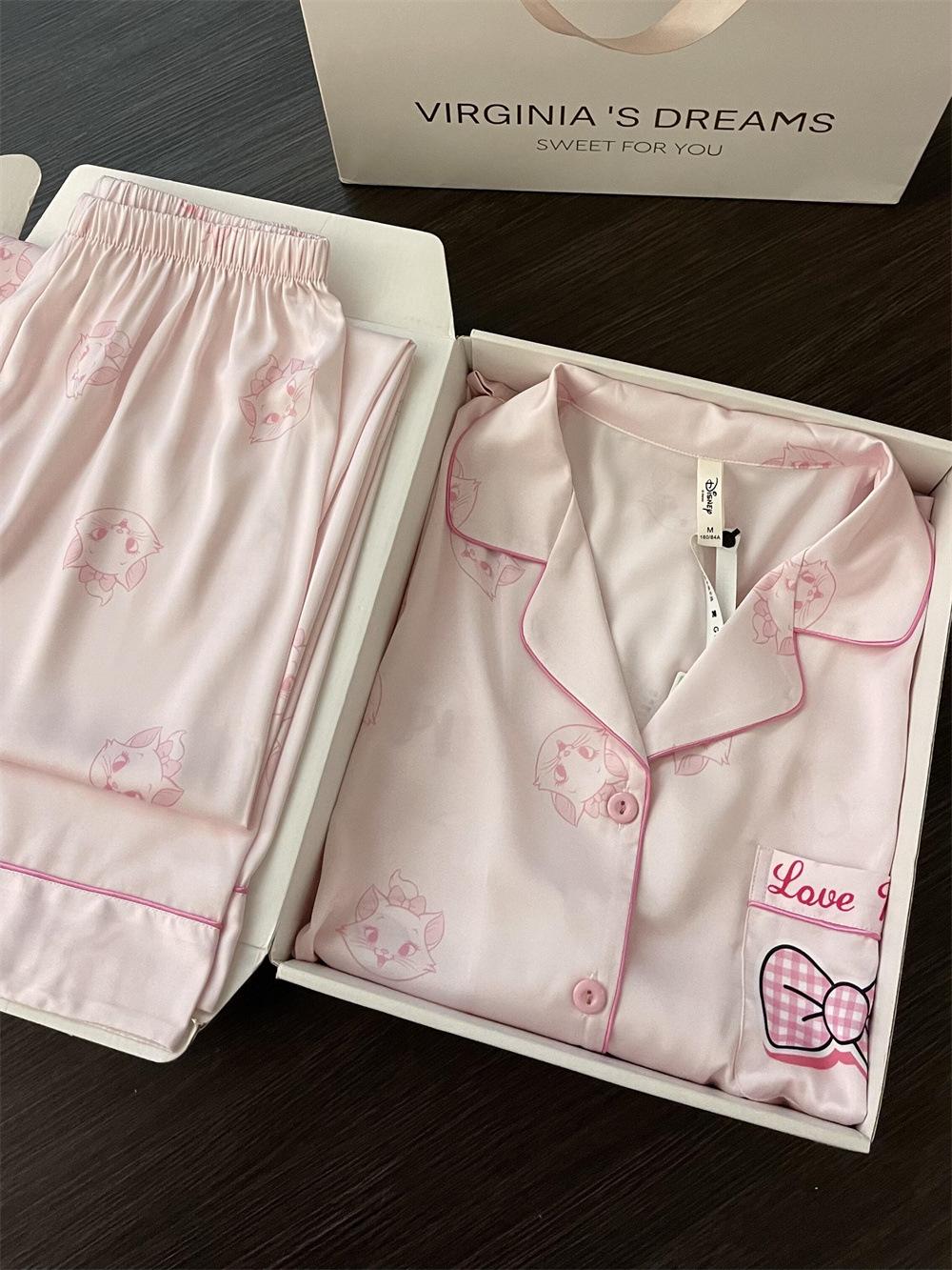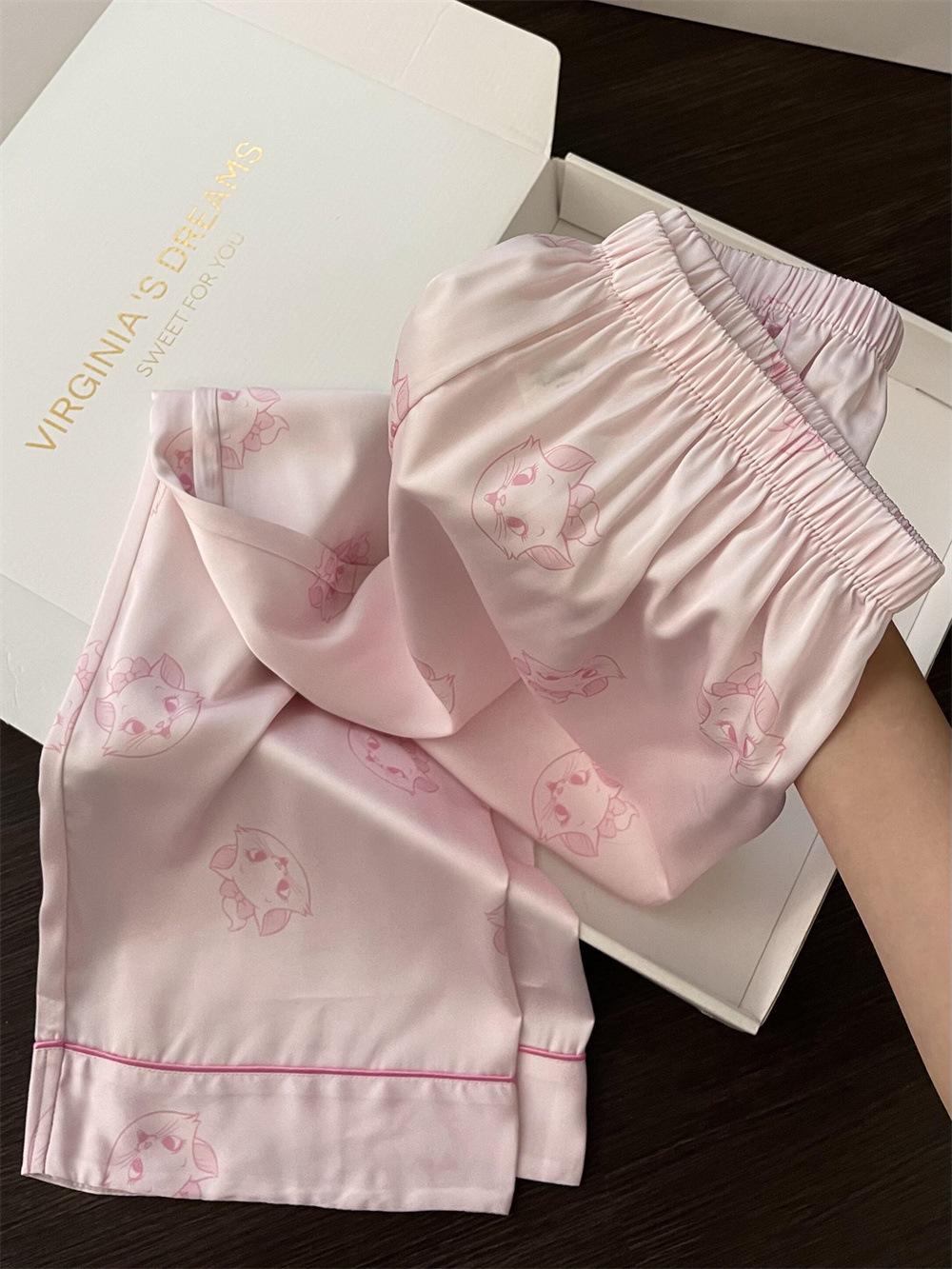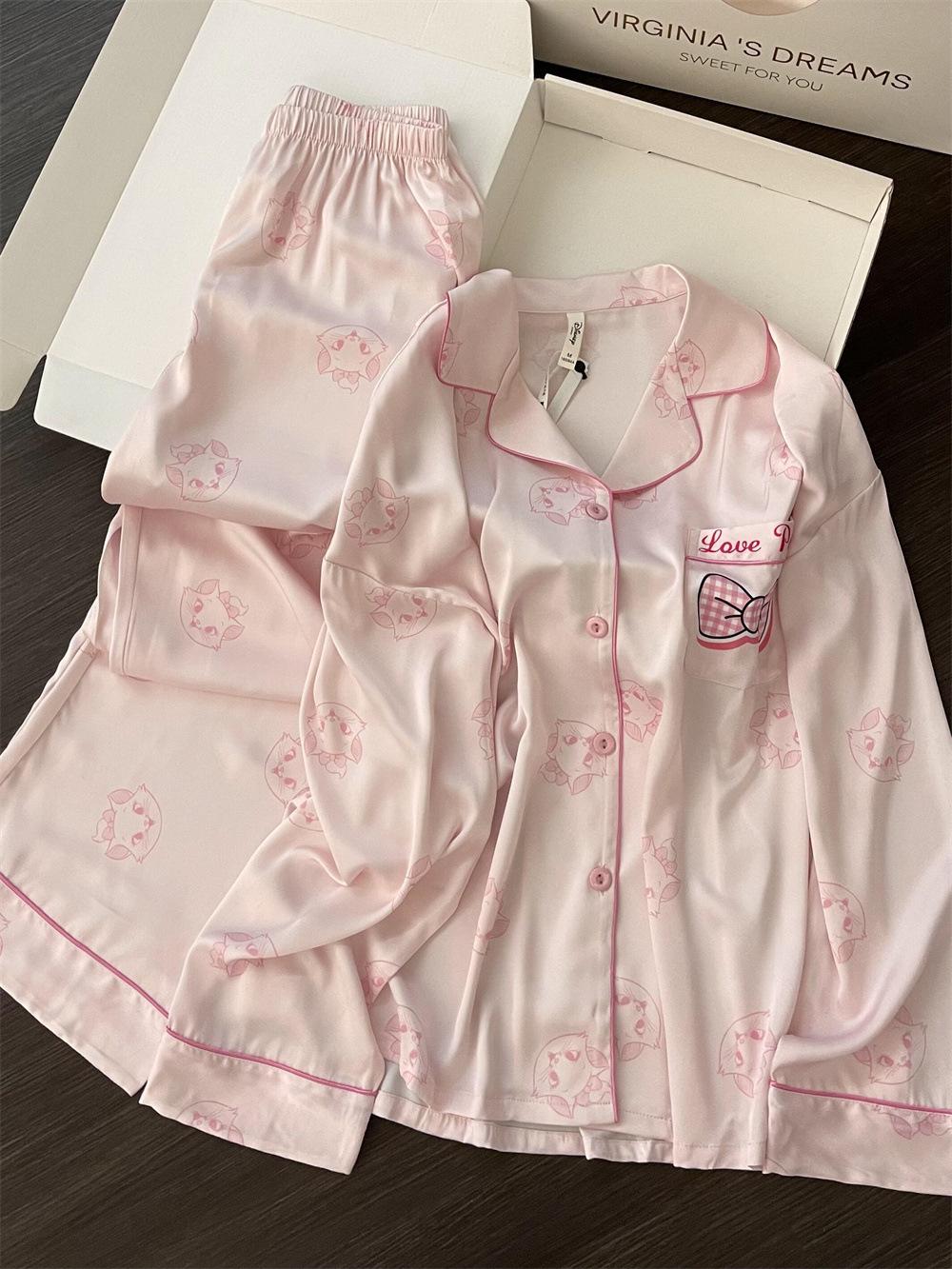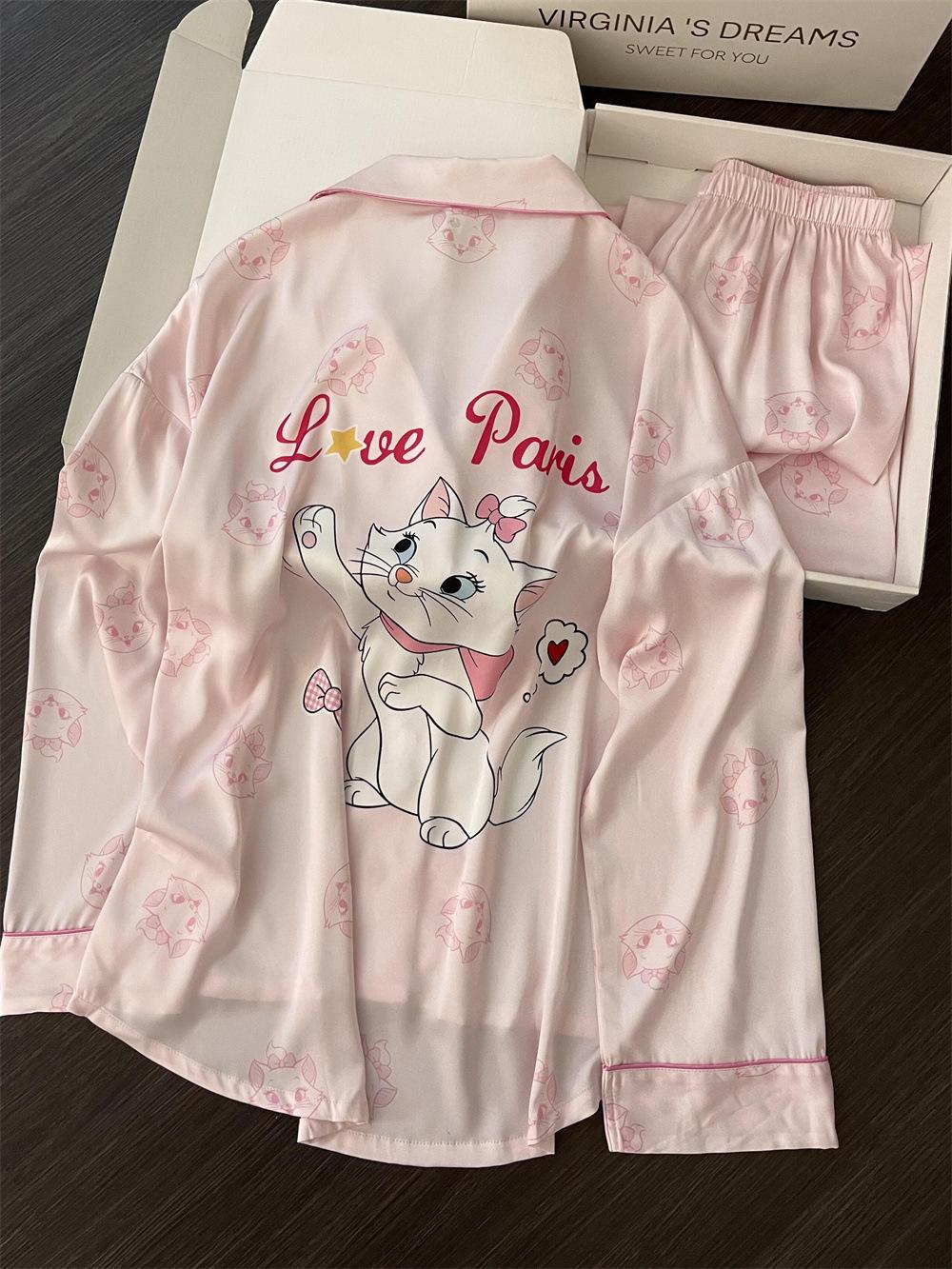 Pijama Rosa para Niña con Estampado de Lindo Gatito para Mujer Otoño Nuevo Seda Helada Manga Larga Pantalón Largo Conjunto para Estar en Casa
