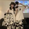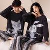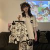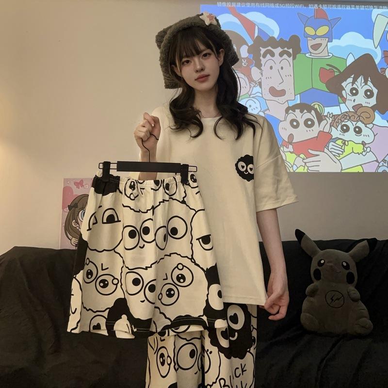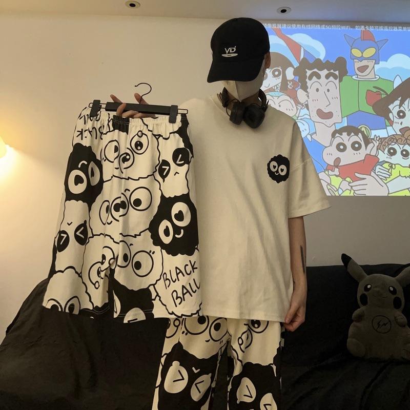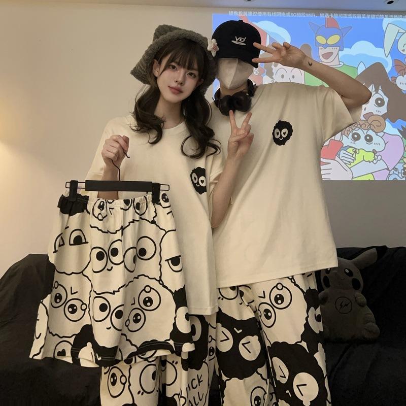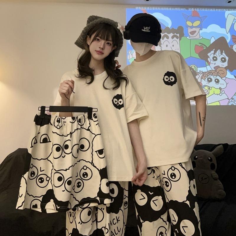 Pijamas de pareja al por mayor en stock, pijamas de mujer con dibujos animados de bolas de carbón, ropa holgada para el hogar de primavera y otoño, conjunto de tres piezas de manga corta y cuello redondo para hombre para verano.