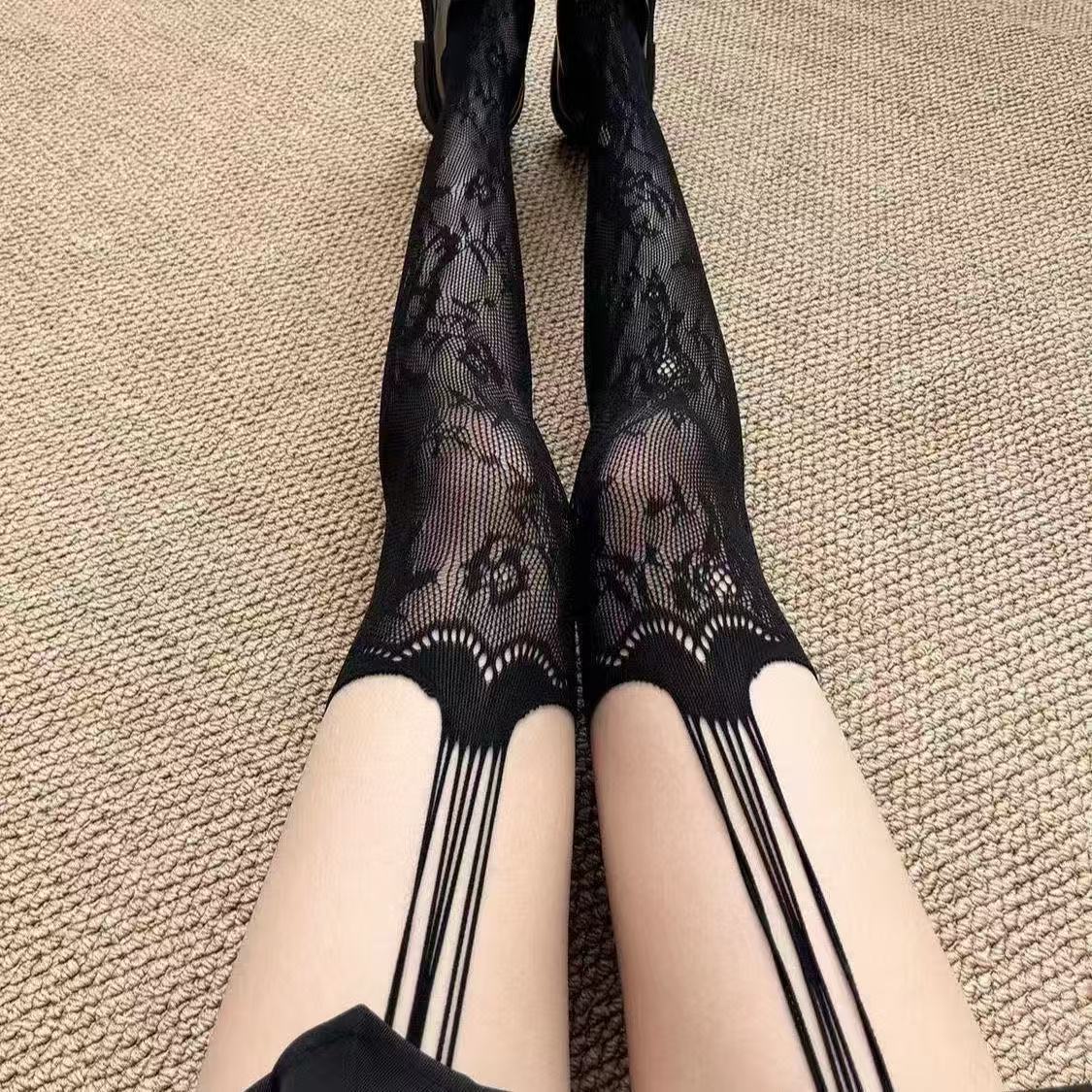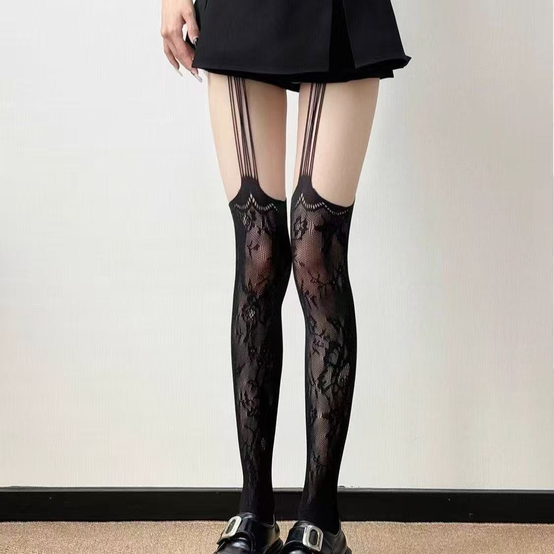 Sexy chica caliente medias de encaje con liguero negro personalidad subcultura patrón calado largas sobre la rodilla y2k calcetines de red