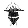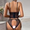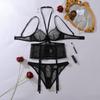Estilo Caliente Europeo y Americano Encaje de Pestañas Negro de Alta Resistencia Transparente Ajustado Cuello Halter Lencería Sexy de Tres Puntos Conjunto Separado