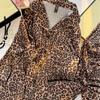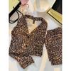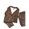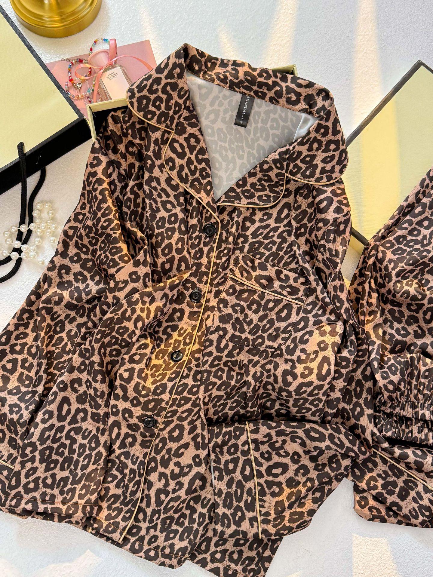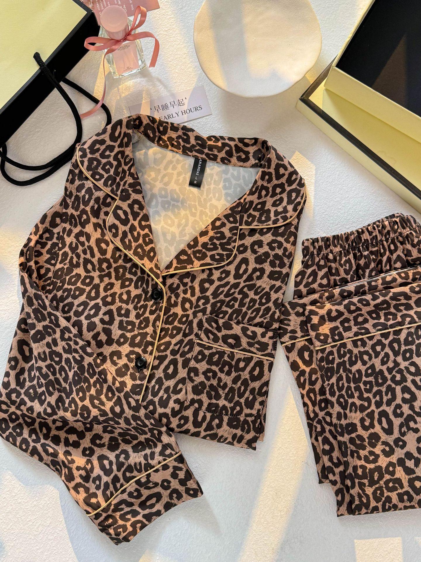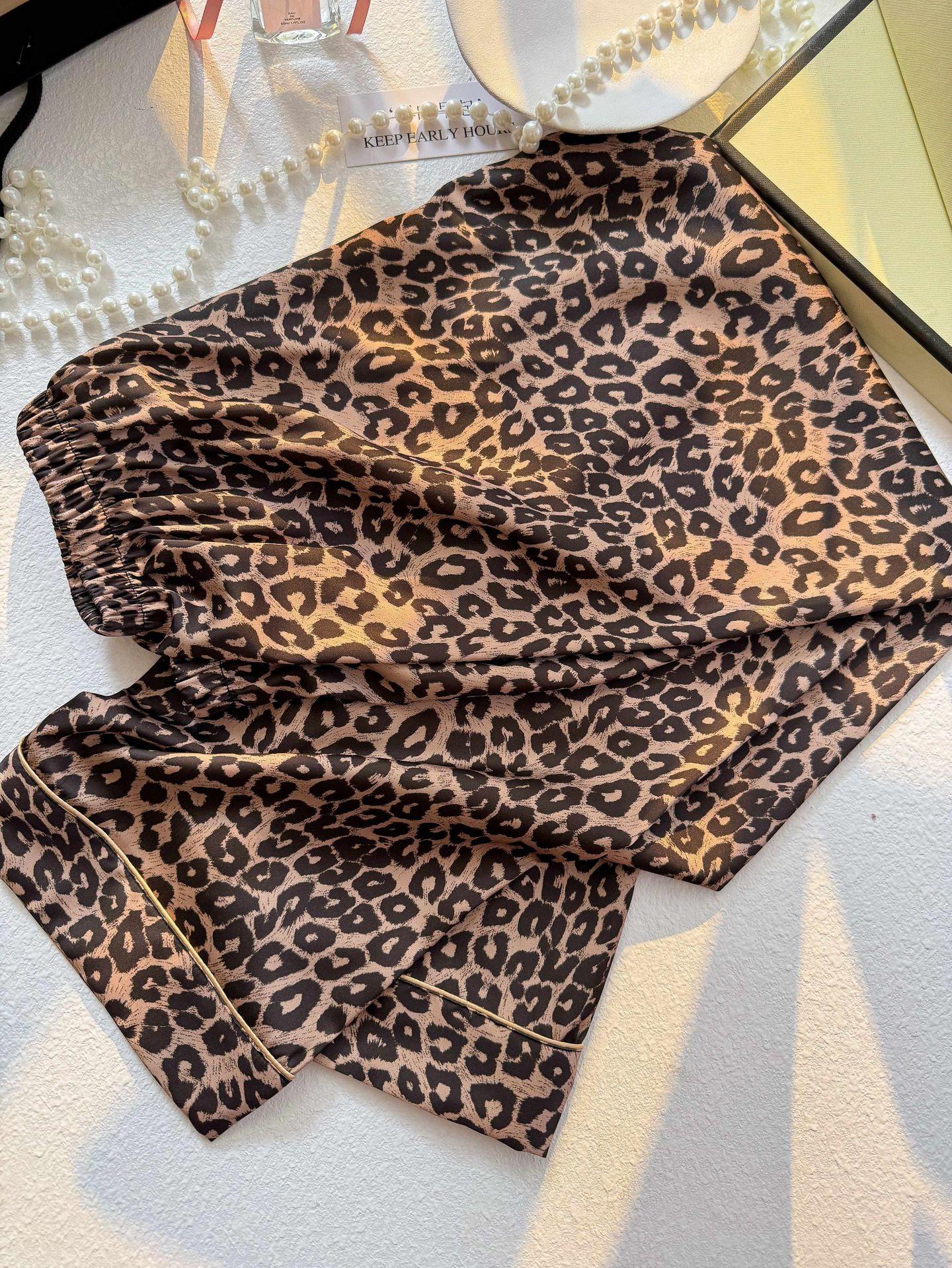 2025 Nuevo Pijama Negro y Dorado con Estampado de Leopardo V para Mujer Seda Sintética Fino Manga Corta Pantalón Largo Estilo Lujo Ligero Ropa Casual para el Hogar