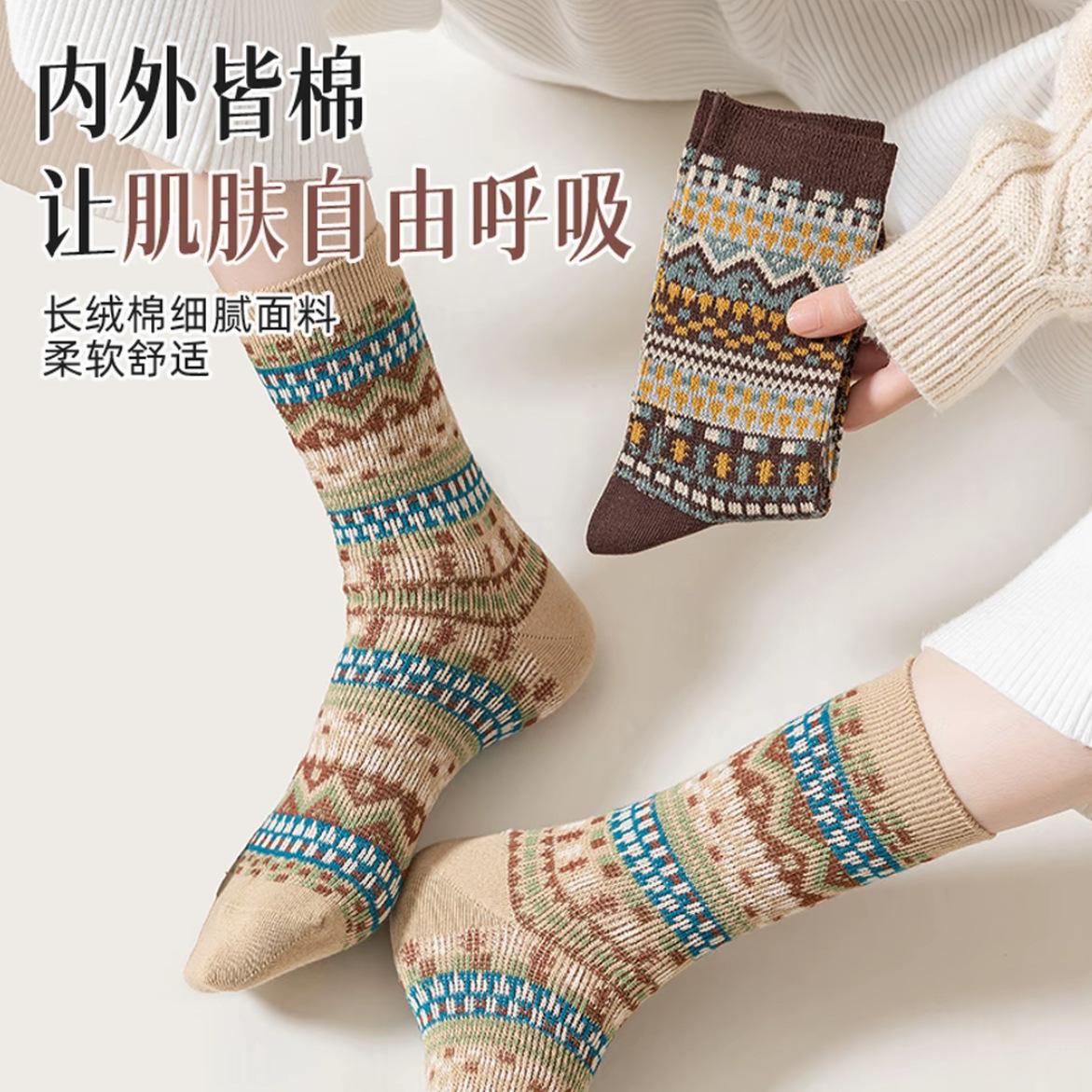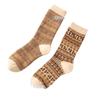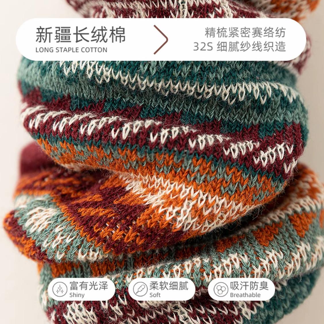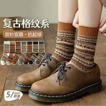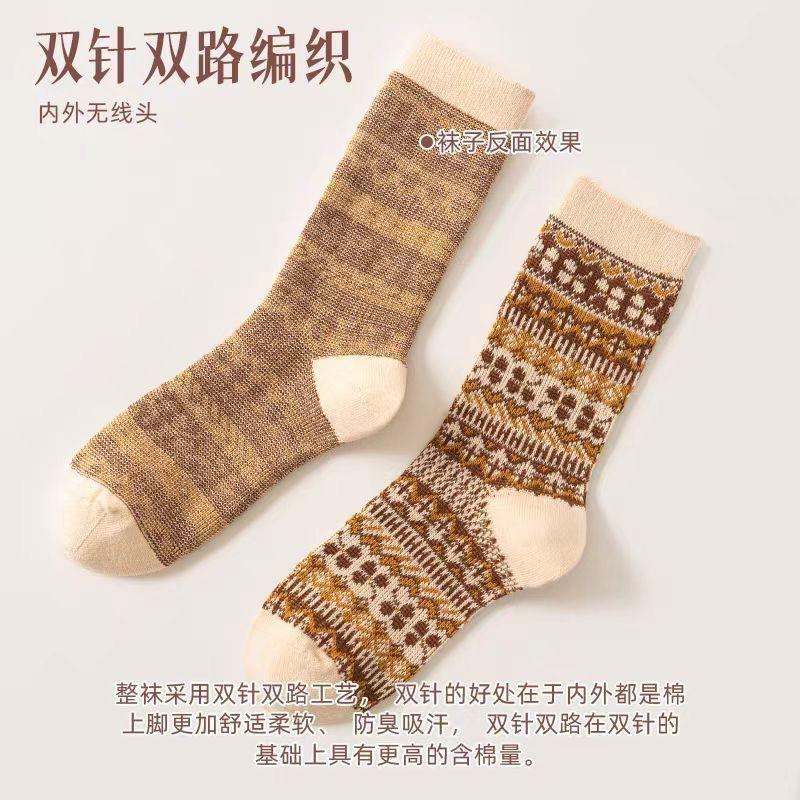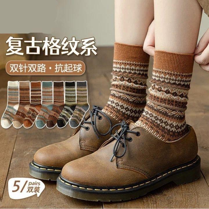 Calcetines de doble aguja y doble camino de estilo étnico retro para mujer otoño e invierno calcetines de pila modernos literarios a cuadros nórdicos largos de algodón
