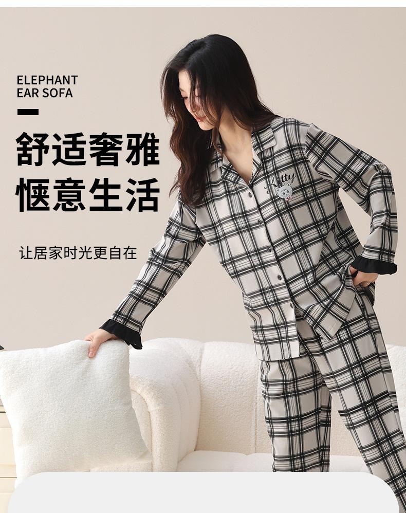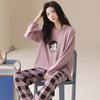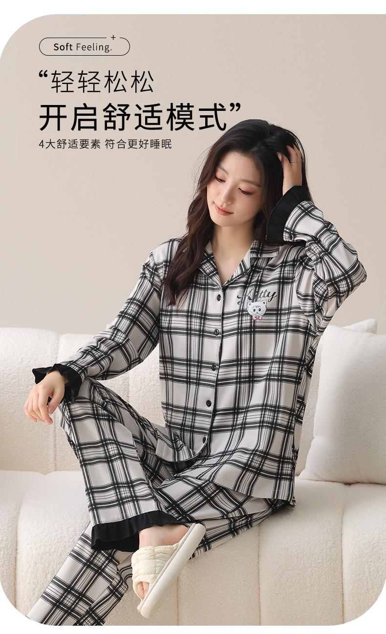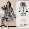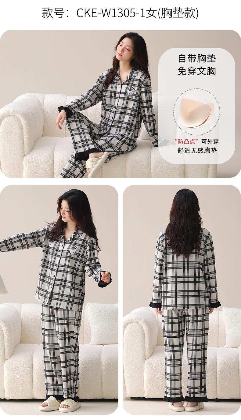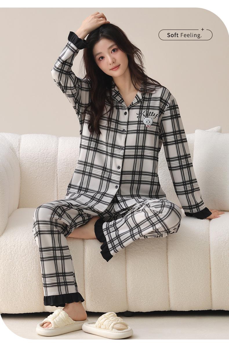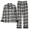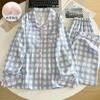 Pijama Estilo Coreano Otoño Simple Cuadros Dulce Casual Encaje Pesado Manga Larga para Mujer con Almohadilla en el Pecho Set de Ropa para el Hogar