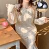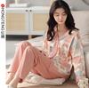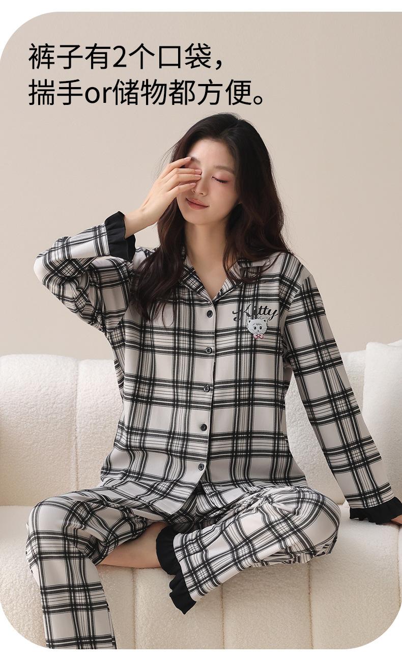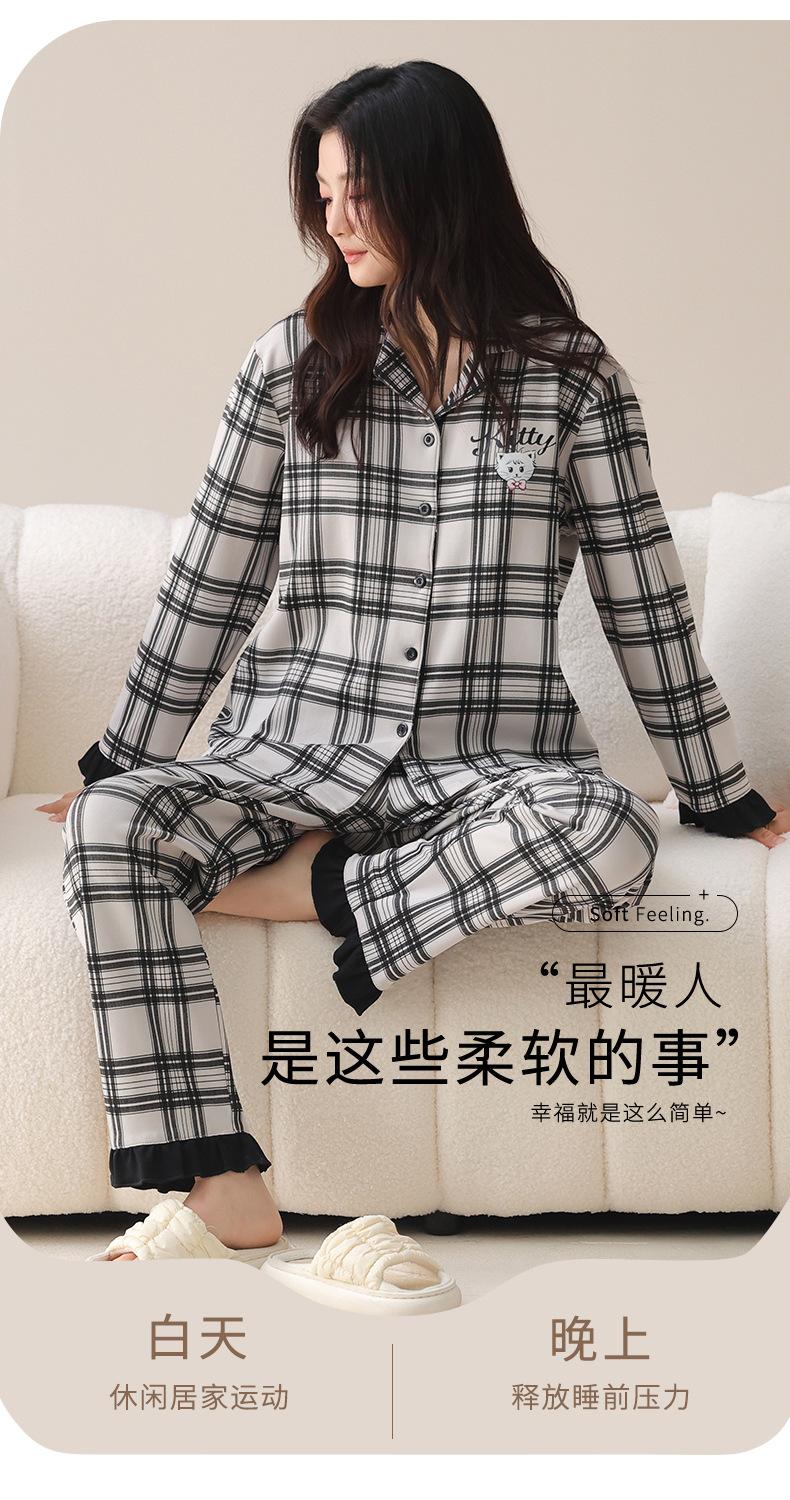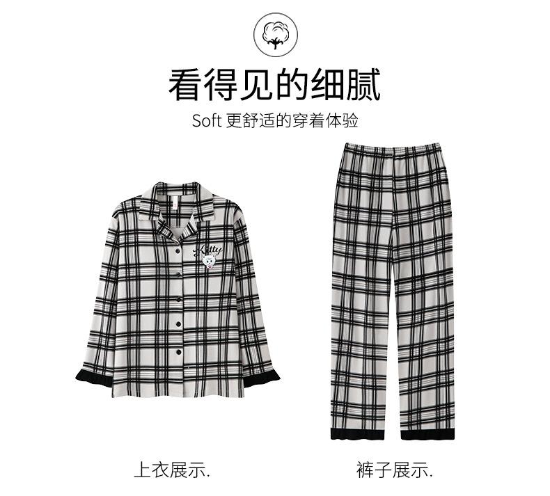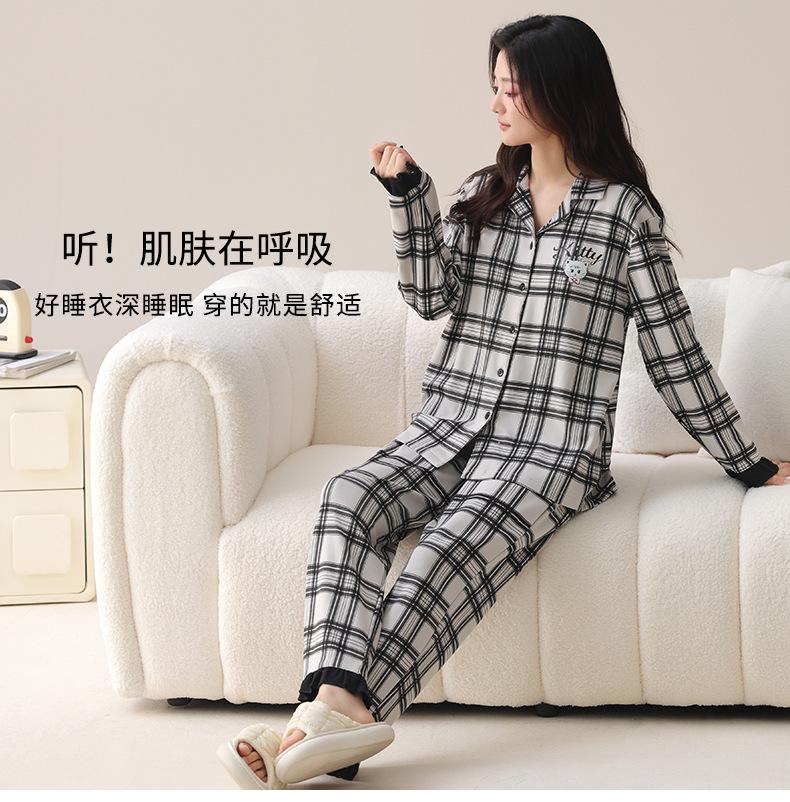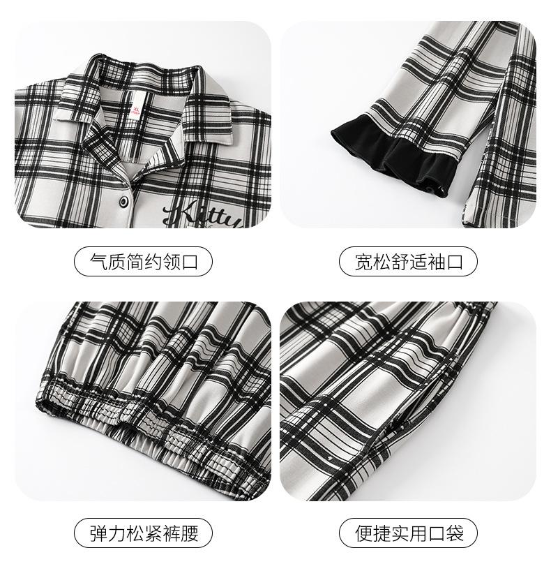 Pijama Estilo Coreano Otoño Simple Cuadros Dulce Casual Encaje Pesado Manga Larga para Mujer con Almohadilla en el Pecho Set de Ropa para el Hogar