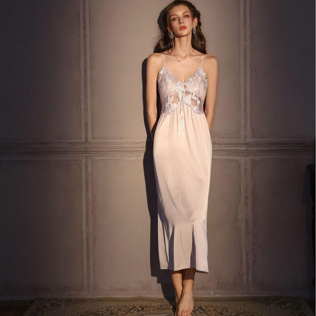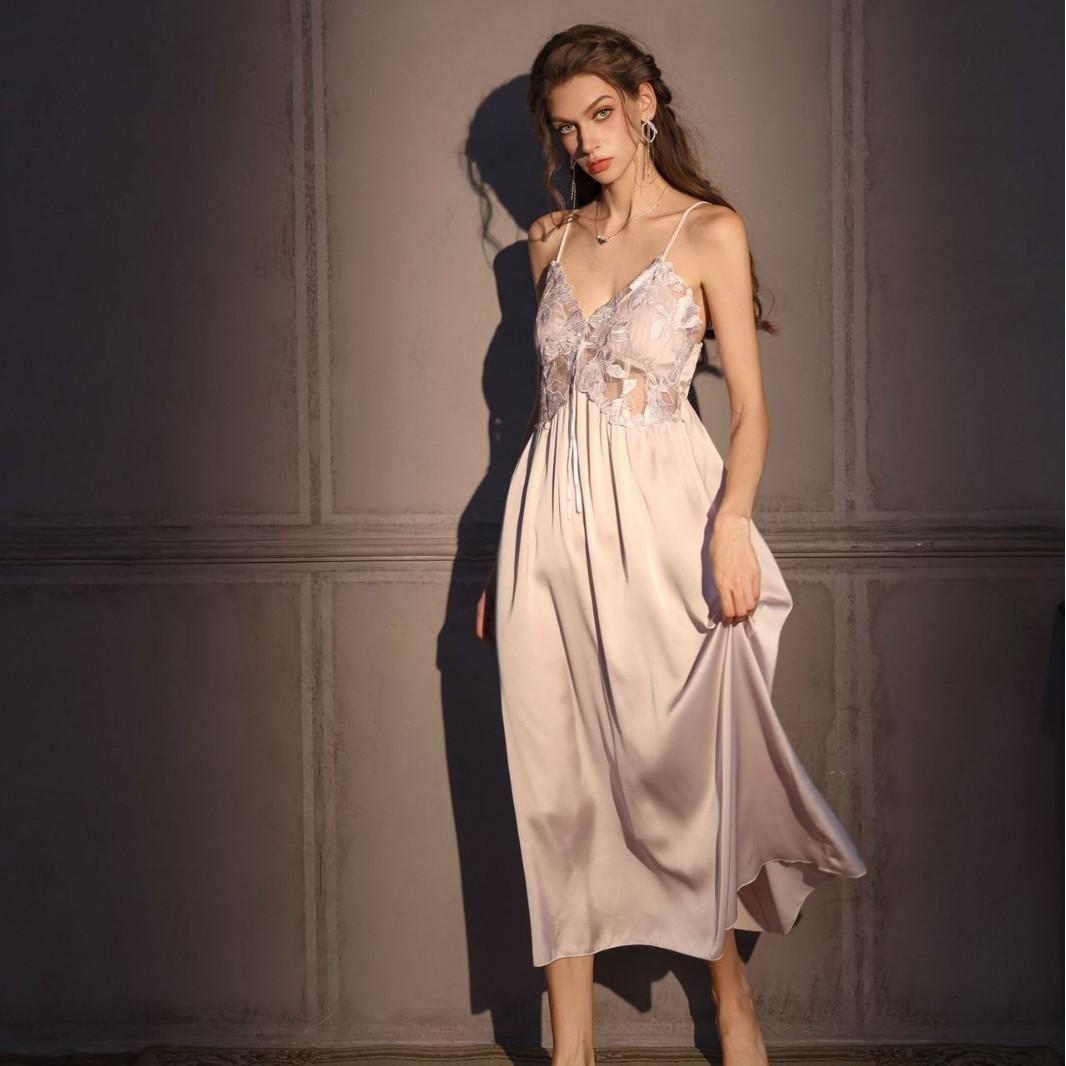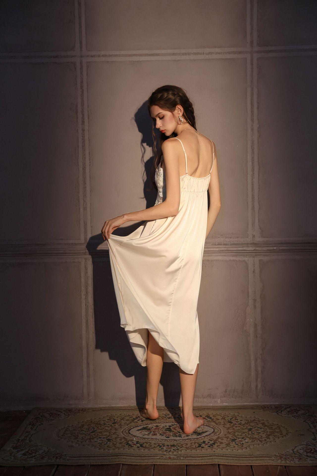Pijamas Sexy para Mujer Seda de Hielo Delgada con Almohadilla en el Pecho Camisola Francesa Camisón Estilo Largo Magnolia Estilo Deseo Puro Ropa para el Hogar