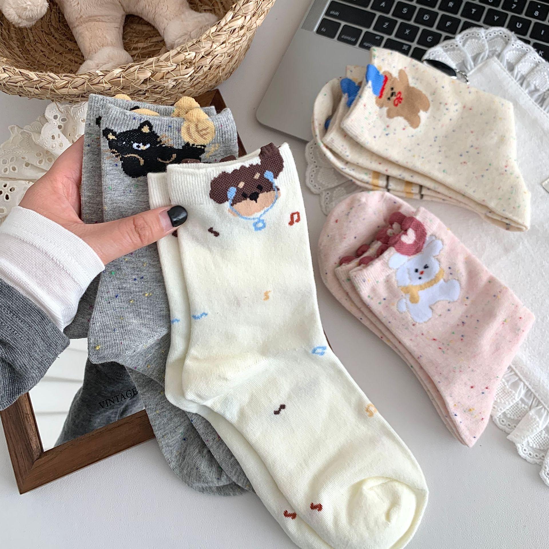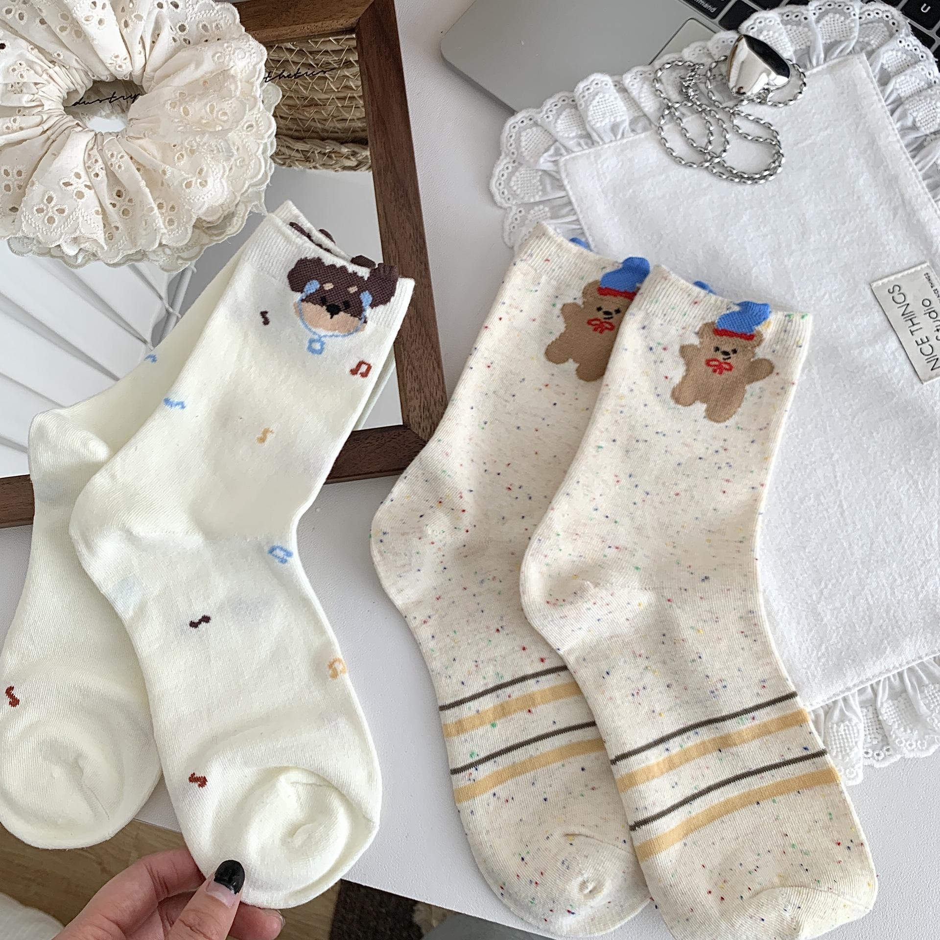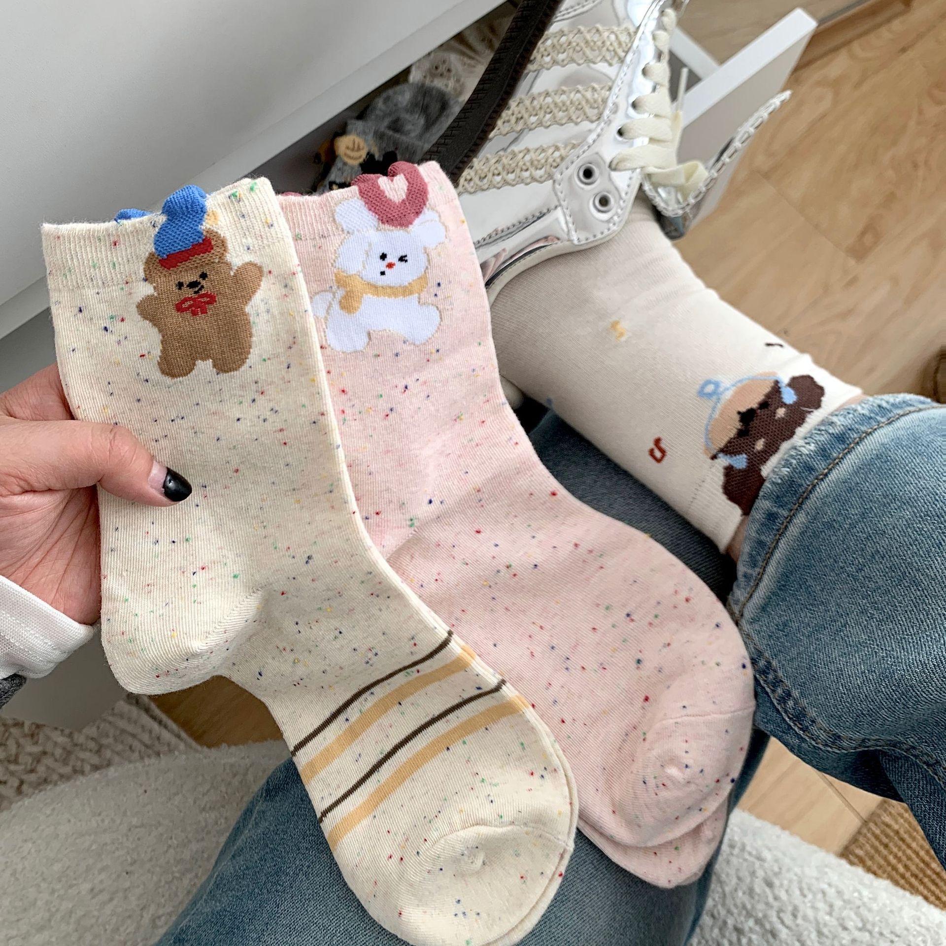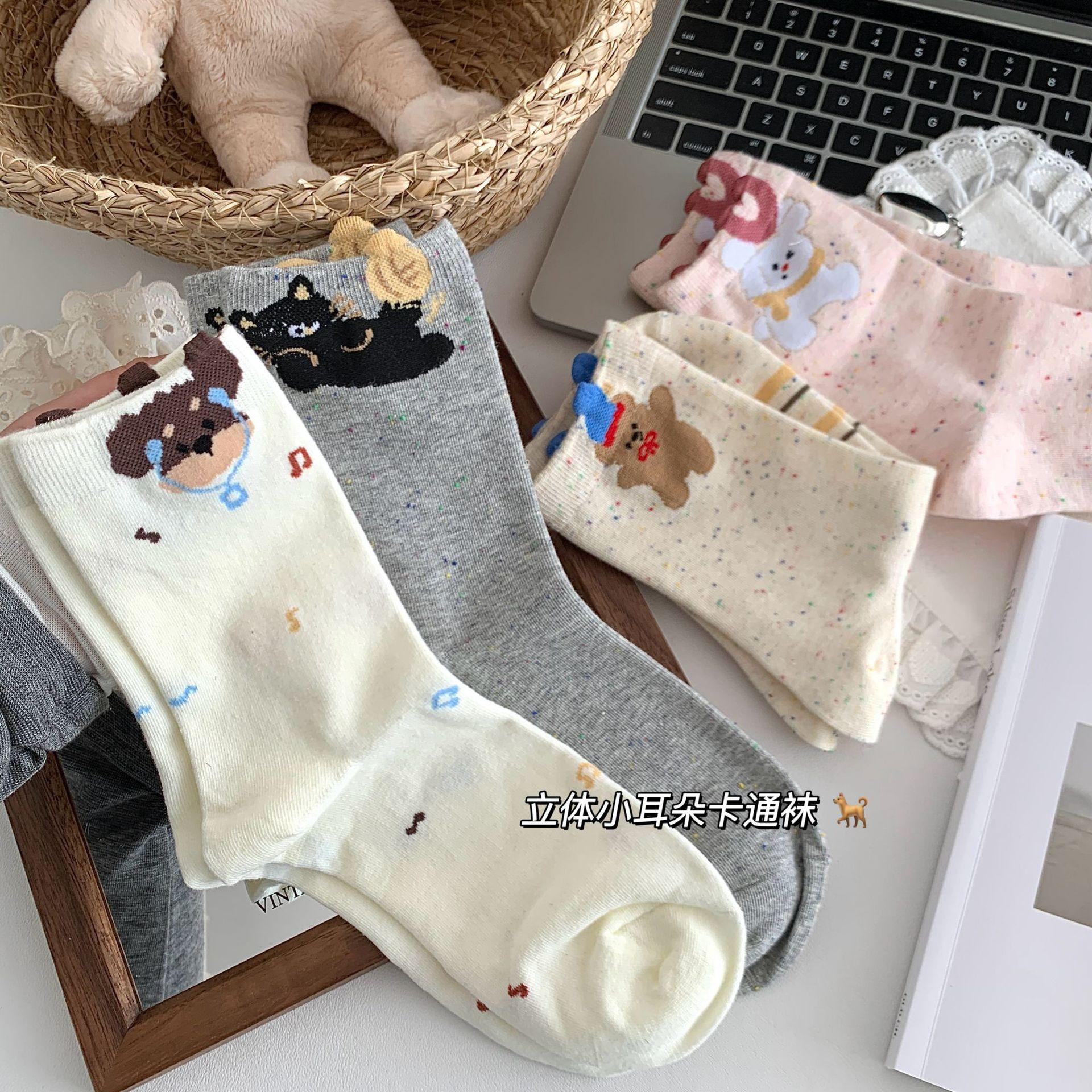 Calcetines de Mujer Primavera y Verano Nueva Llegada Hilado de Lunares Calcetines de Algodón de Tubo Medio para Mujer Ins Trendy Lindo Dibujo Animado Estilo Japonés Oreja Tridimensional Oso