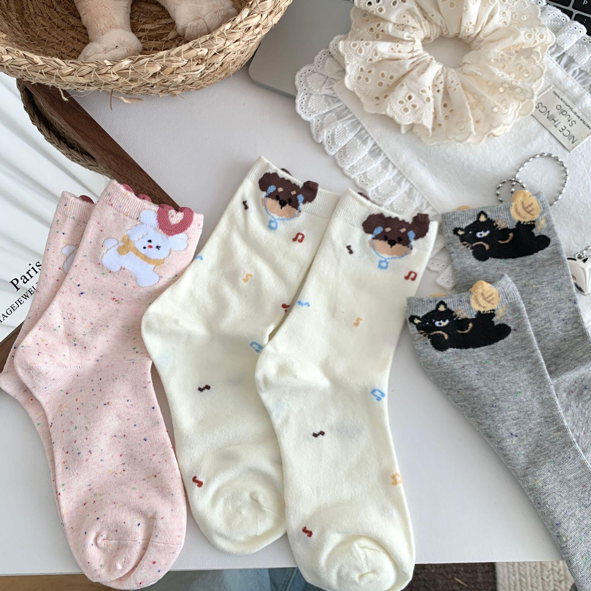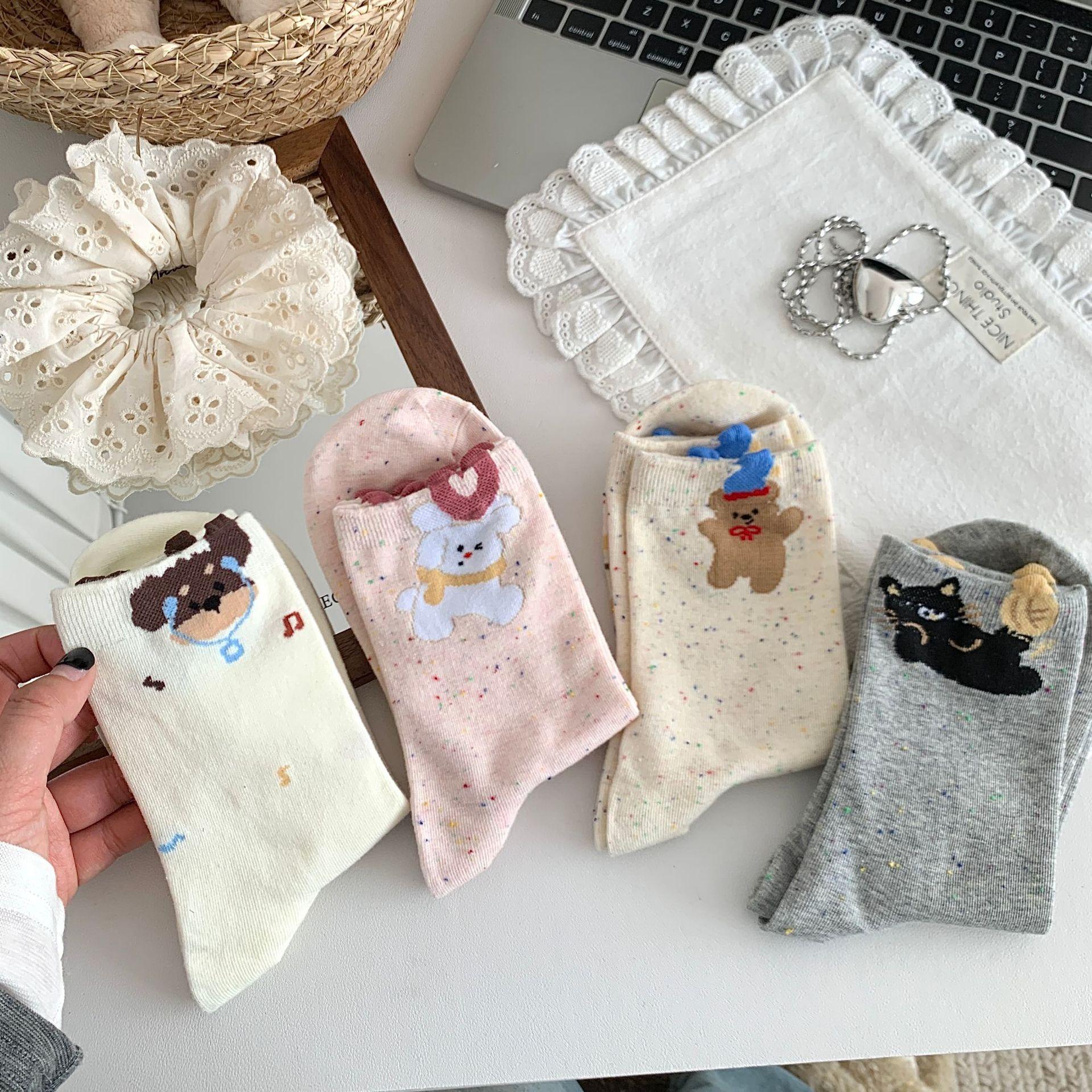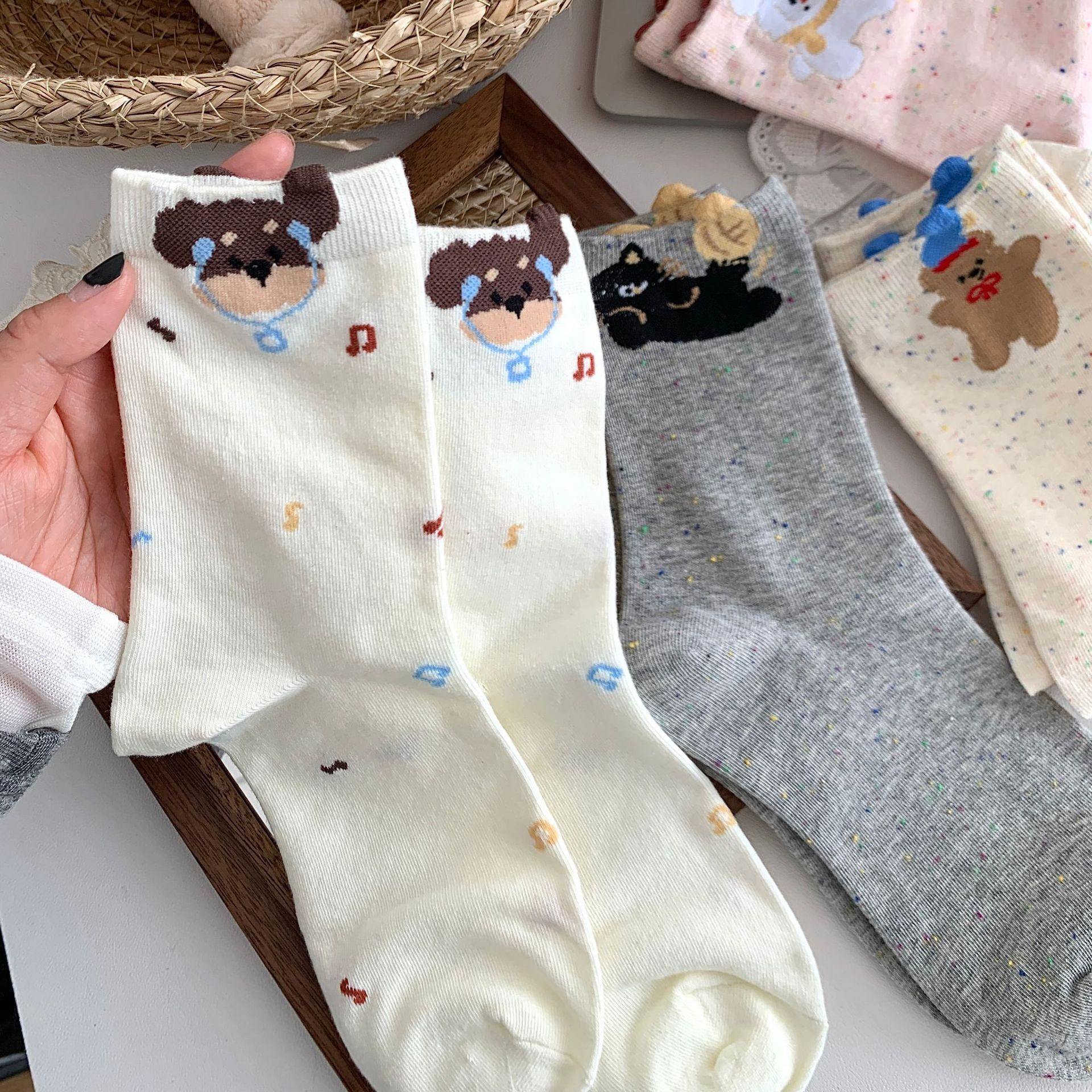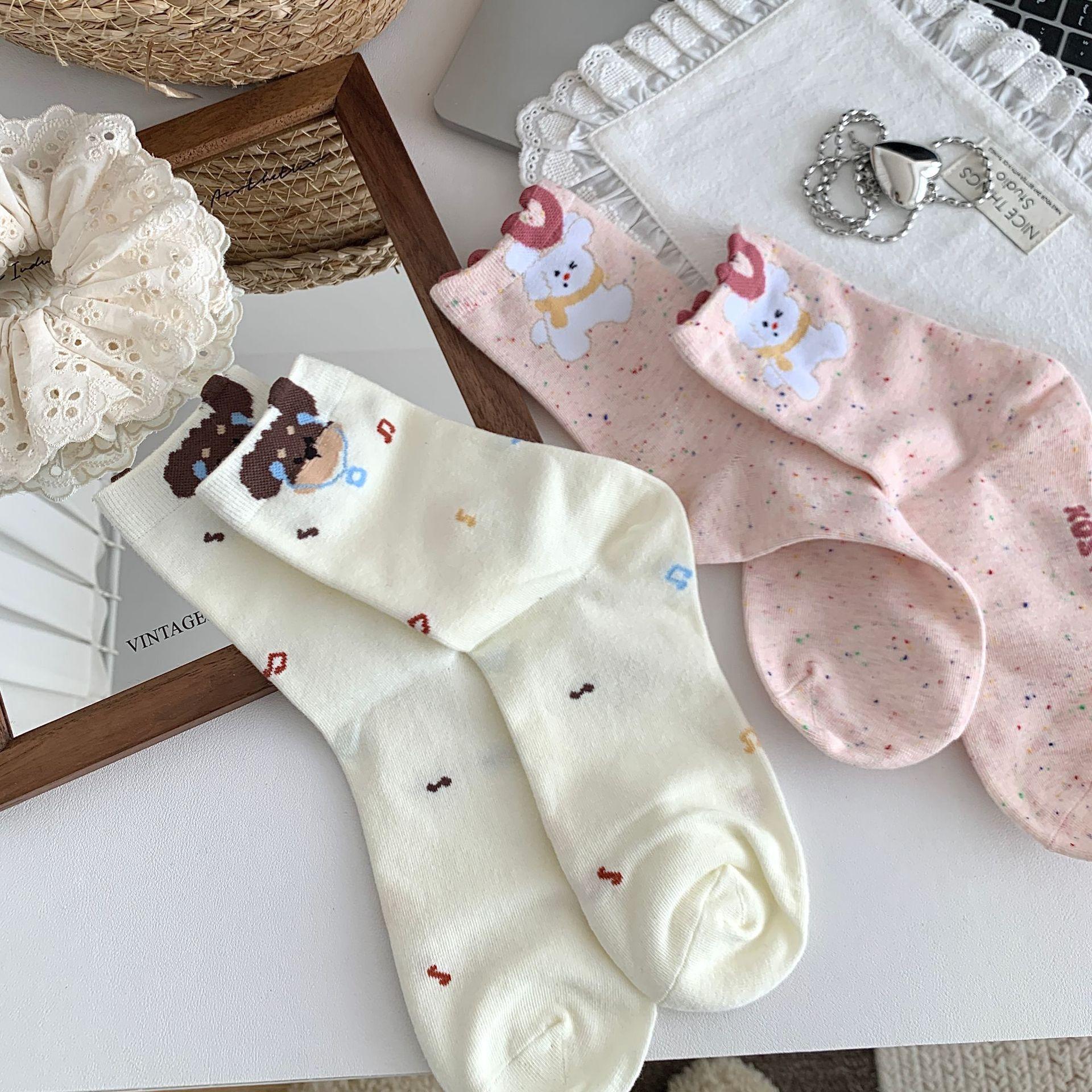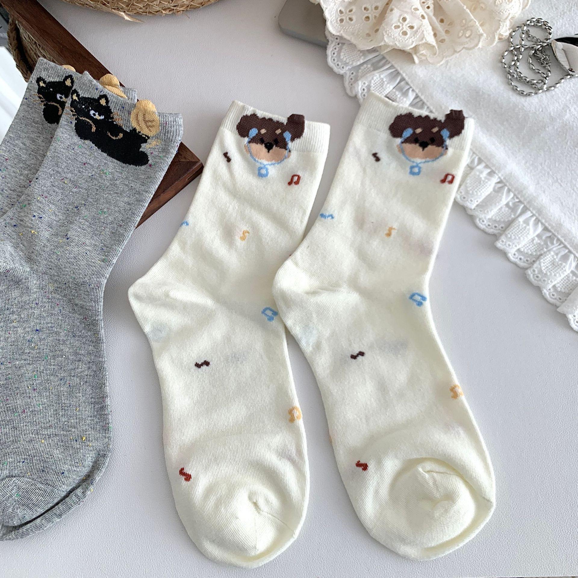 Calcetines de Mujer Primavera y Verano Nueva Llegada Hilado de Lunares Calcetines de Algodón de Tubo Medio para Mujer Ins Trendy Lindo Dibujo Animado Estilo Japonés Oreja Tridimensional Oso
