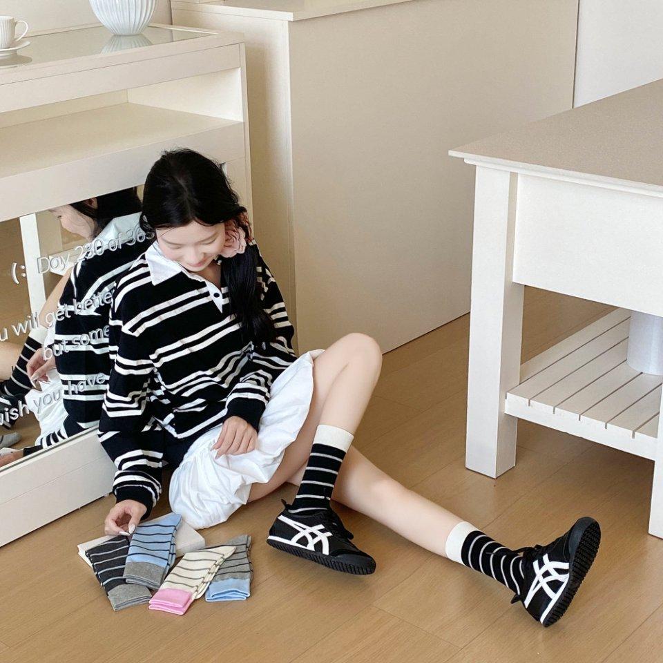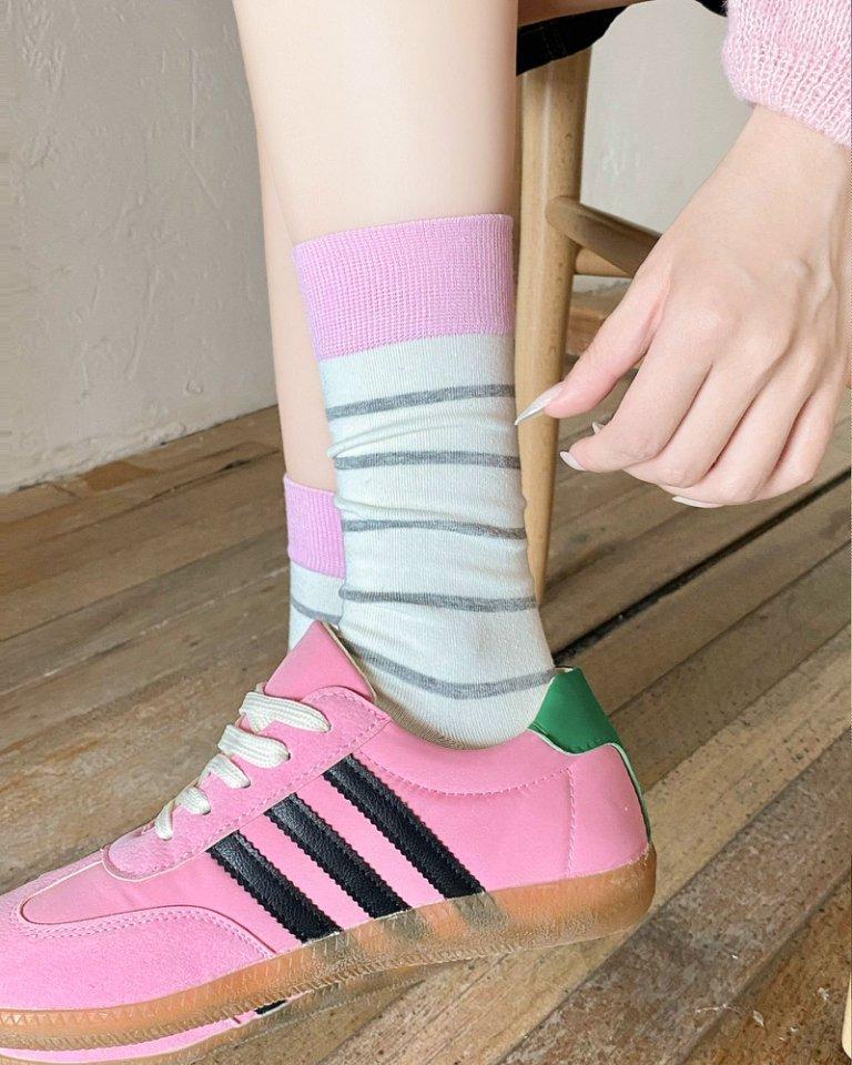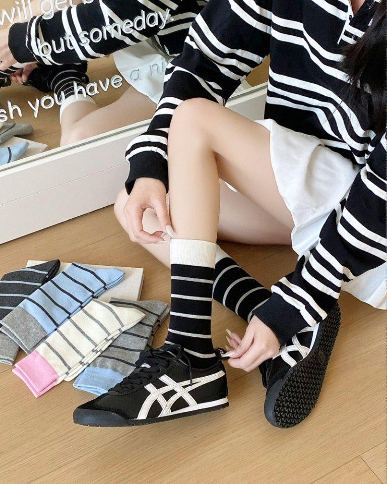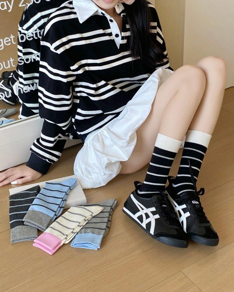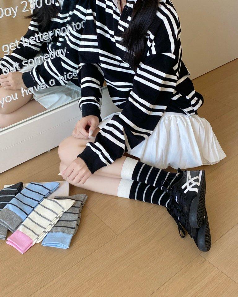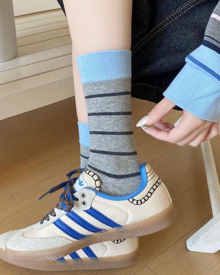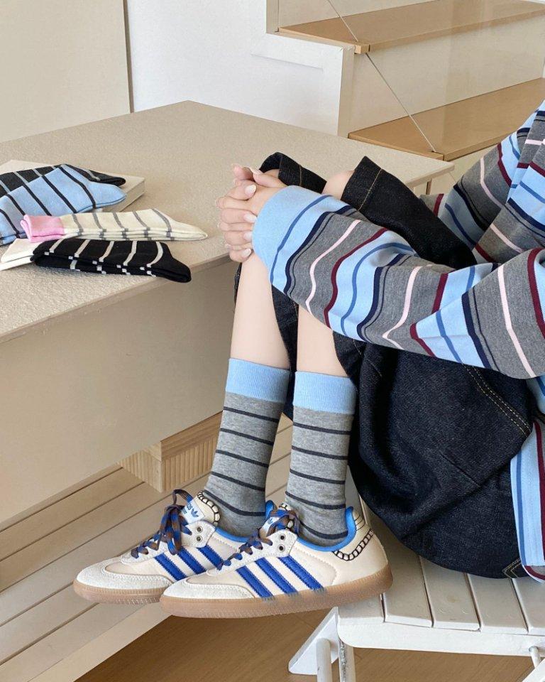 Calcetines de media caña para niña estilo miu otoño e invierno boca acanalada alta calcetines a rayas con bloques de color estilo universitario calcetines deportivos calcetines holgados de algodón puro