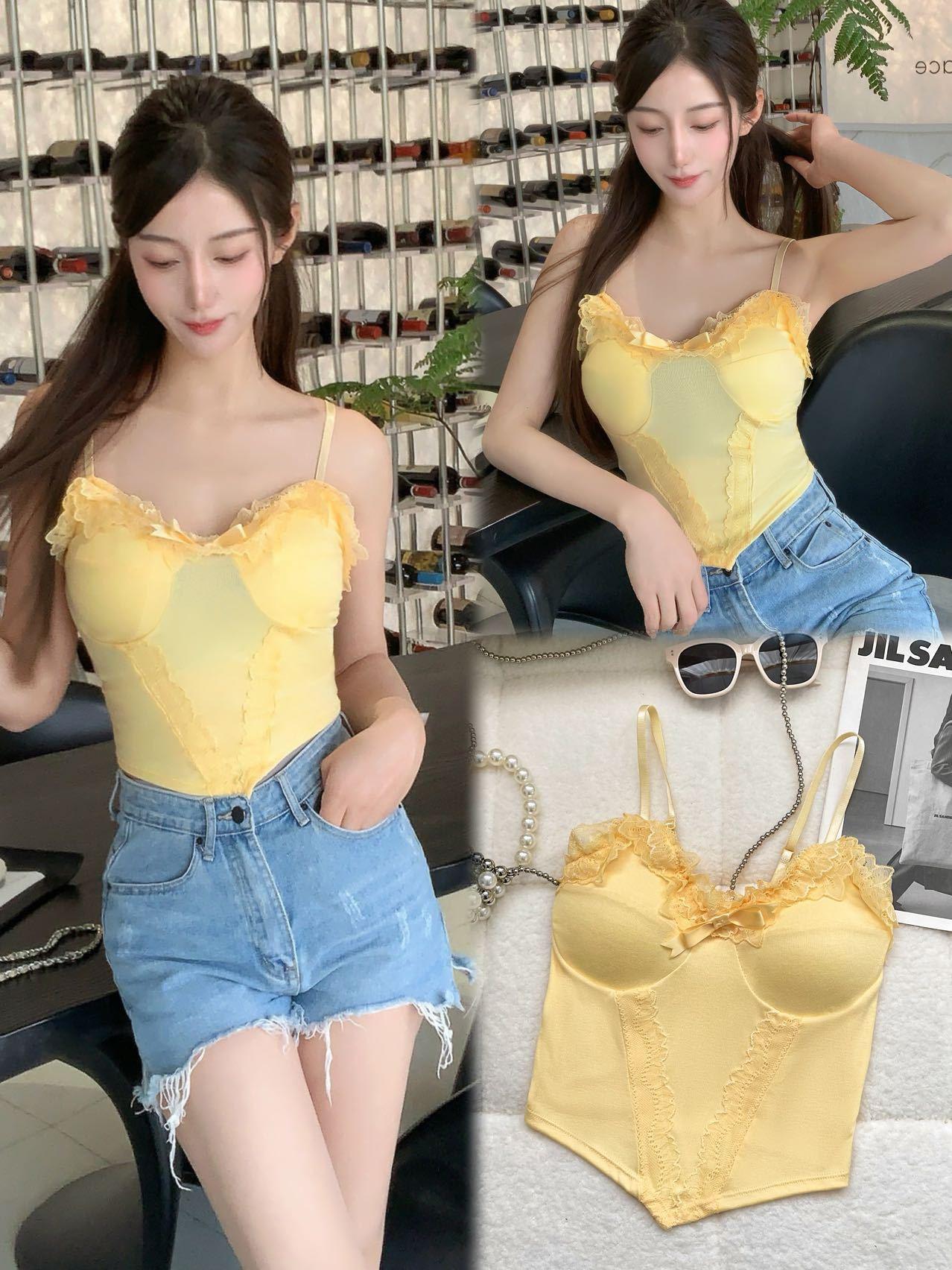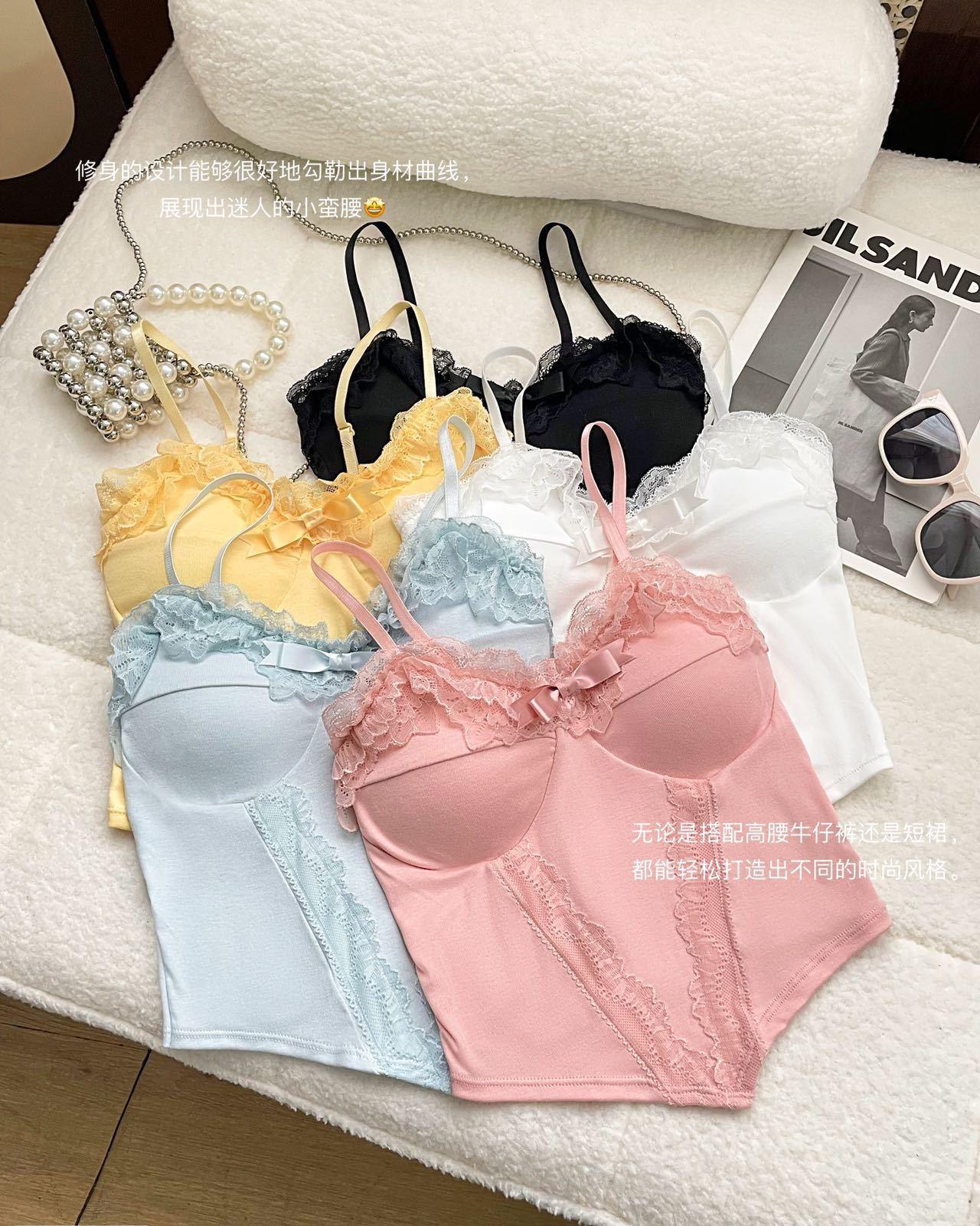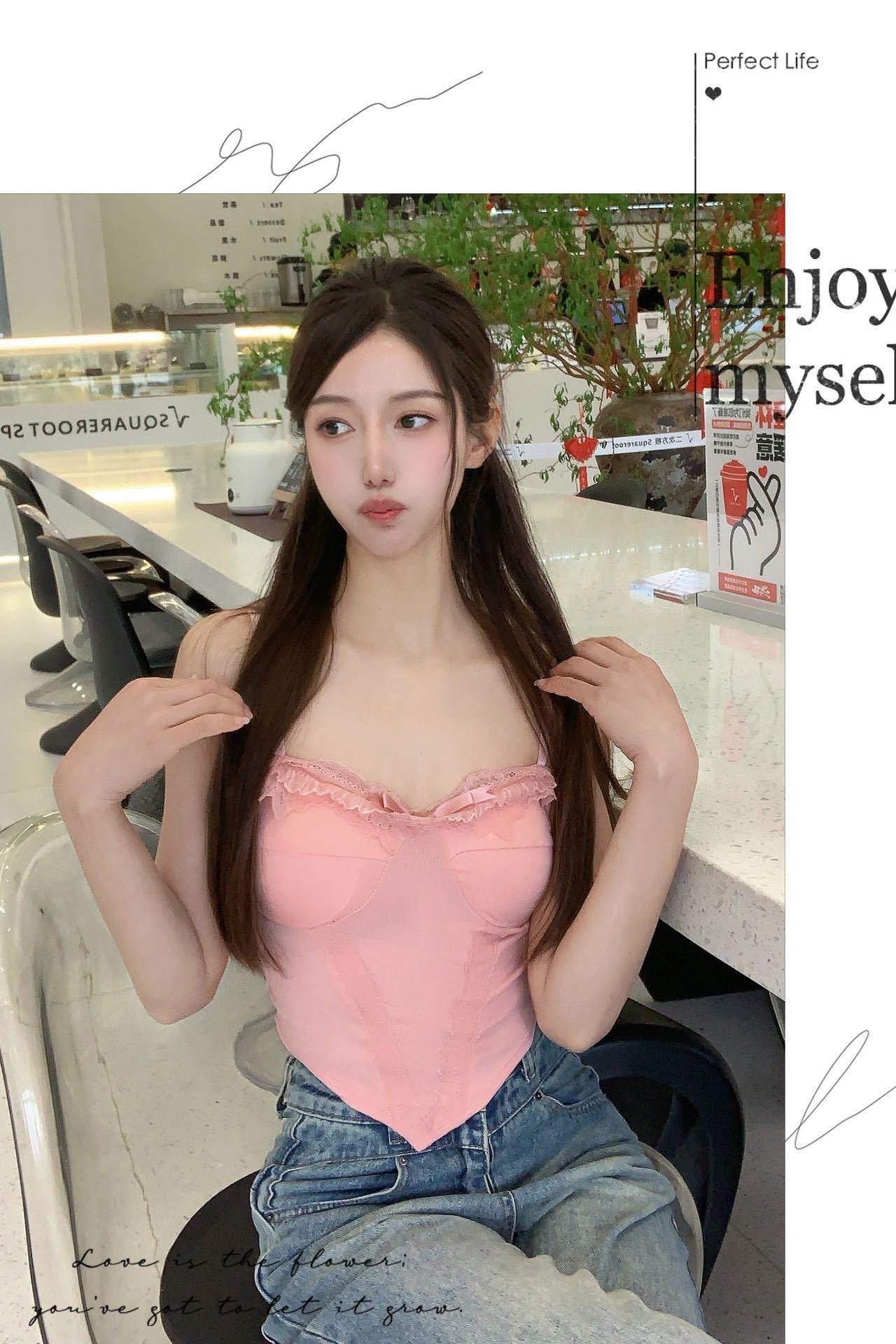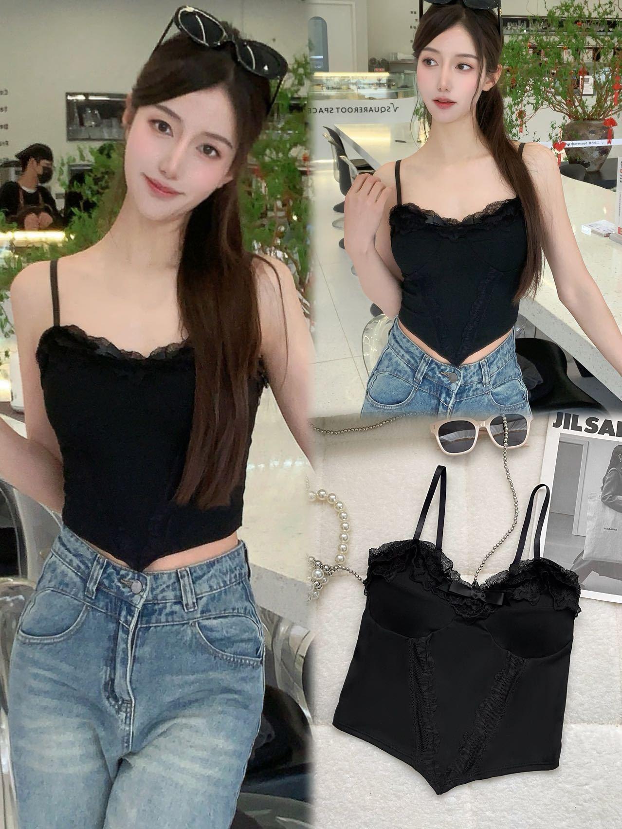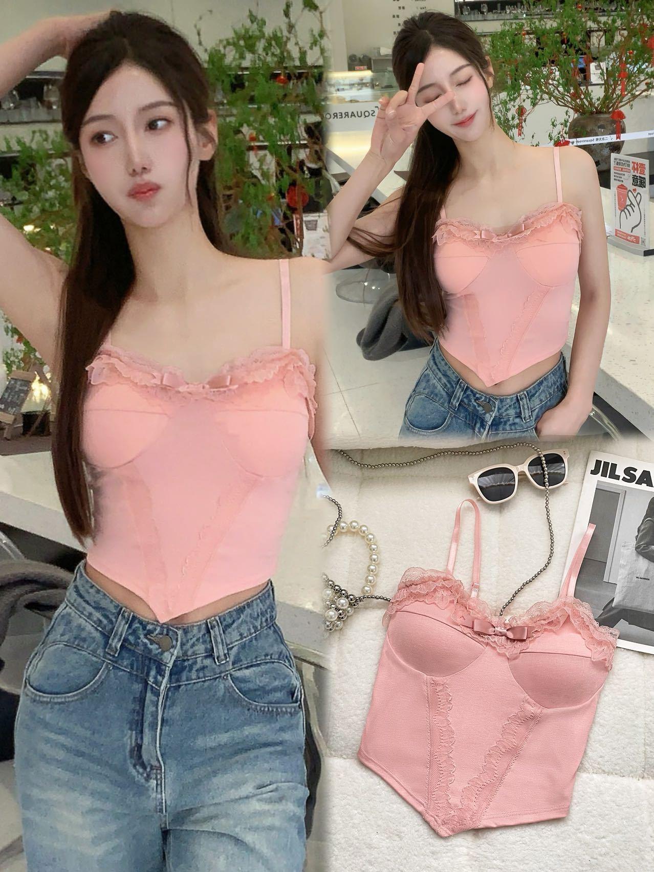 Camisola Sexy de Encaje con Lazo para Chica Top Tubo Corto con Hombros Descubiertos para Mujer con Tirantes Finos para los Hombros Camiseta Básica