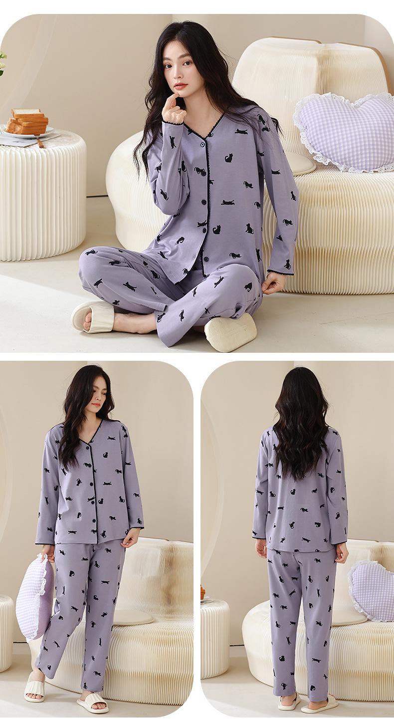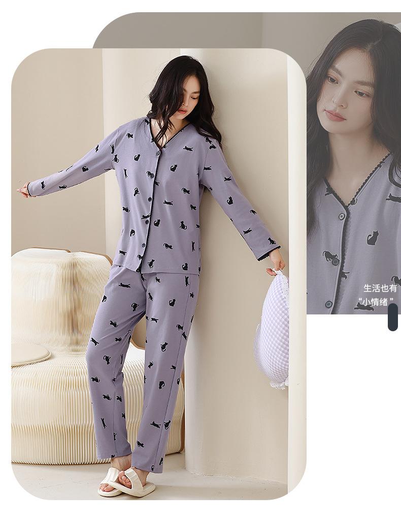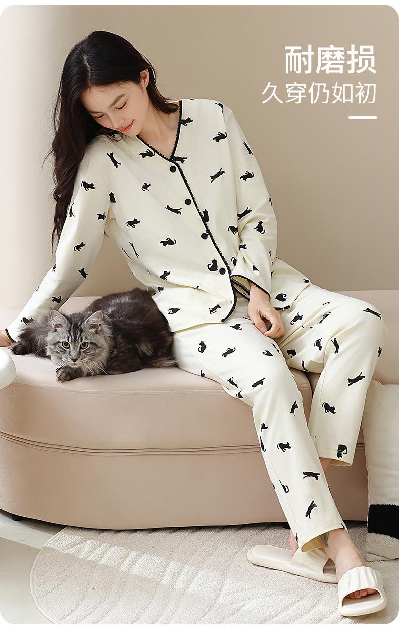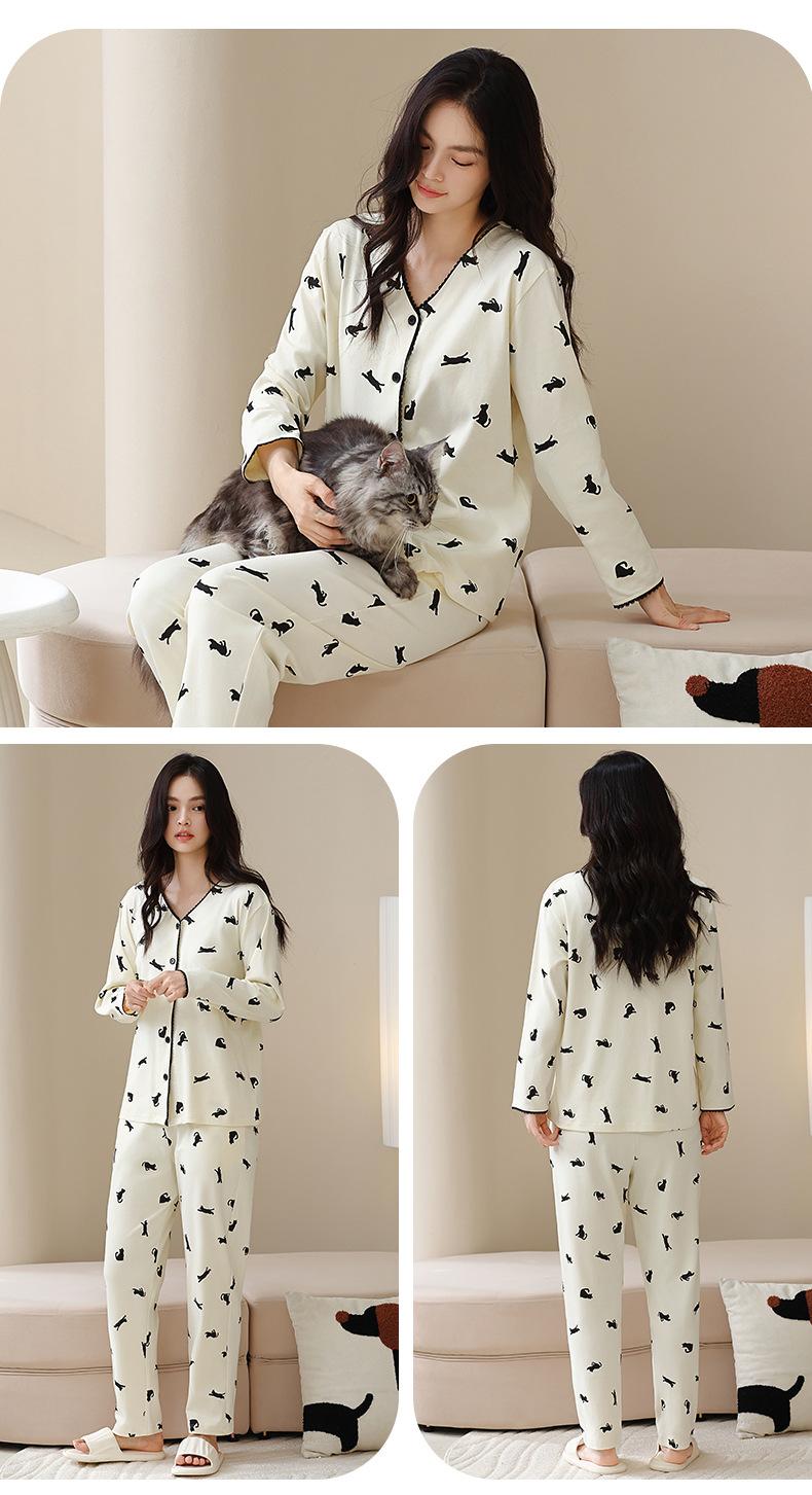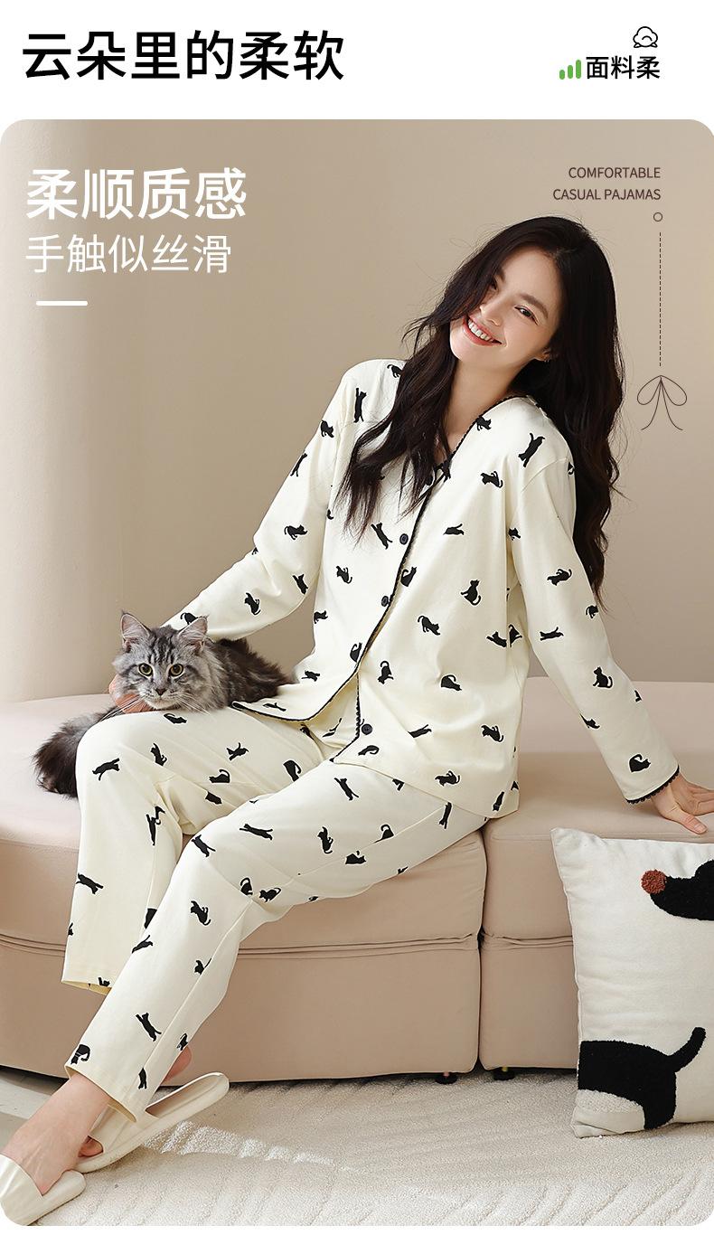 Pijama de algodón puro para mujer, otoño e invierno, manga larga, estampado de gatito lindo, cárdigan, ropa de casa, primavera y otoño, pijama de talla grande para mujer