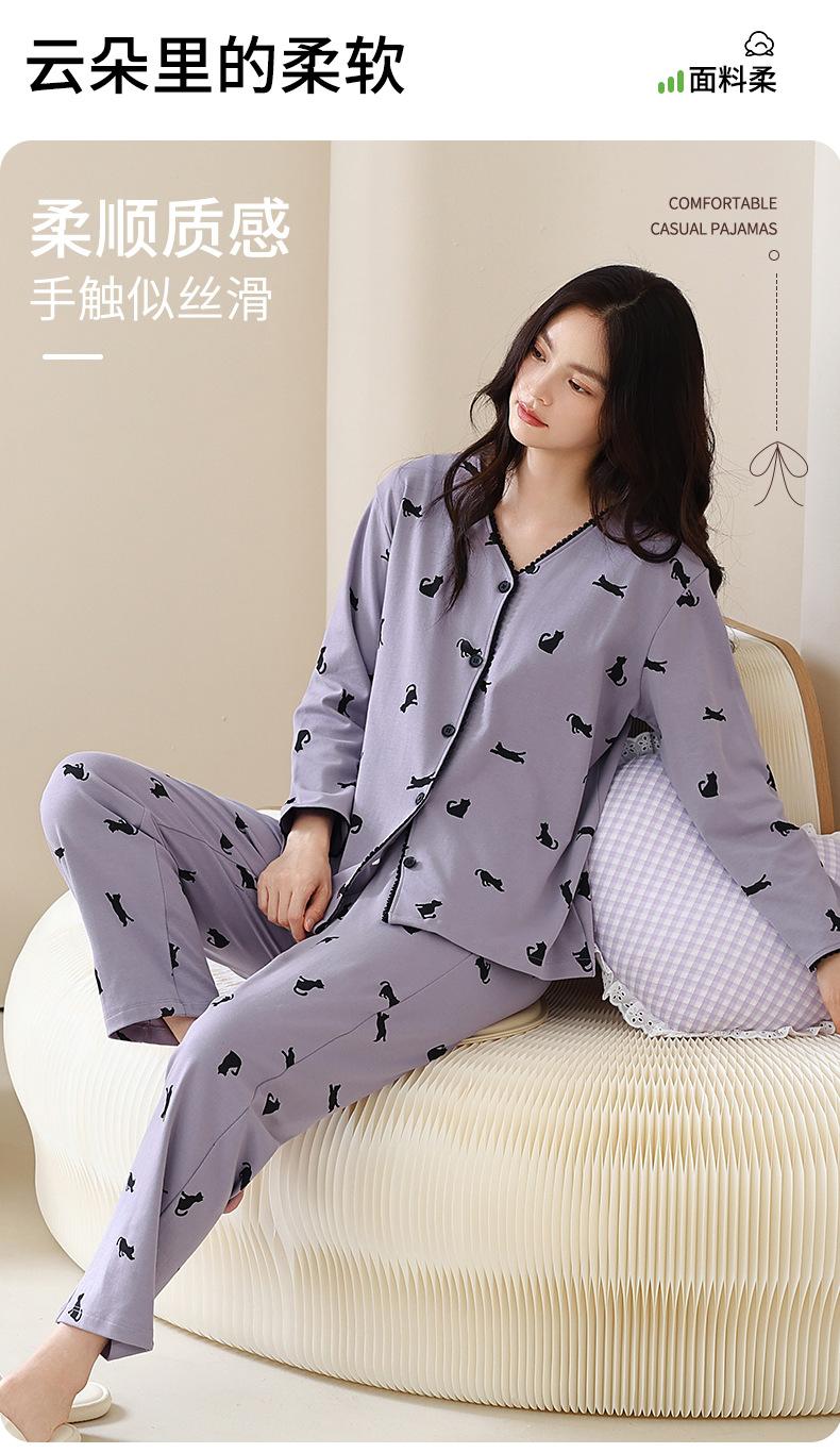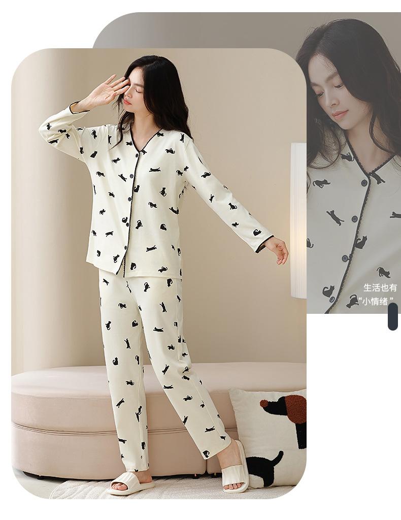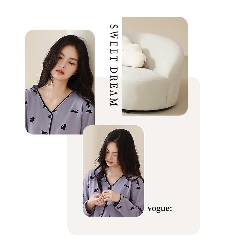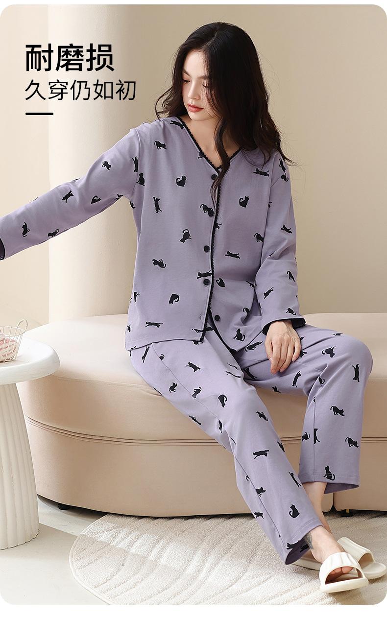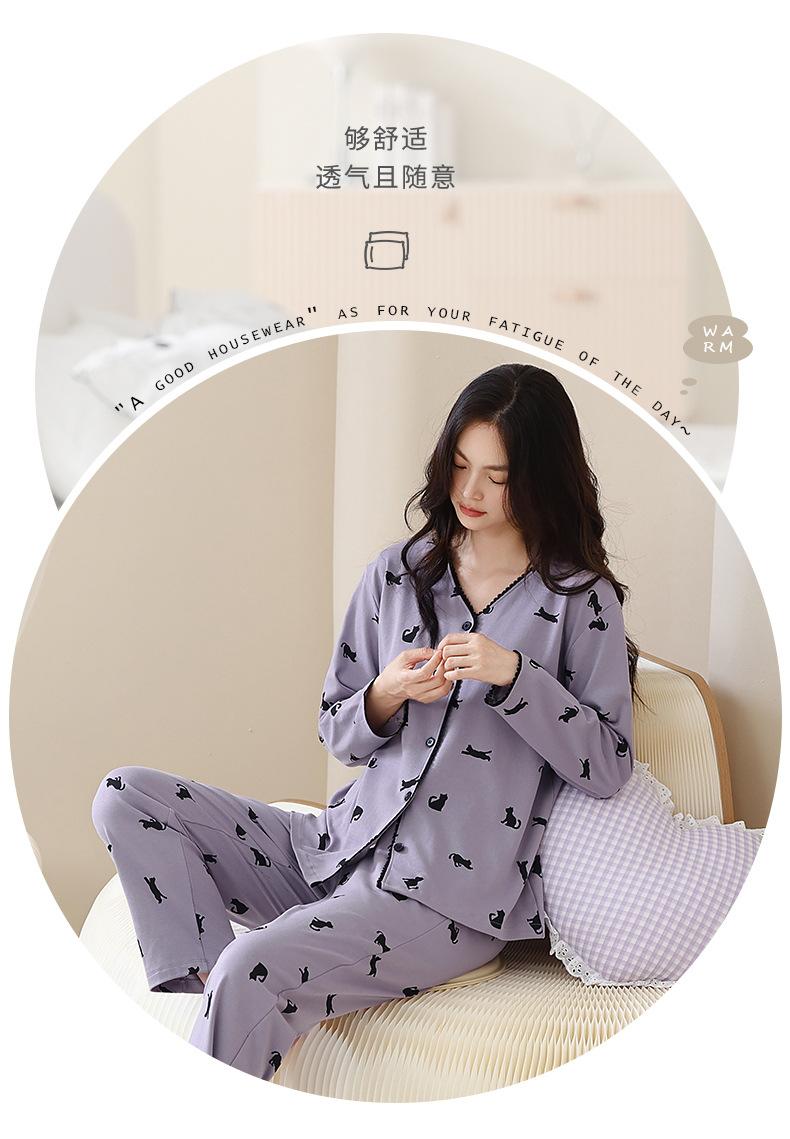 Pijama de algodón puro para mujer, otoño e invierno, manga larga, estampado de gatito lindo, cárdigan, ropa de casa, primavera y otoño, pijama de talla grande para mujer