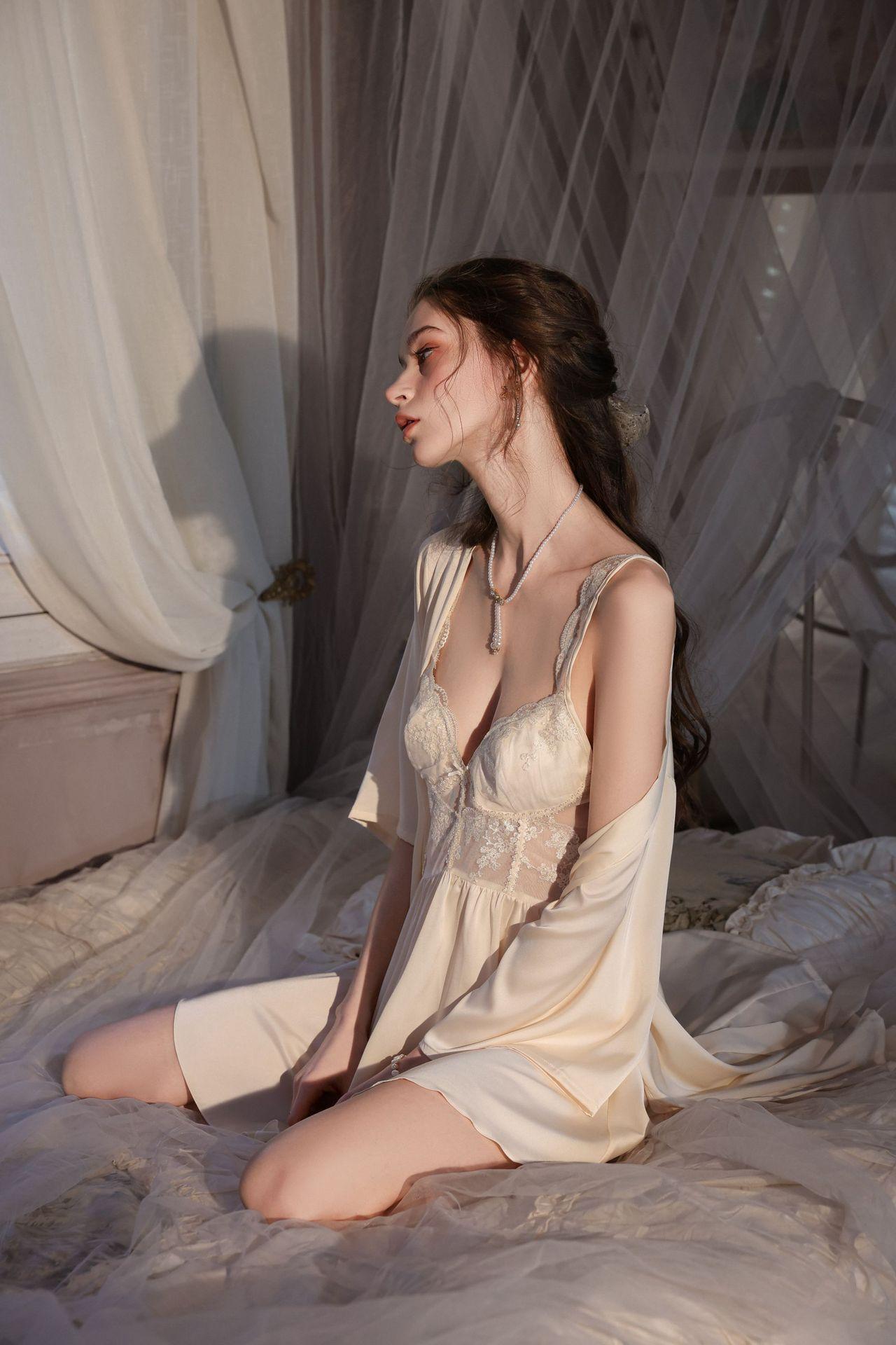 Sexy Conjunto de Camisola y Camisón de Encaje de Seda de Hielo para Mujer, Nuevo Estilo Deseo Puro, con Hermosos Tirantes, Ropa de Dormir de Verano