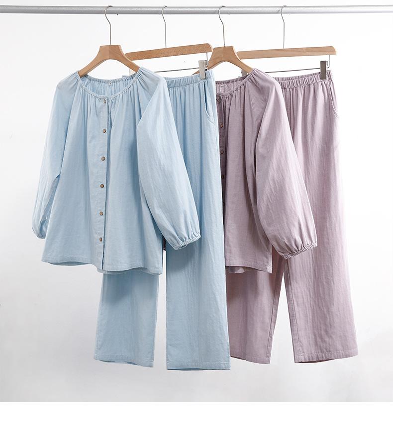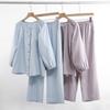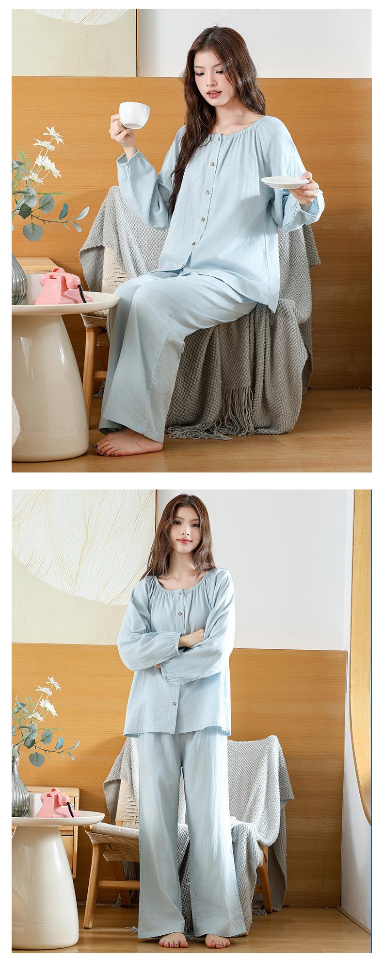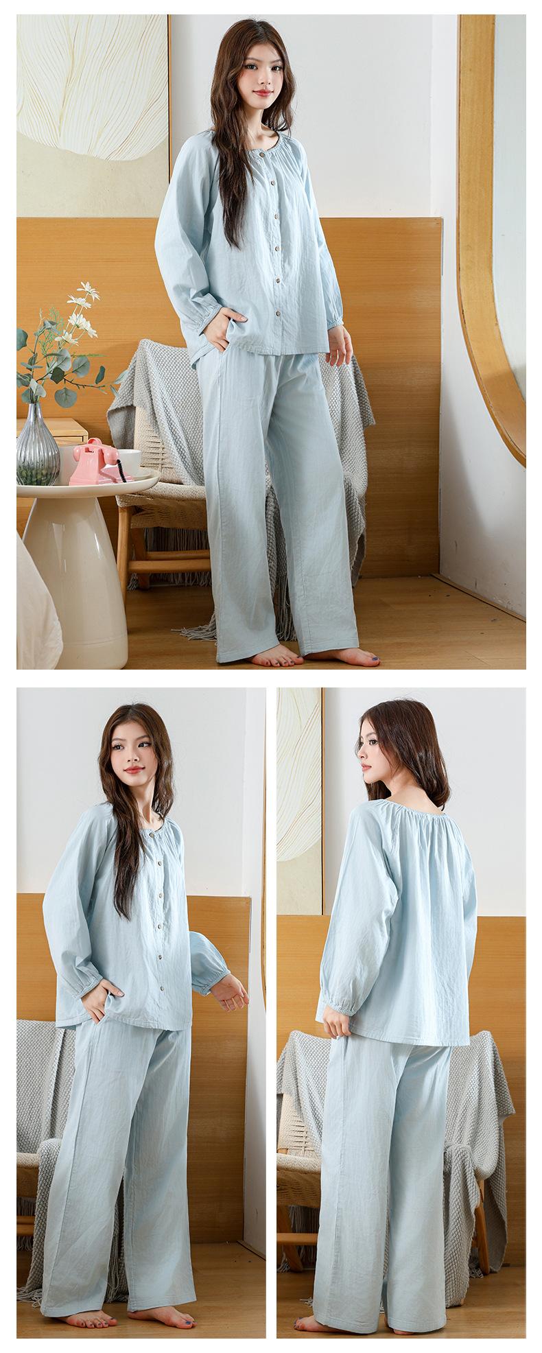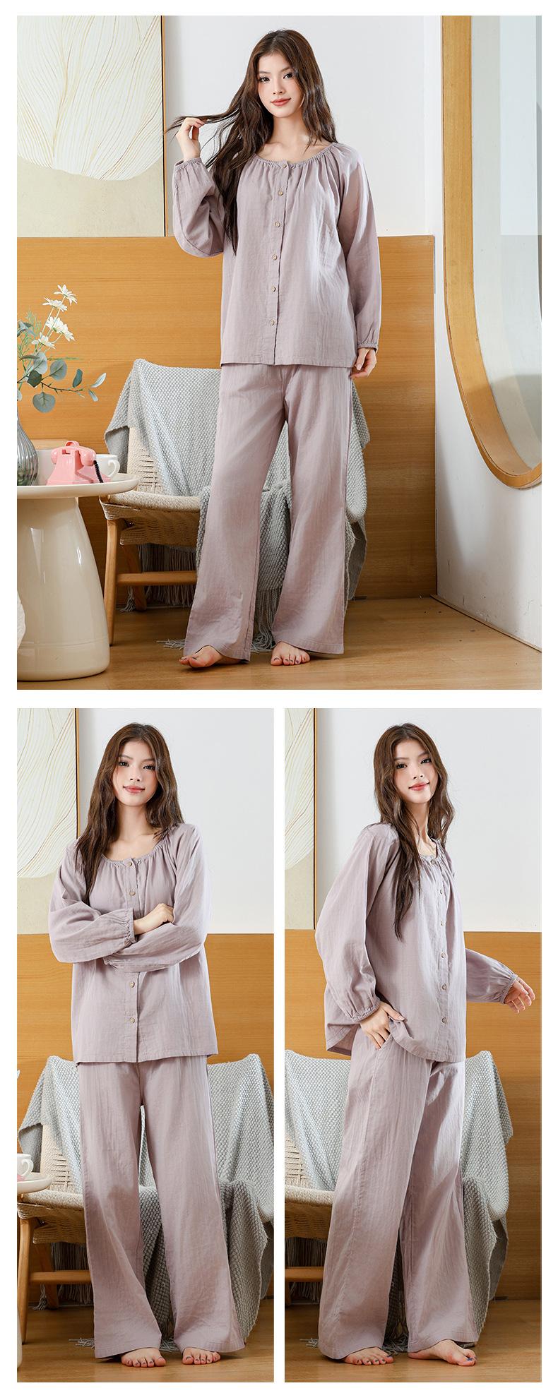 Pijama de Gasa de Doble Capa de Algodón Puro para Mujer, Estilo Delgado de Primavera Otoño, Color Sólido, Cuello Redondo, Manga Larga, Pantalón Largo, Conjunto Holgado para Estar en Casa