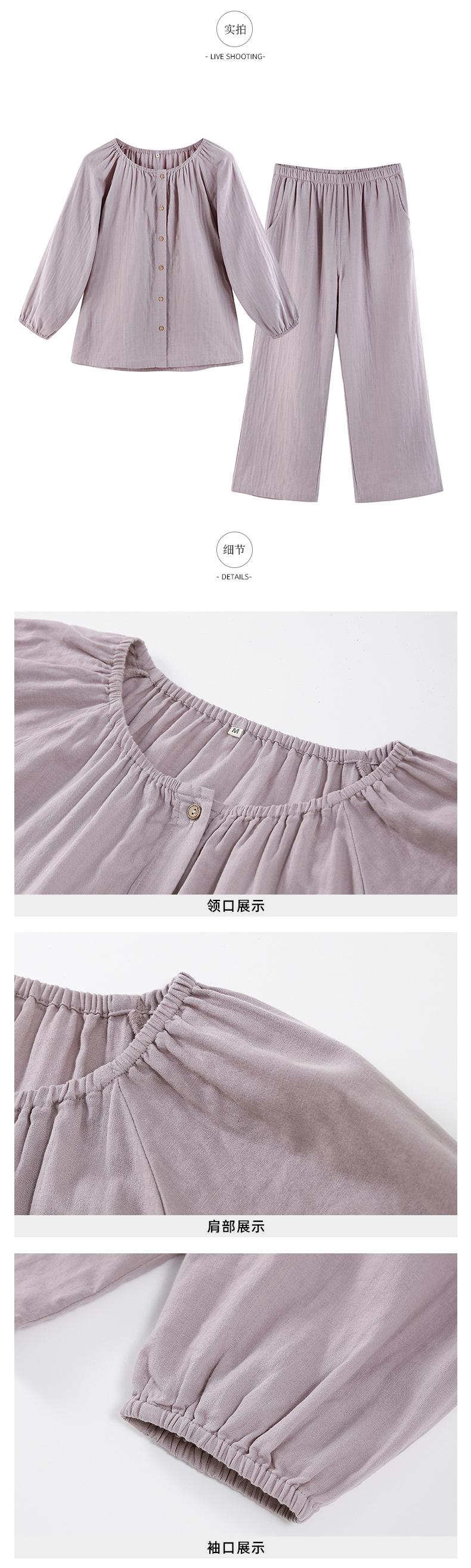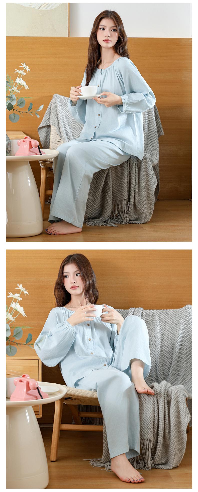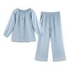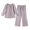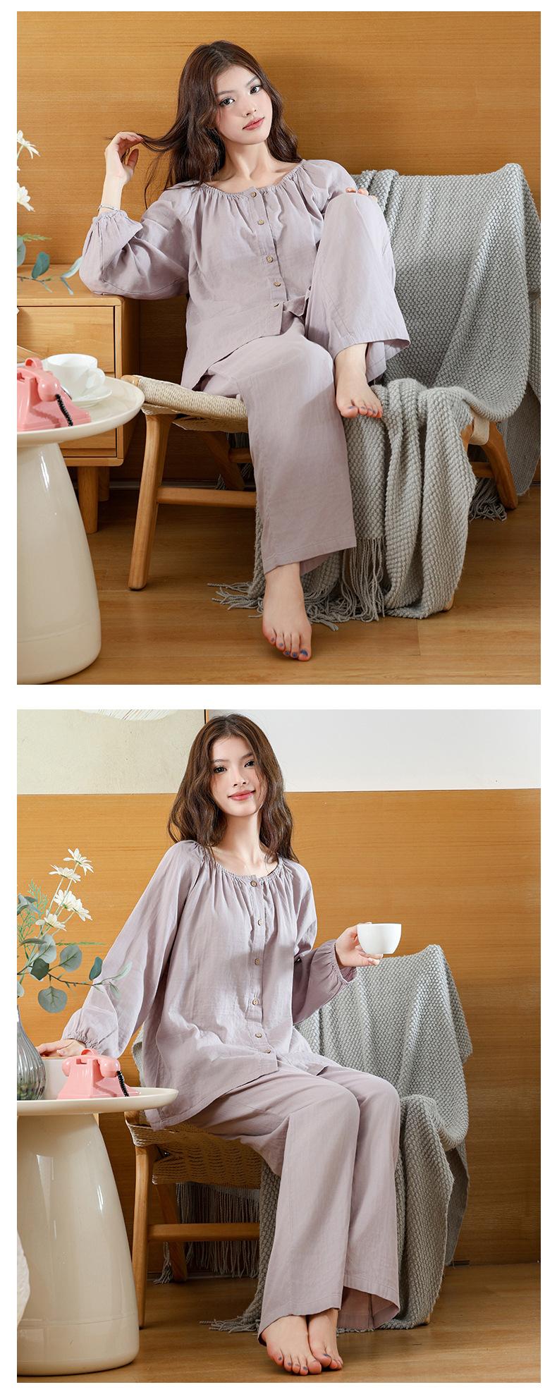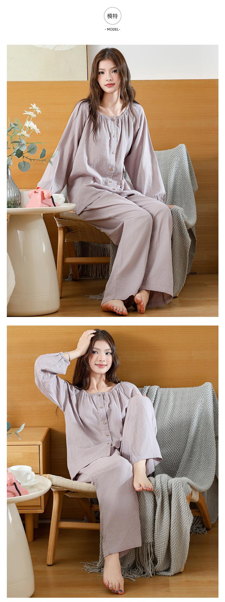 Pijama de Gasa de Doble Capa de Algodón Puro para Mujer, Estilo Delgado de Primavera Otoño, Color Sólido, Cuello Redondo, Manga Larga, Pantalón Largo, Conjunto Holgado para Estar en Casa
