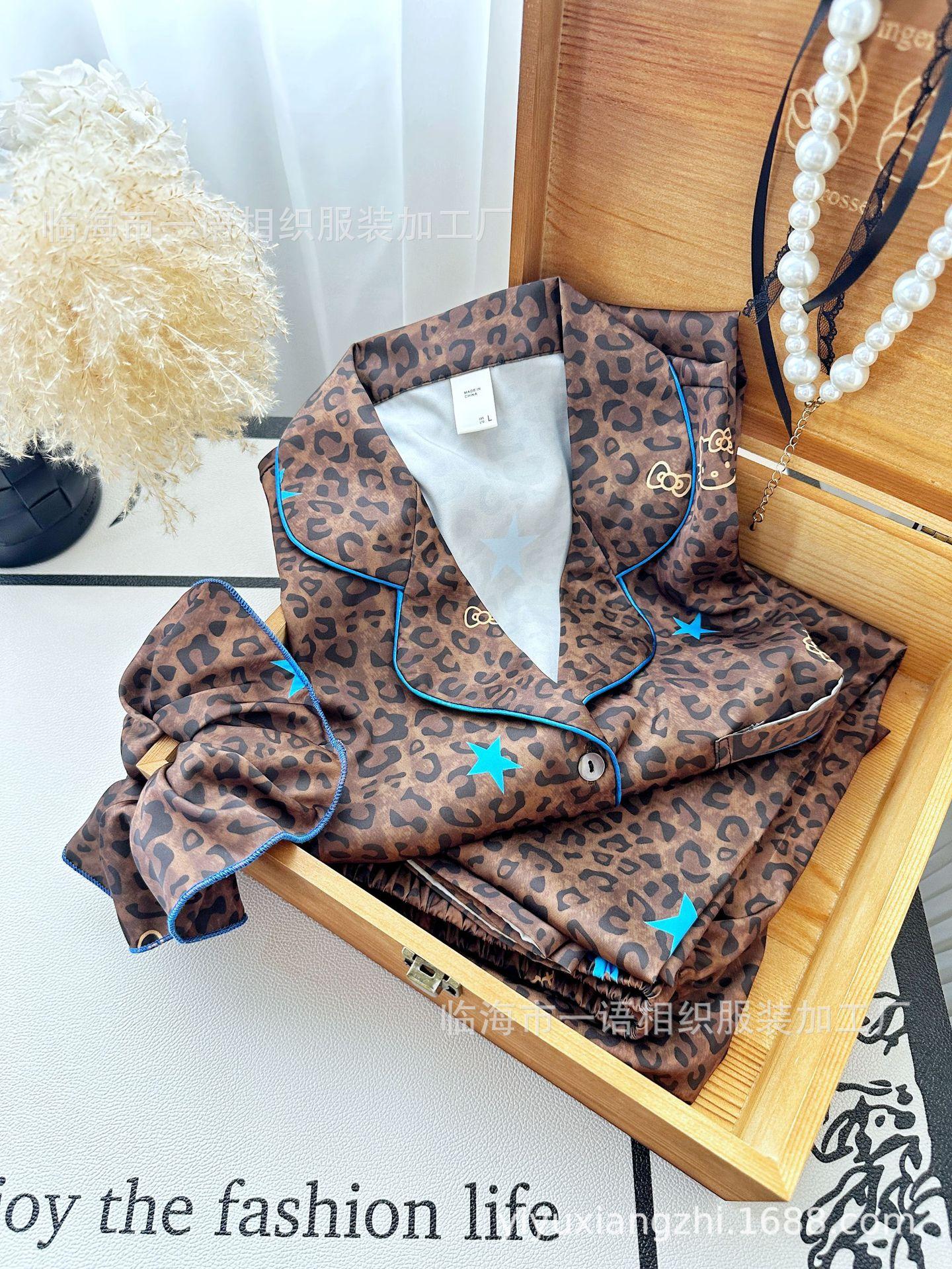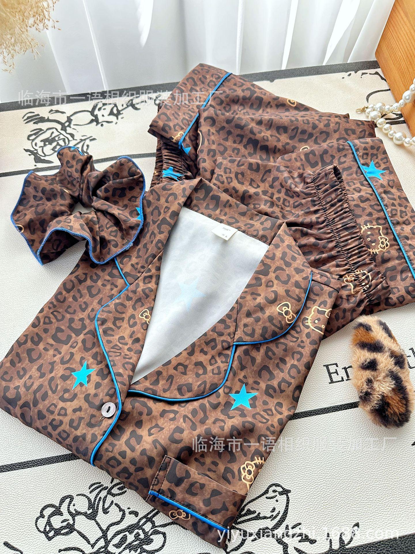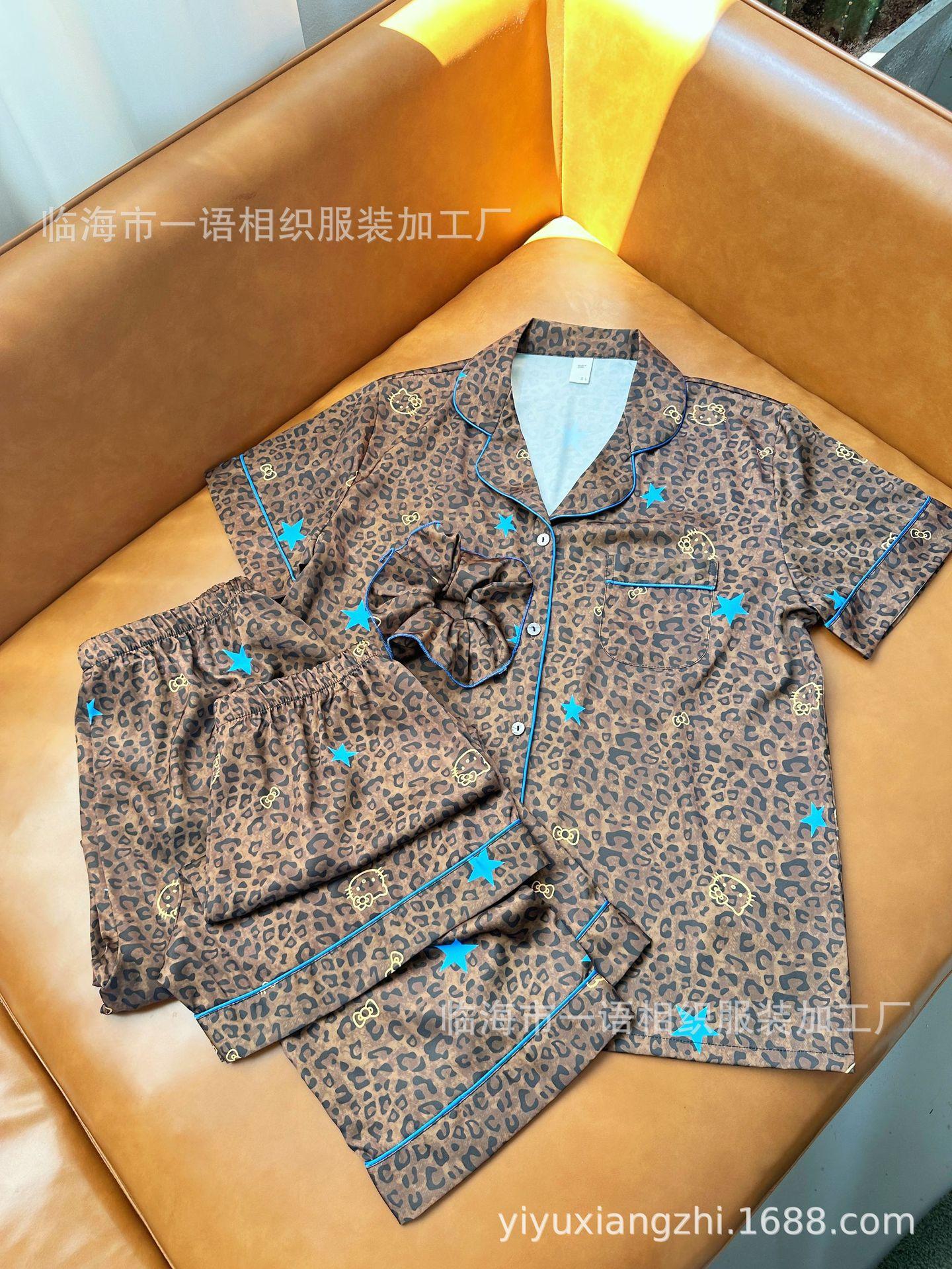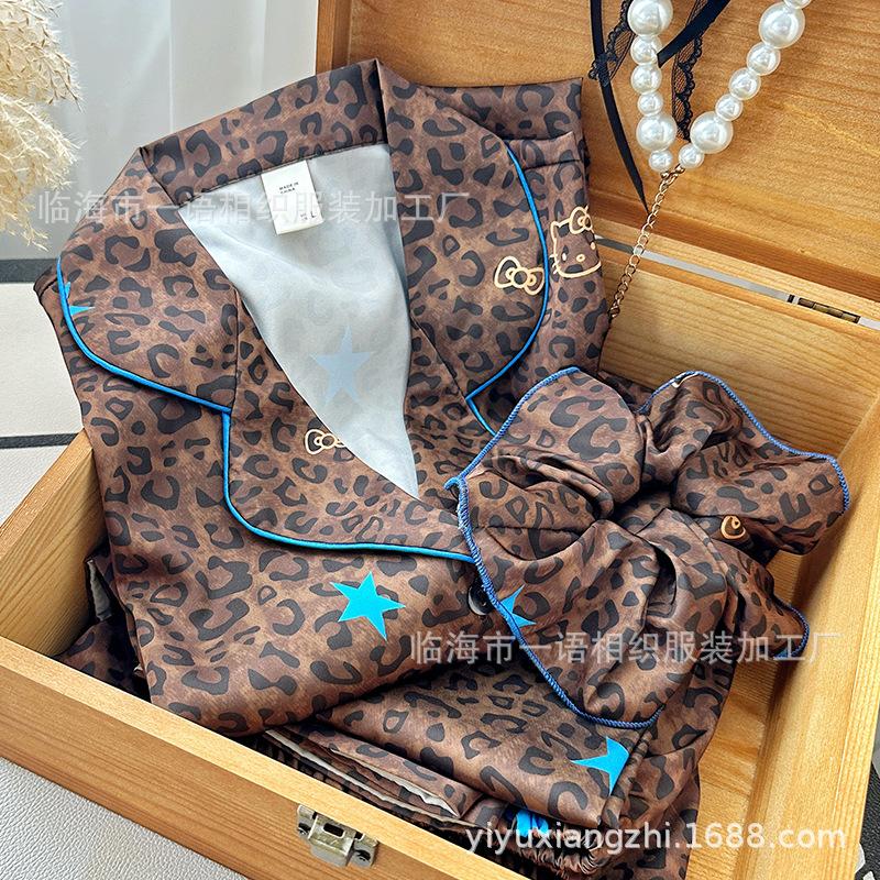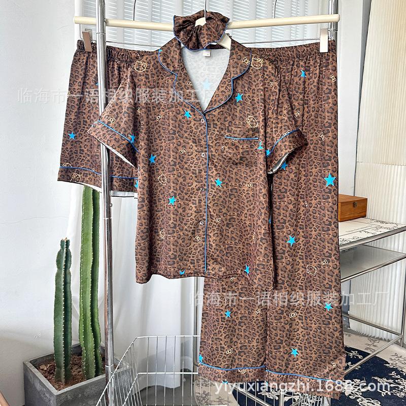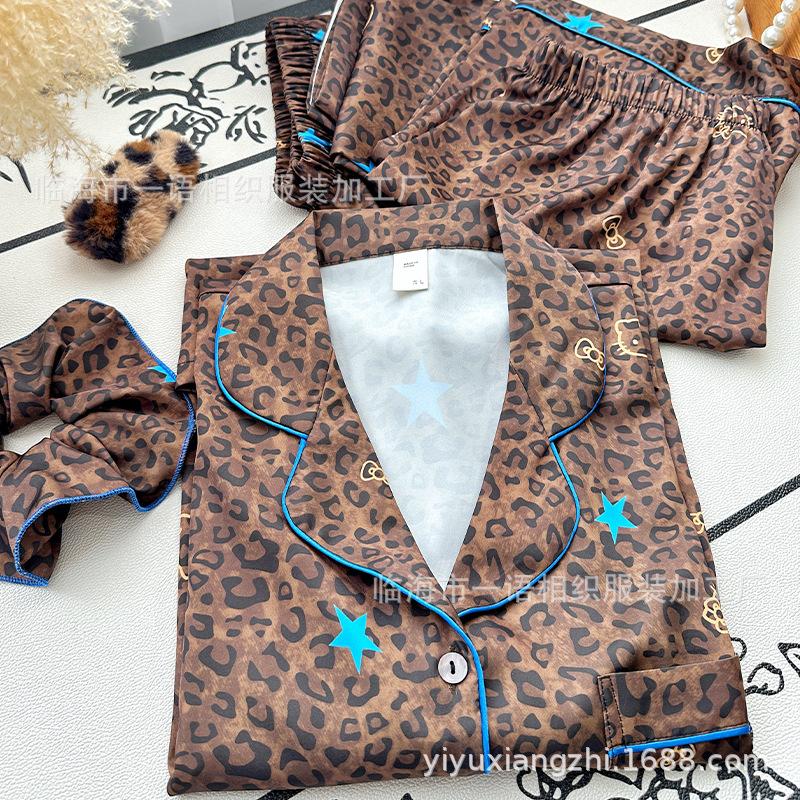 Conjunto de tres piezas Otoño Nueva Estrella KT con Lazo para el Cabello Pijama de Seda de Hielo para Mujer Solapa Delgado Conjunto de Ropa de Casa para Mujer