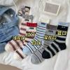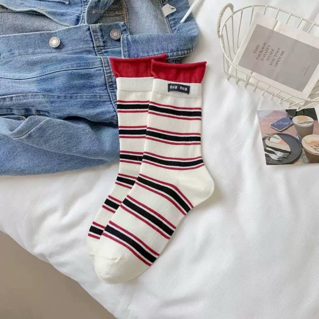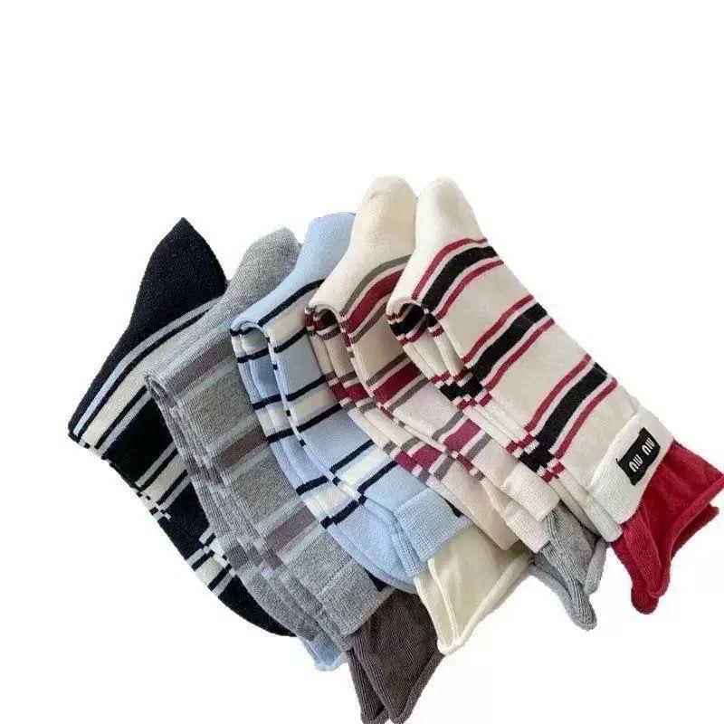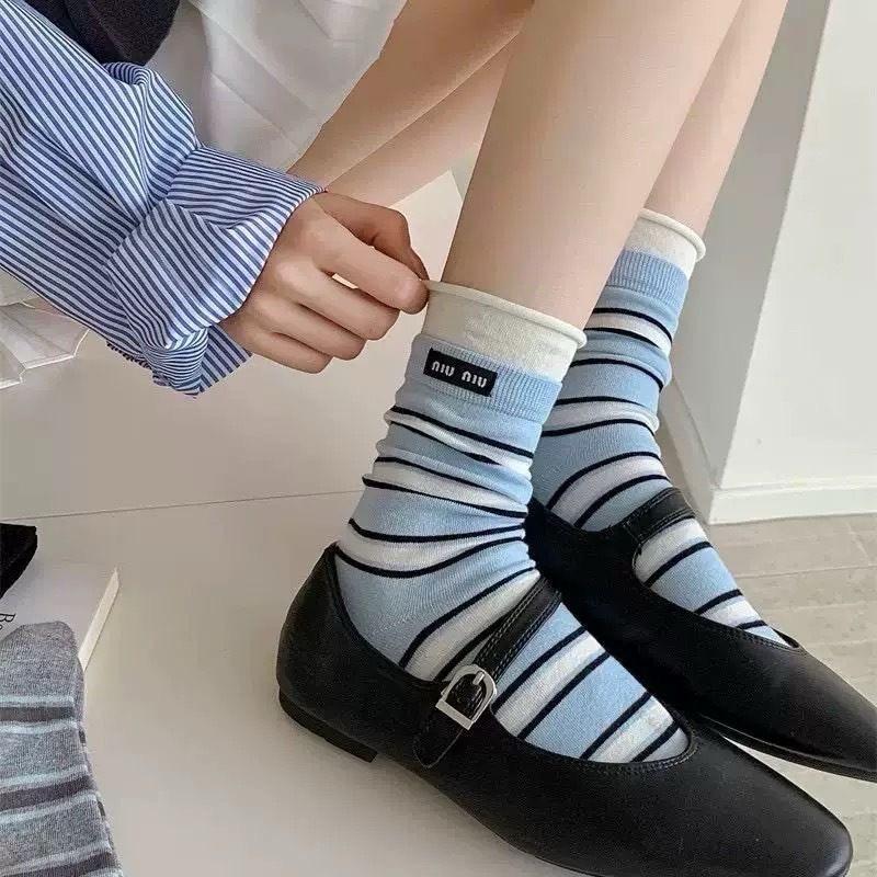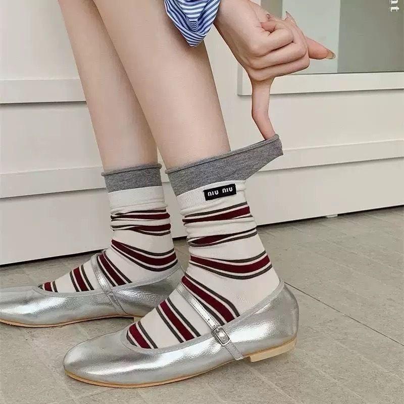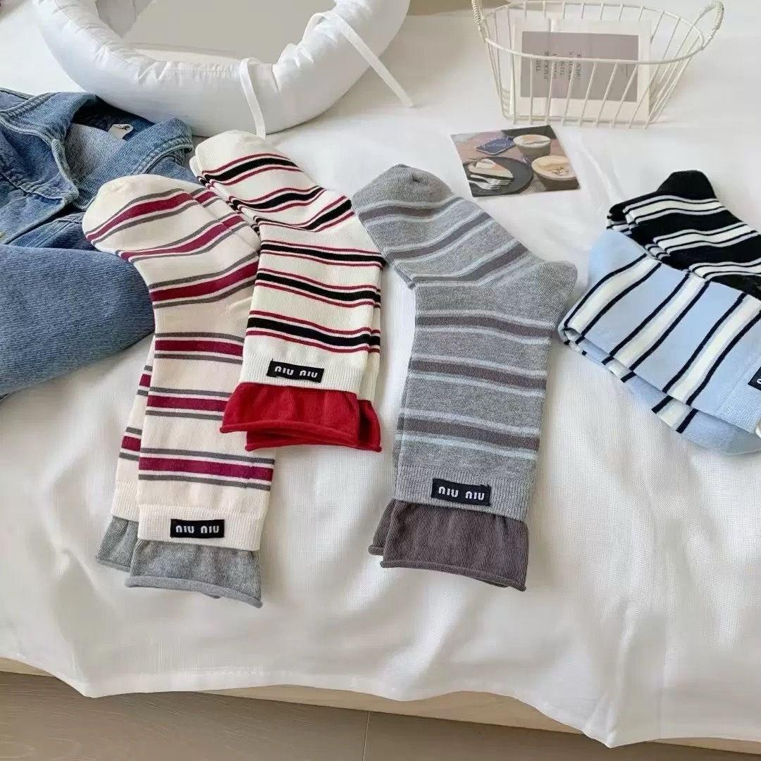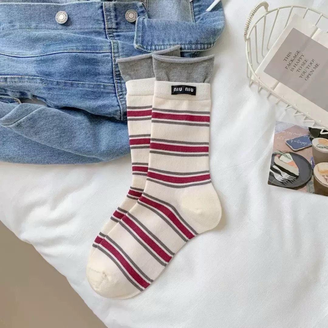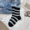 Otoño ins etiqueta de tela doble acanalado bloque de color empalmado calcetines slouch hasta media pantorrilla calcetines estilo preppy retro coreanos a rayas mujeres