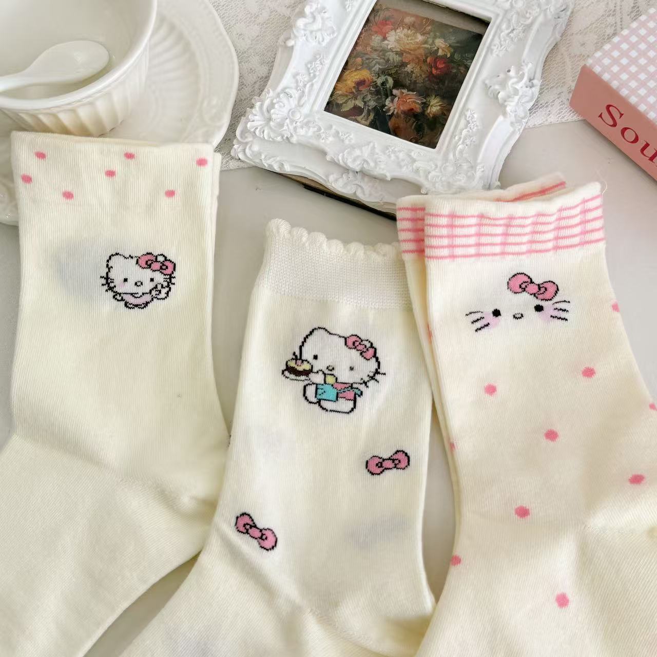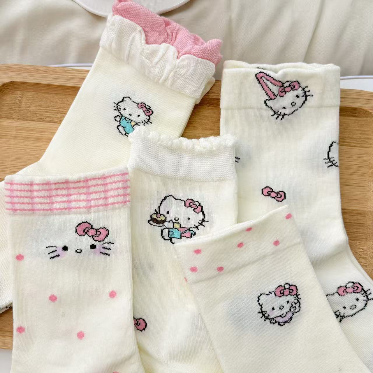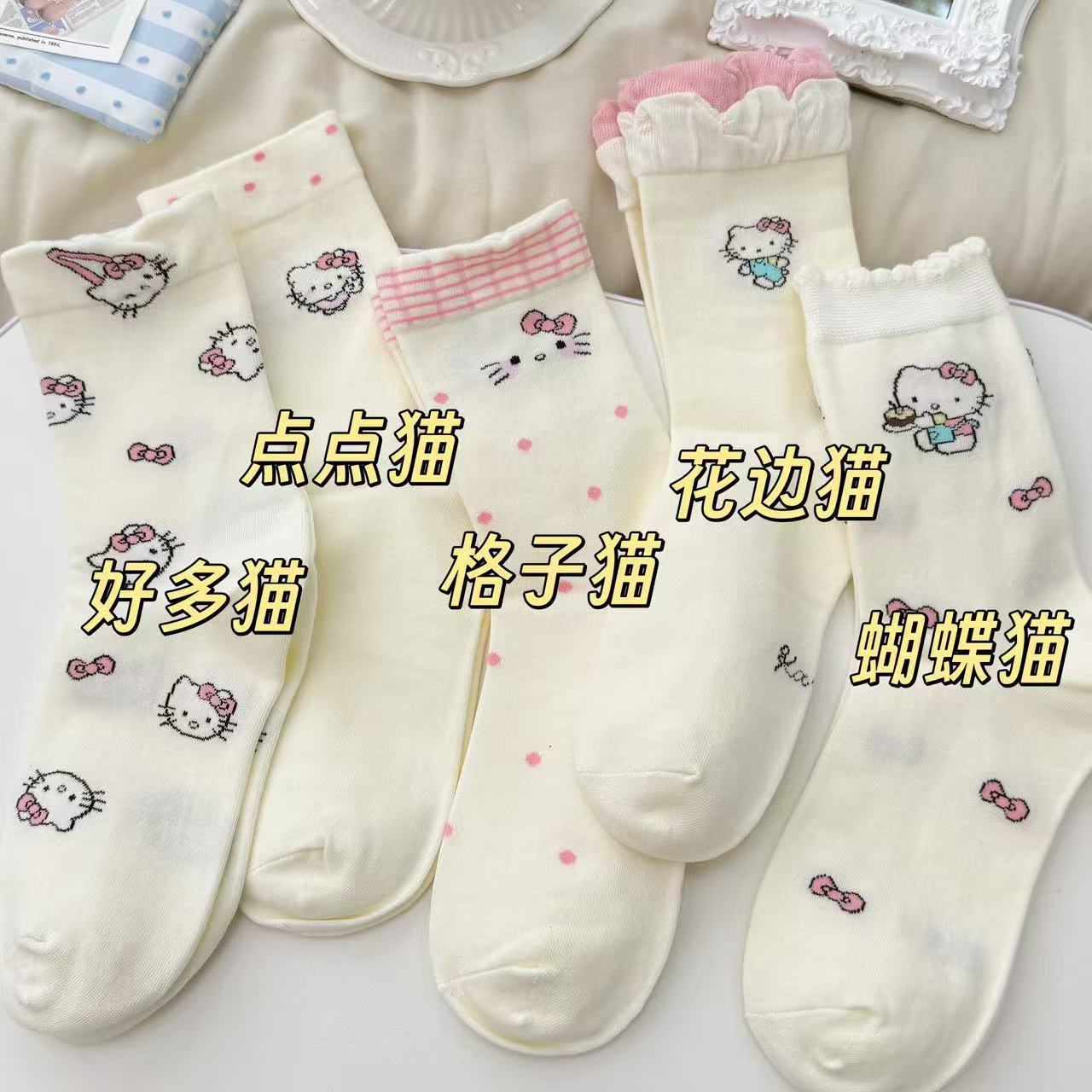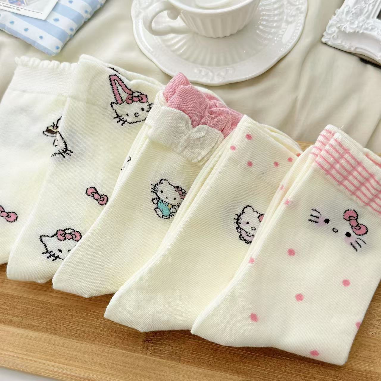 Calcetines Delgados de Verano de Gato KT Calcetines de Media Caña para Mujer ins Blancos Calcetines Largos hasta la Rodilla para Mujer Dulces de Dibujos Animados Japoneses Encaje
