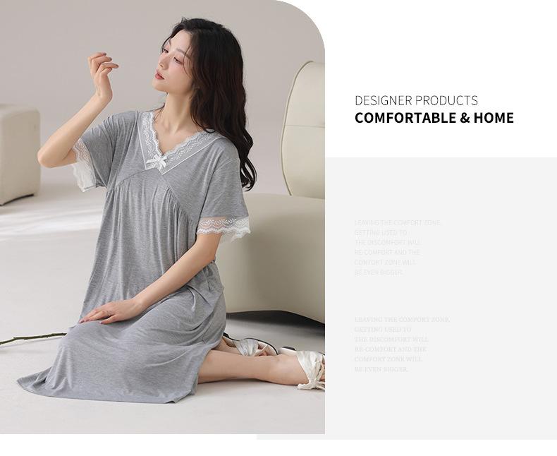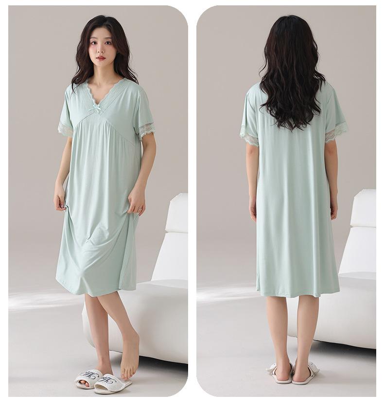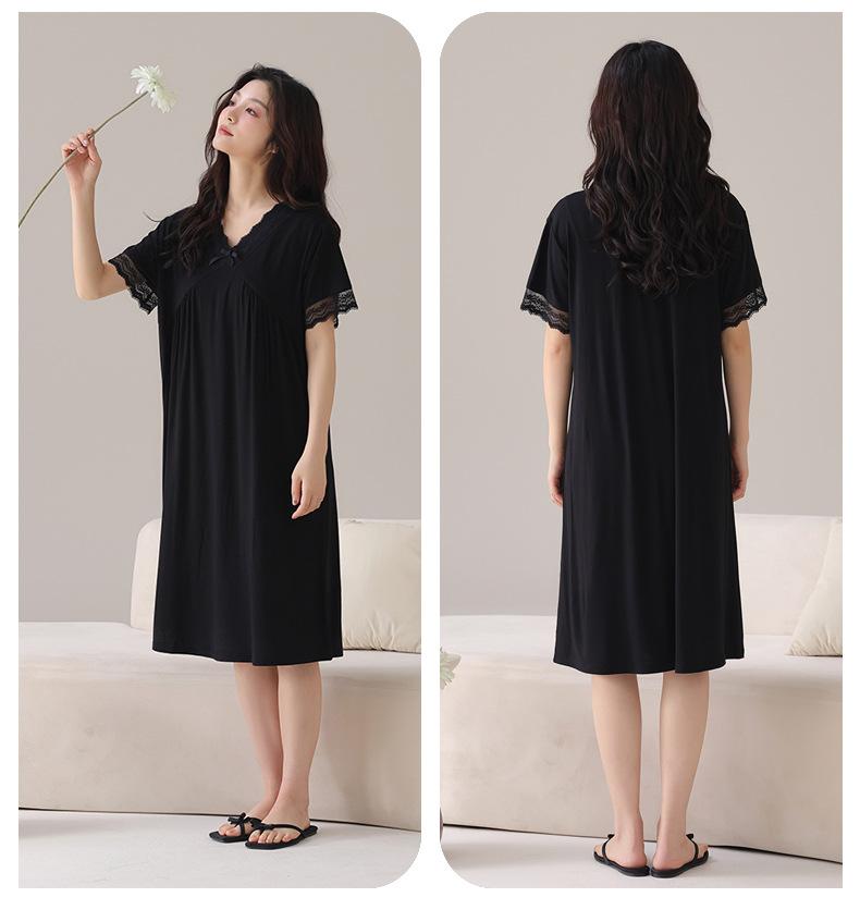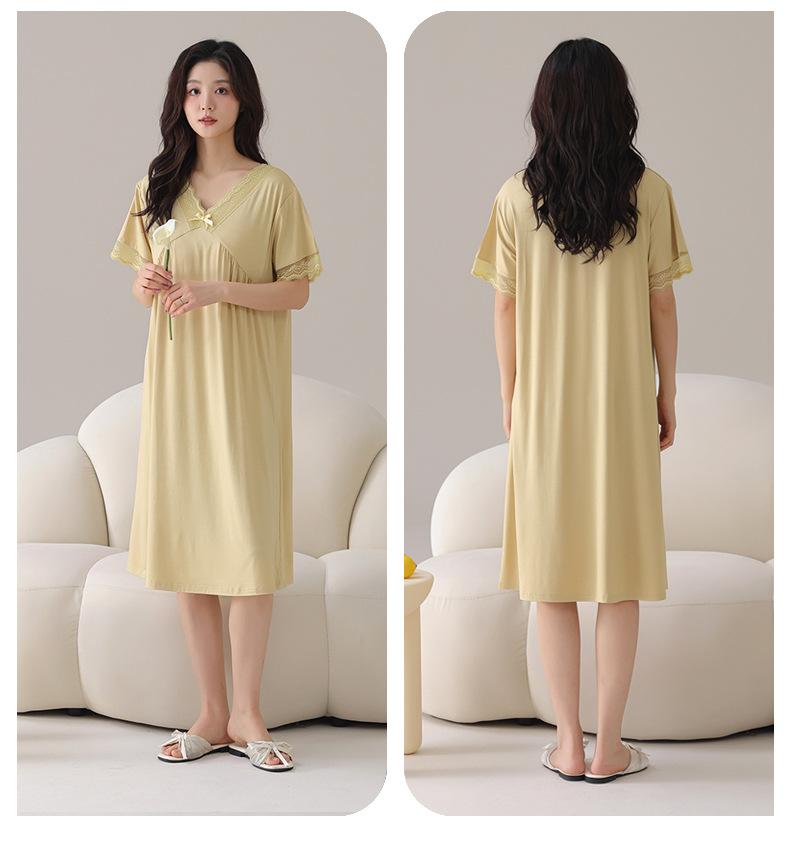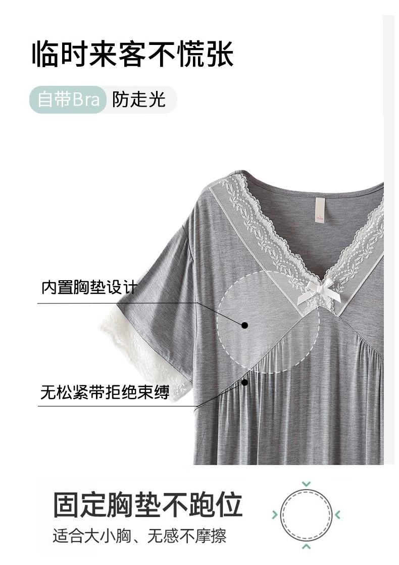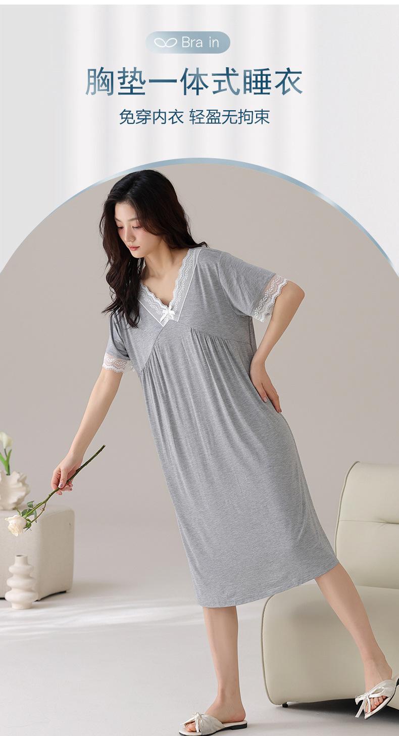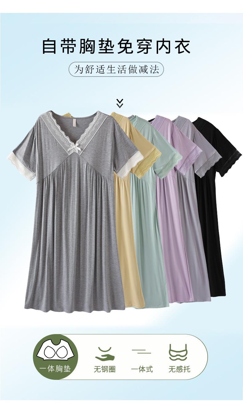 Pijama Sexy de Encaje de Verano para Mujer de Modal de Manga Corta y Largo Medio con Almohadillas para el Busto, Vestido para Estar en Casa