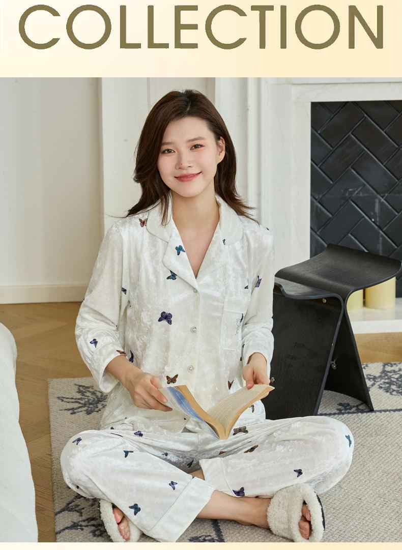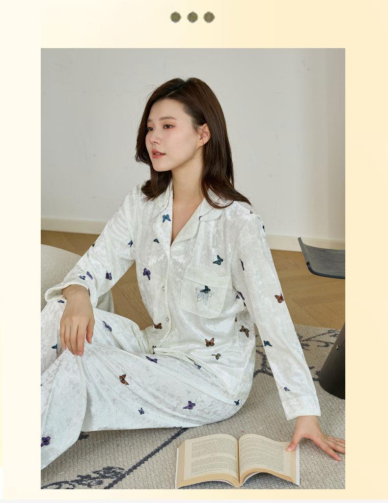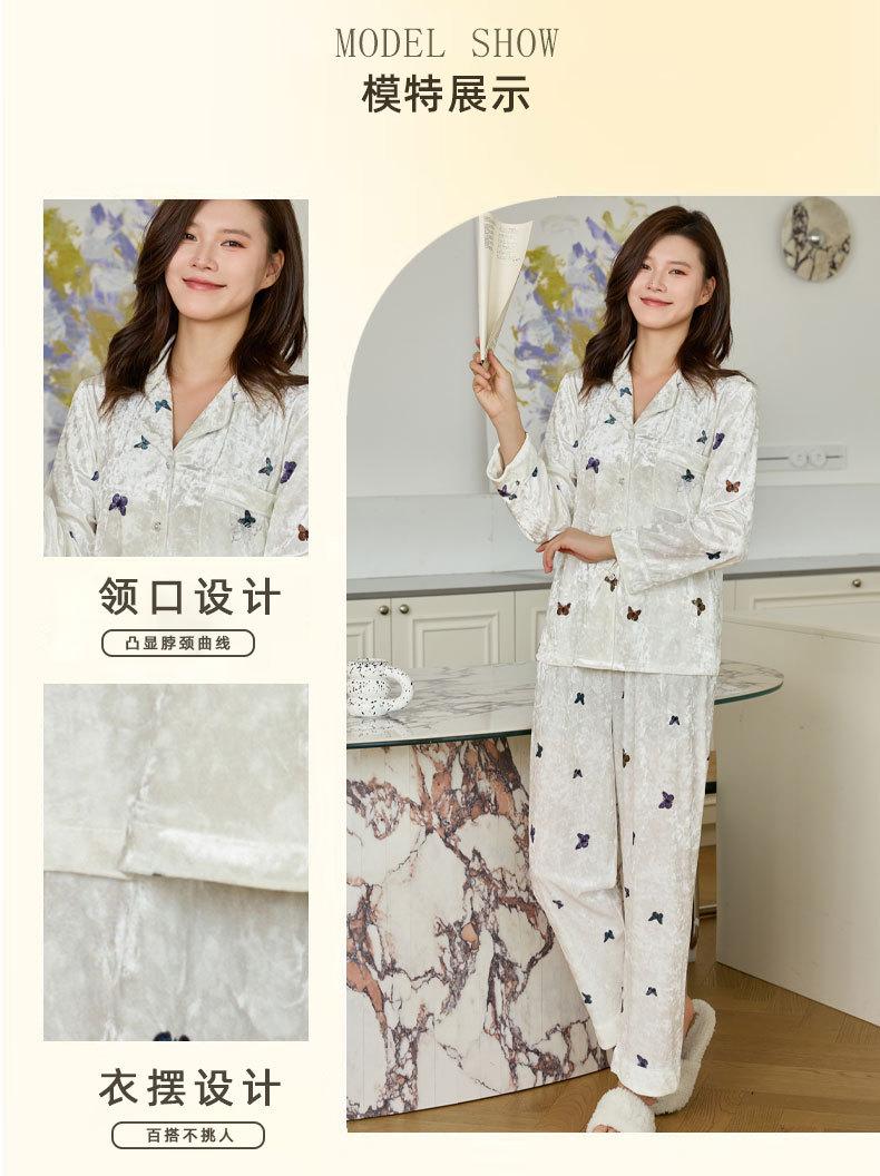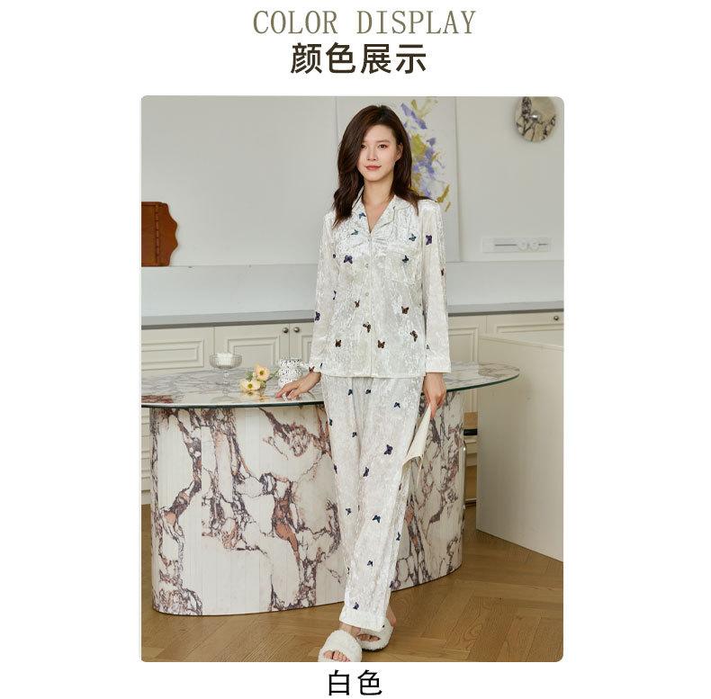 2025 Pijama Nuevo de Terciopelo Dorado para Mujer Manga Larga Pantalón Largo Dulce Estampado Colorido de Mariposas Conjunto para Estar en Casa Se Puede Usar Afuera
