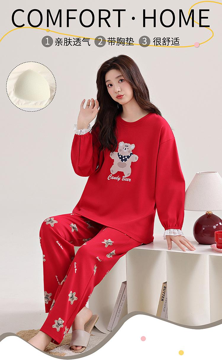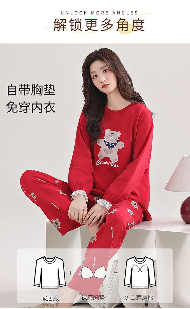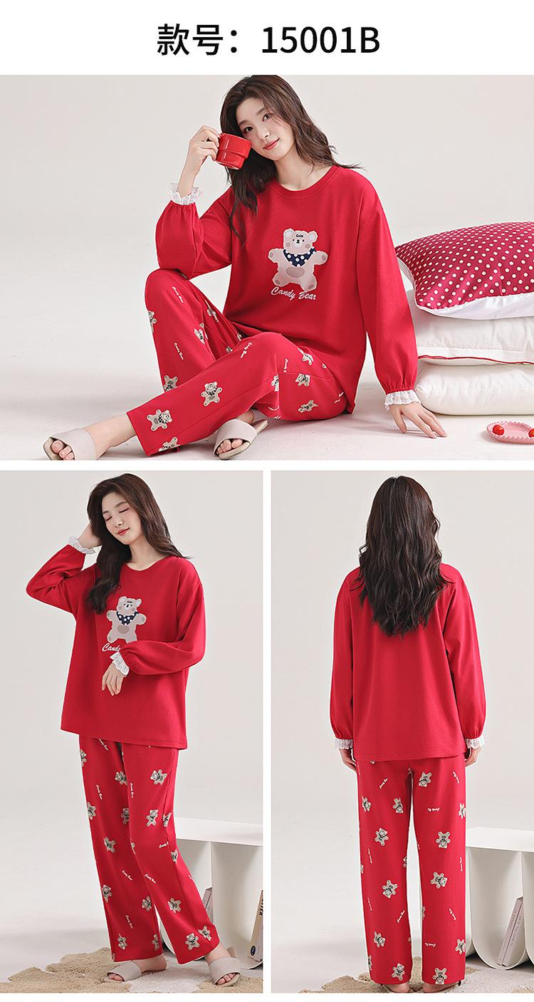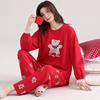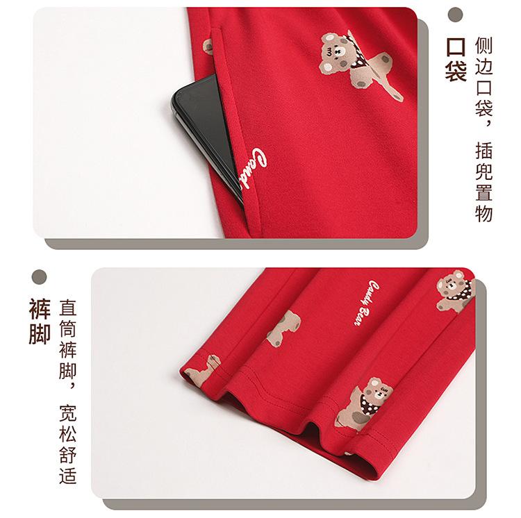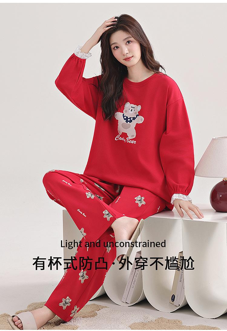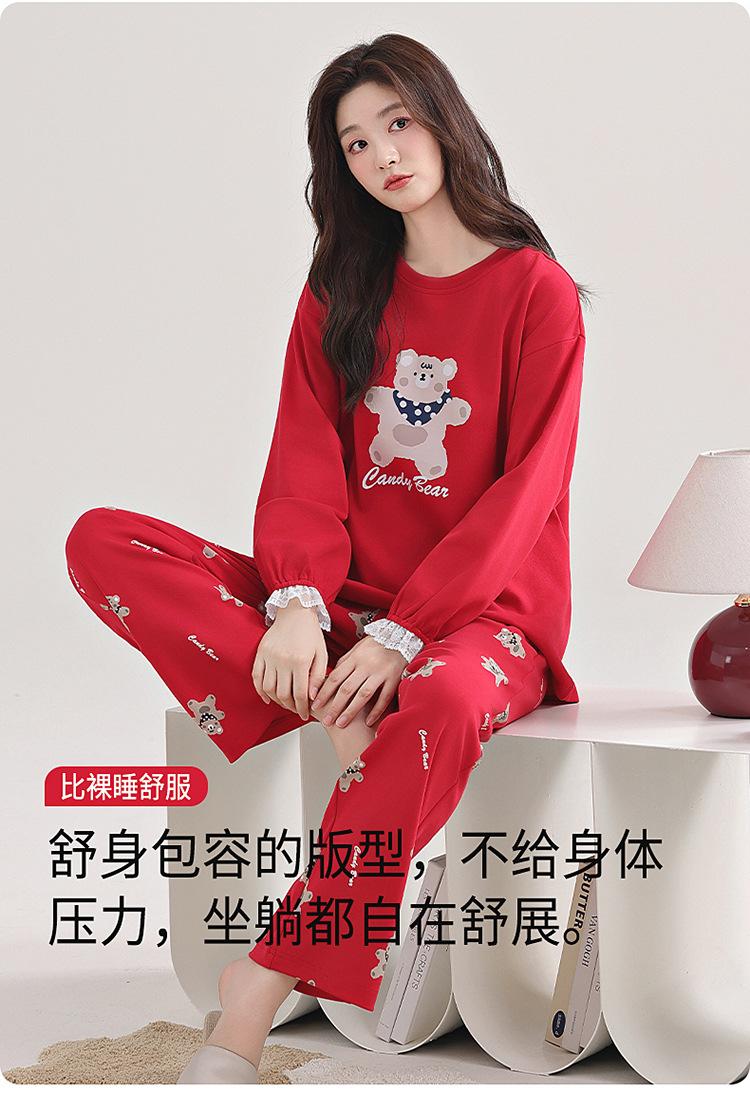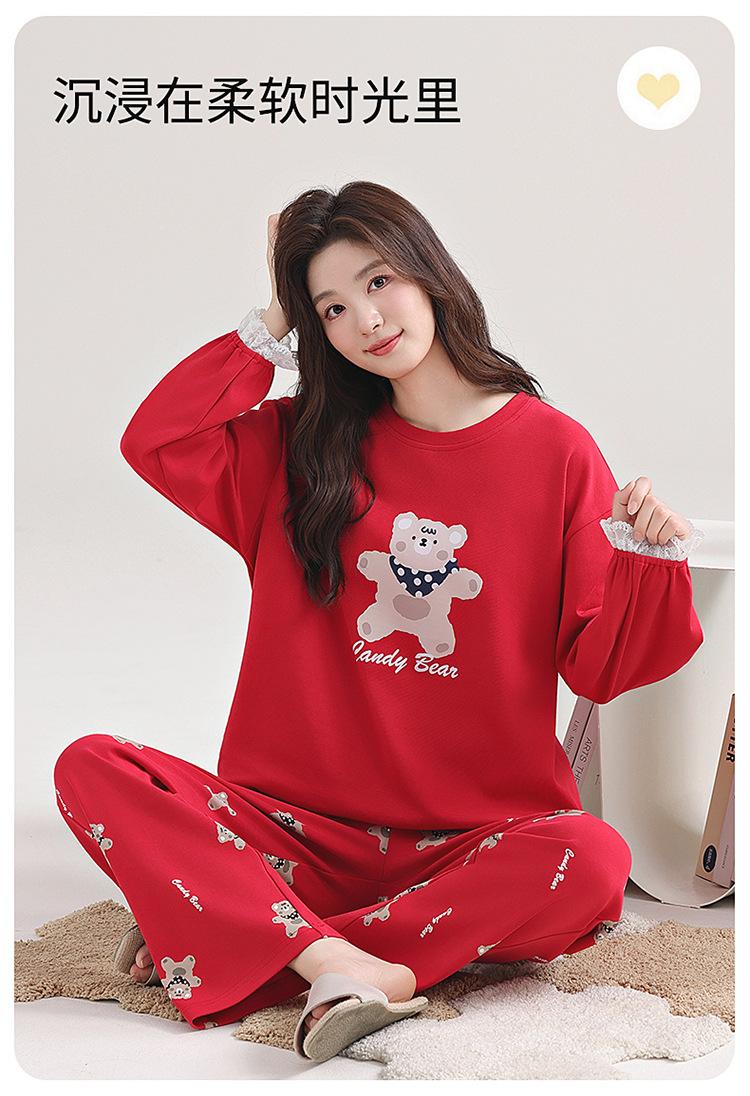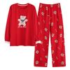 Pijama de Algodón Puro para Mujer Primavera y Otoño Manga Larga Pantalón Largo Sencillo Casual de Alta Gama Rojo Dibujos Animados Conjunto de Ropa para el Hogar