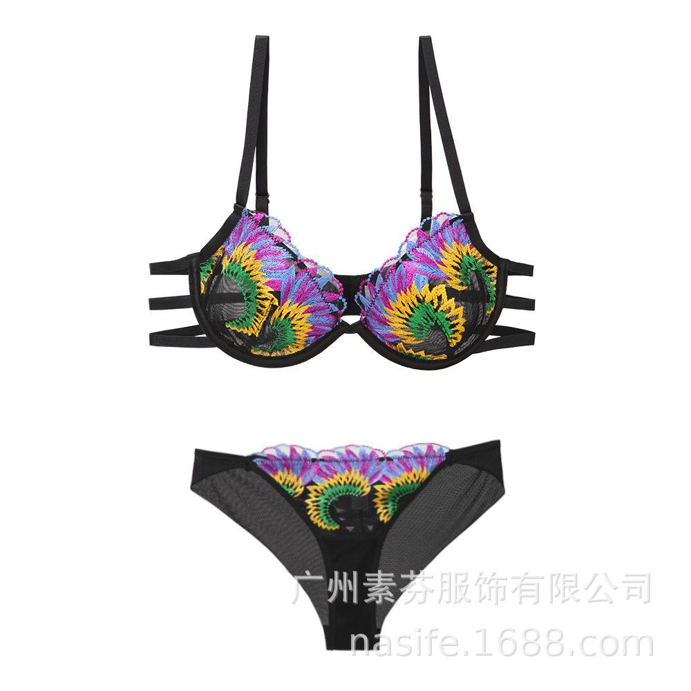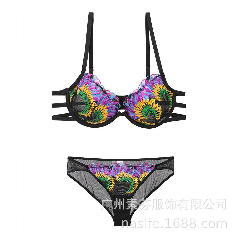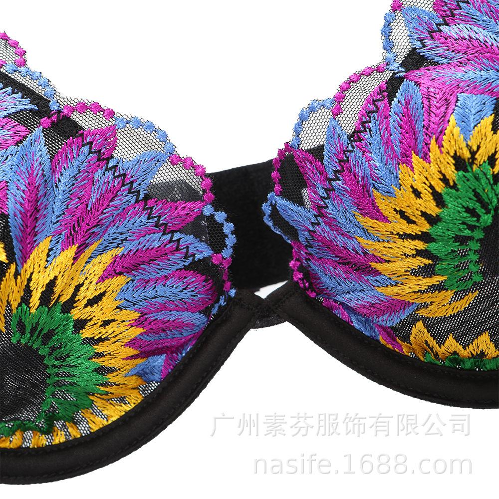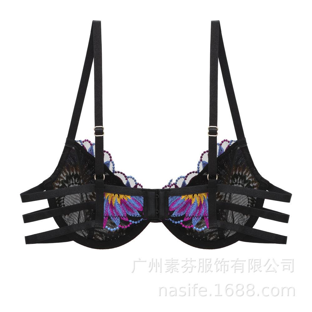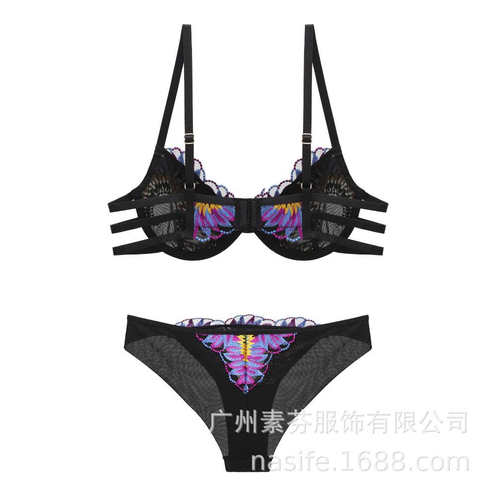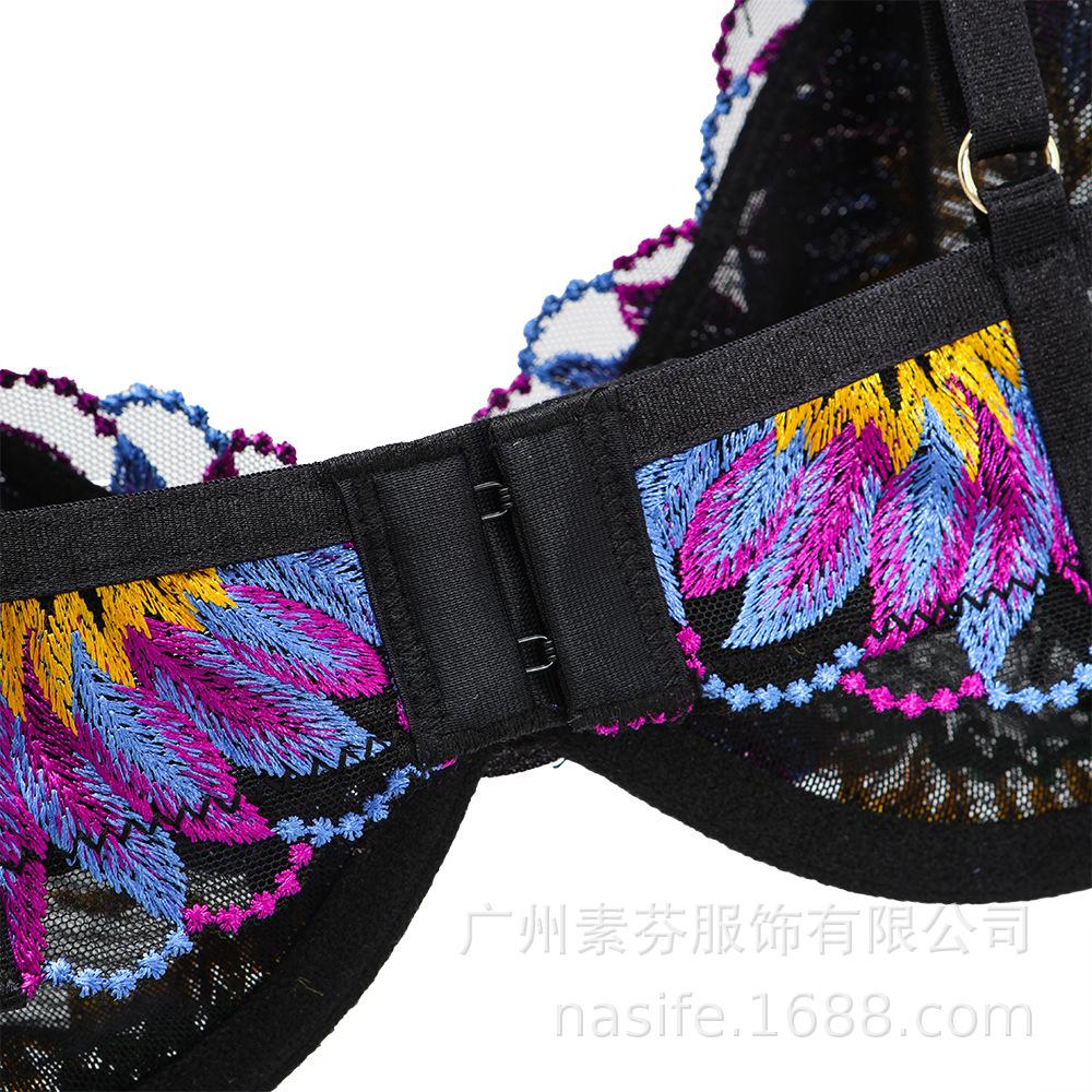 Conjunto de brasier push-up con aros de encaje sexy transfronterizo, bordado, malla ultrafina, pecho grande luce pequeño