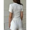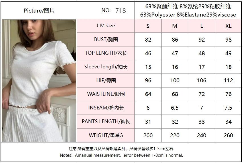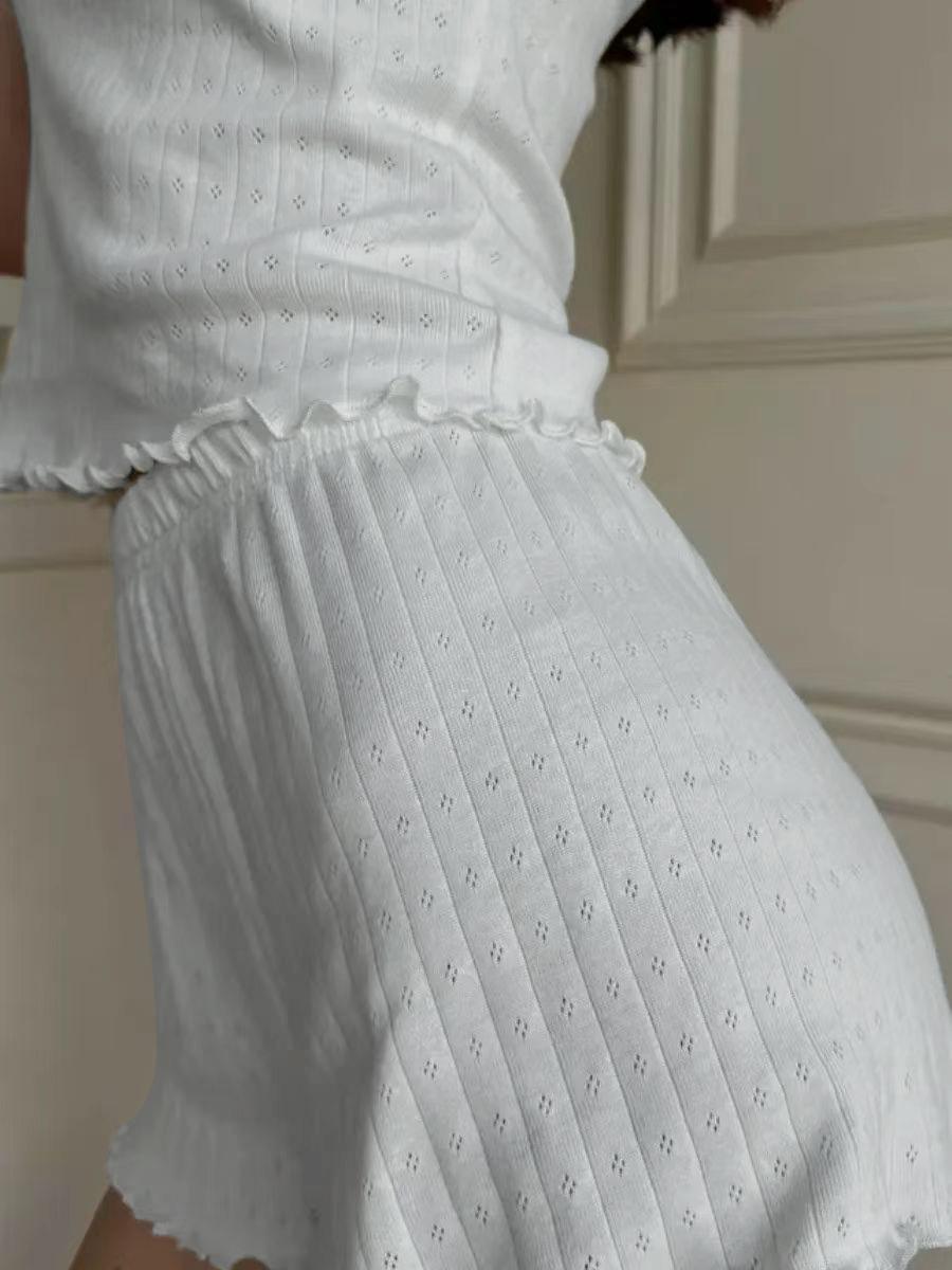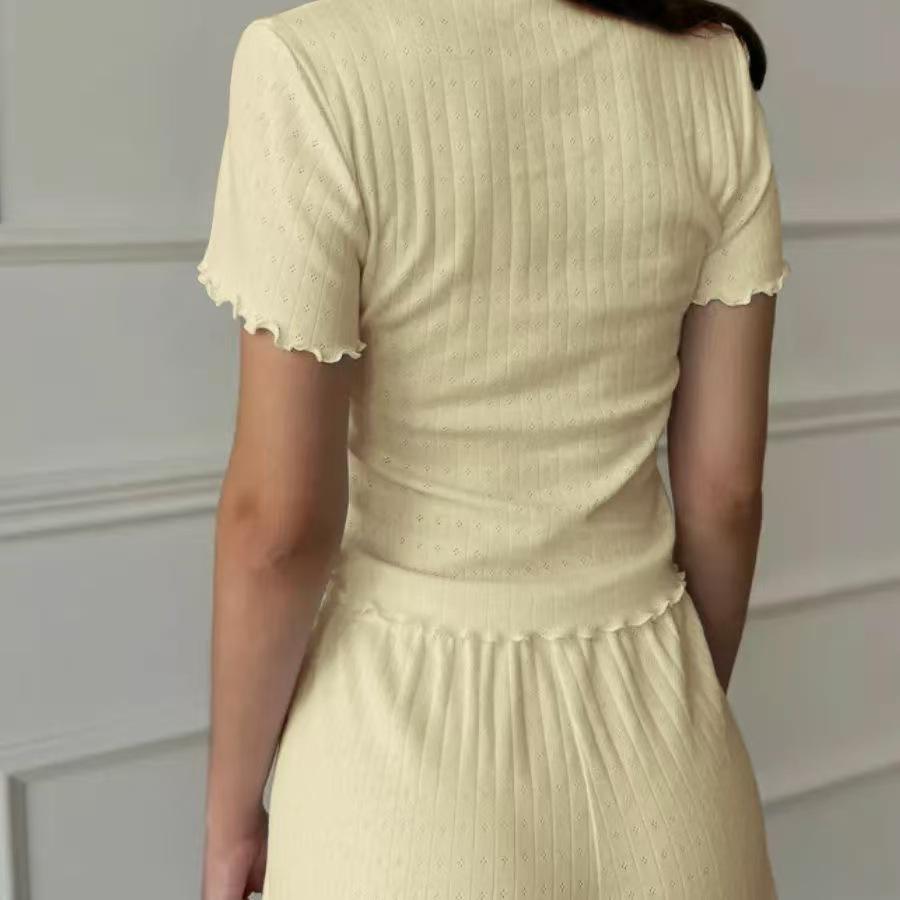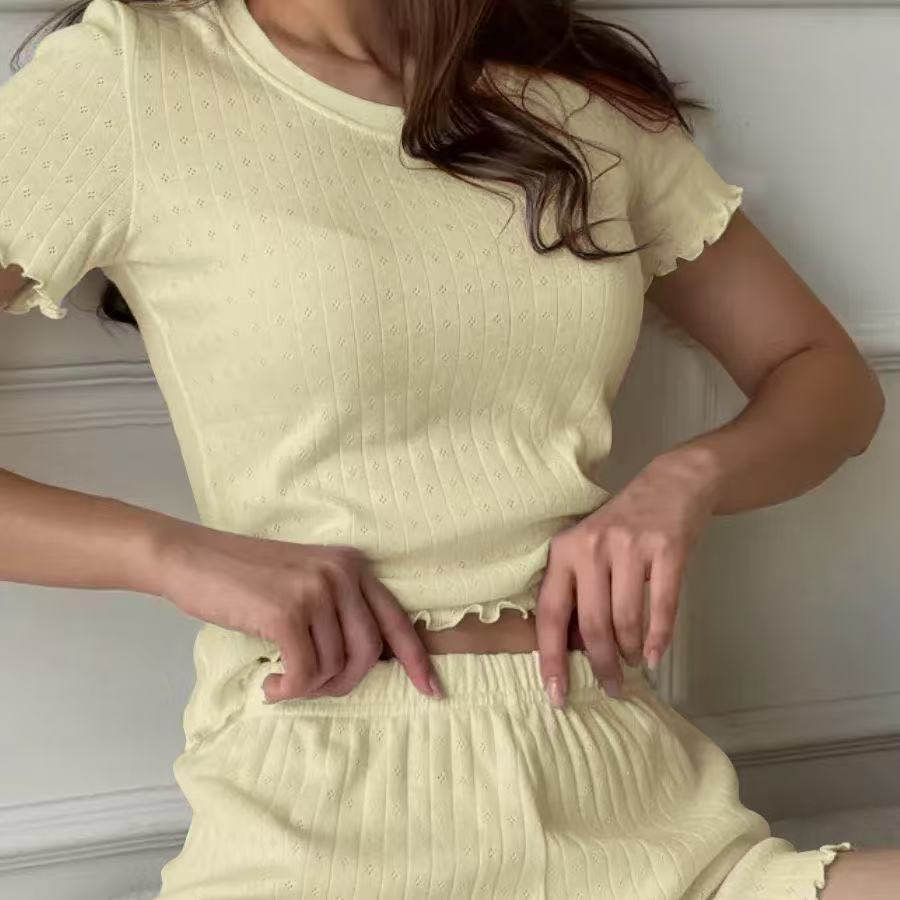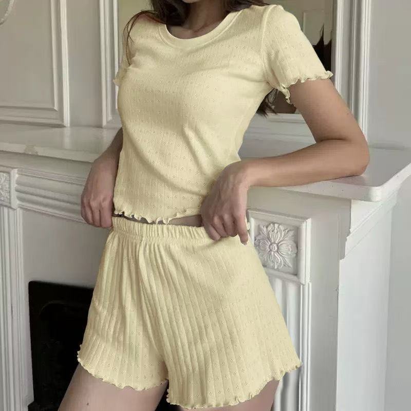 Conjunto Casual de Moda Europea y Americana 2025 Jacquard Adorno de Volantes Adelgazante Temperamento Hogar Cuello Redondo Manga Corta Shorts Conjunto de Dos Piezas