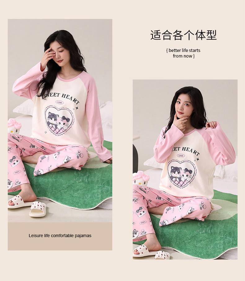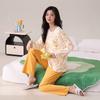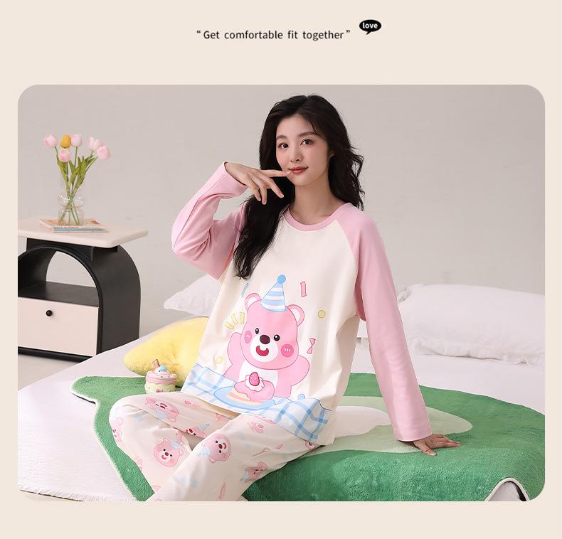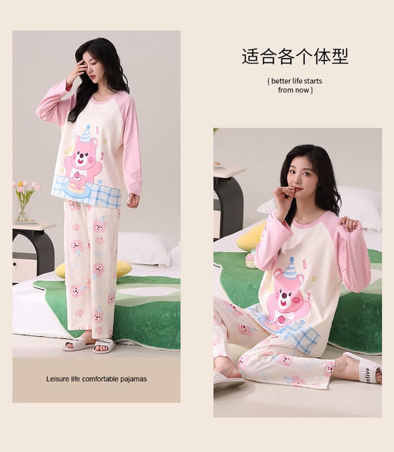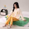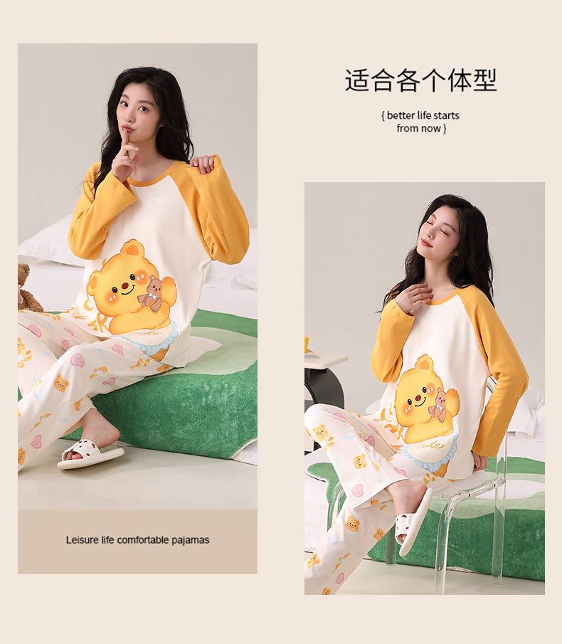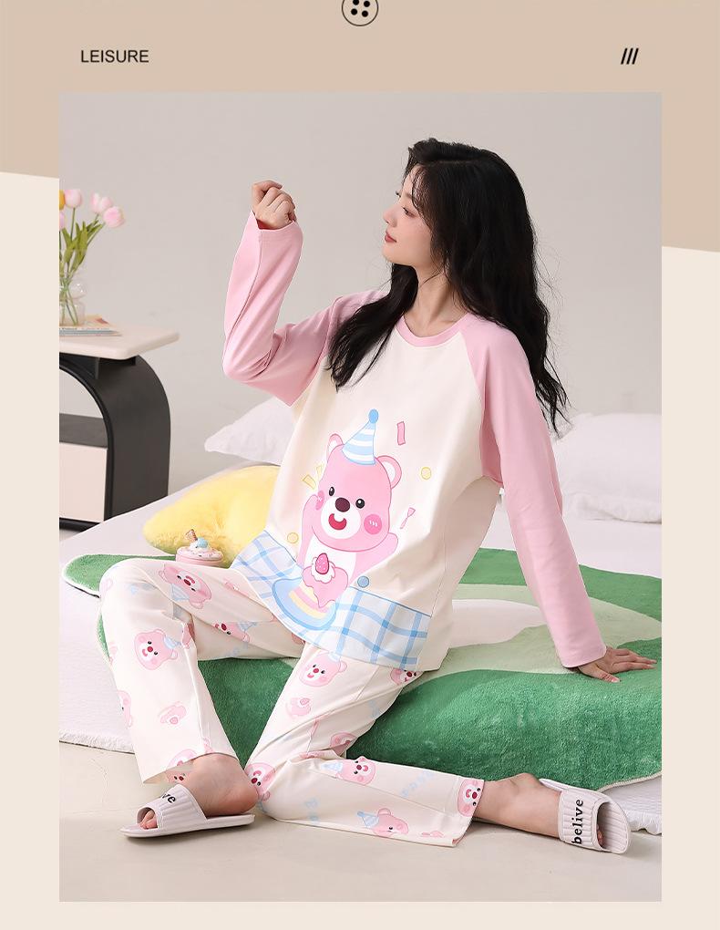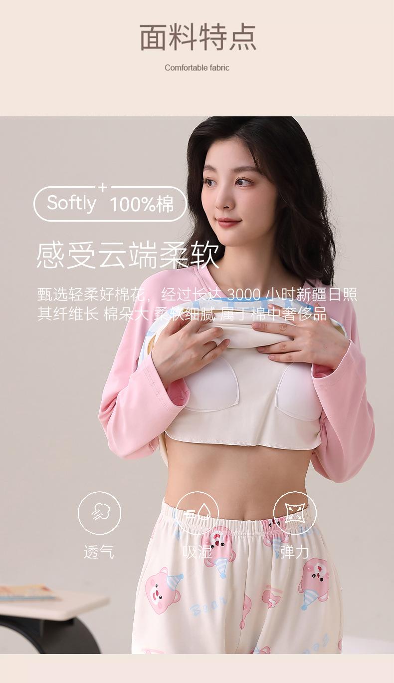 Otoño Nuevo Estilo con Almohadilla en el Pecho Pijama de Algodón Puro para Mujer Manga Larga Holgado Cuello Redondo Talla Grande Conjunto Estampado Lindo Ropa de Casa