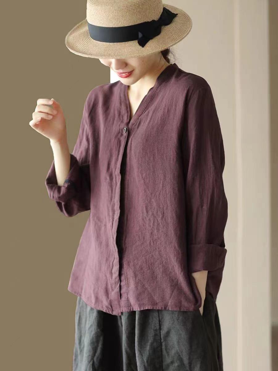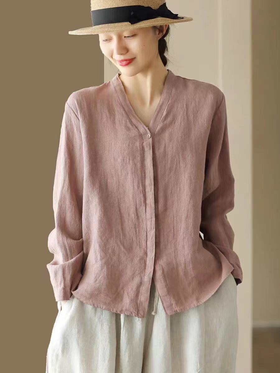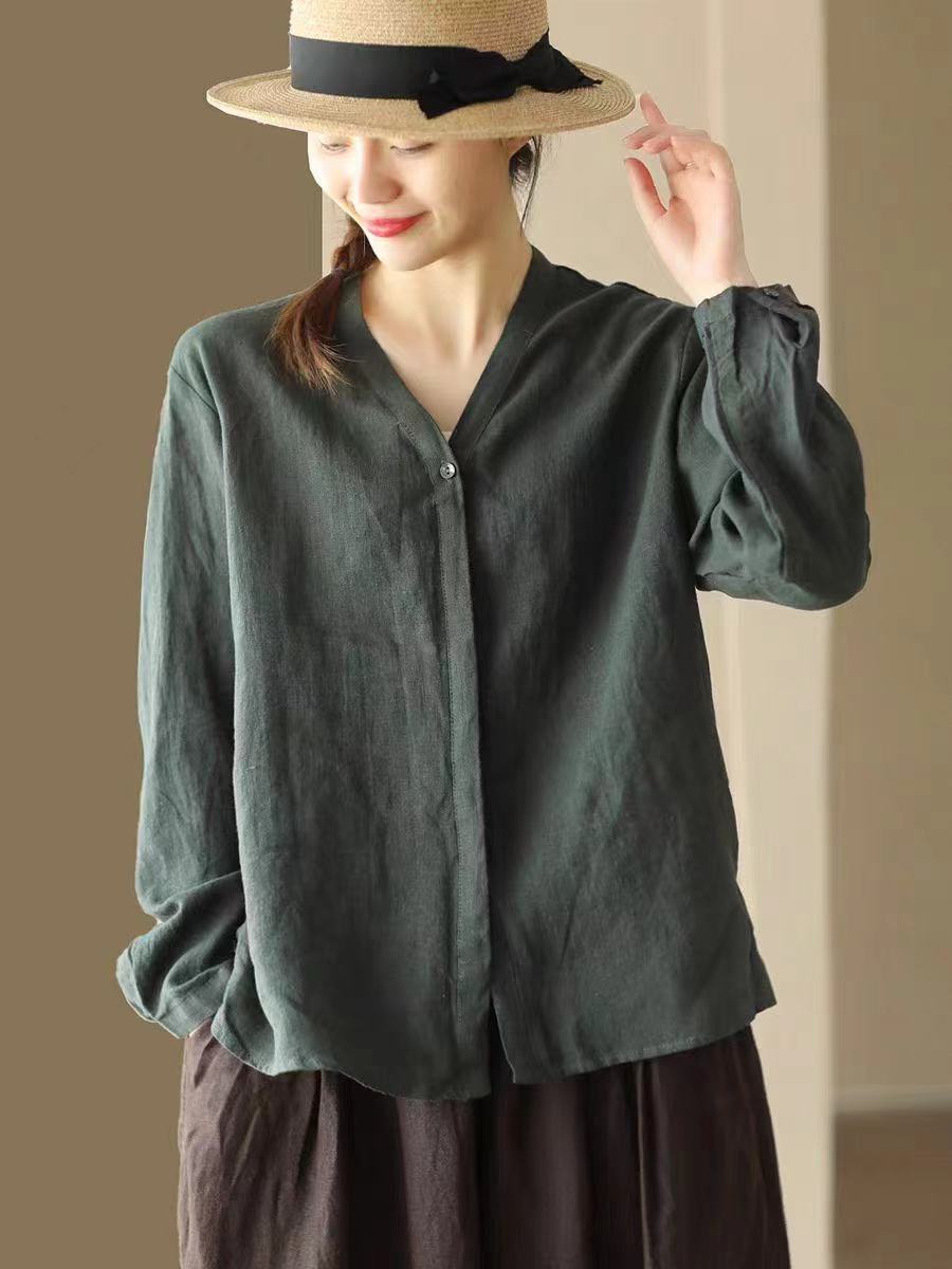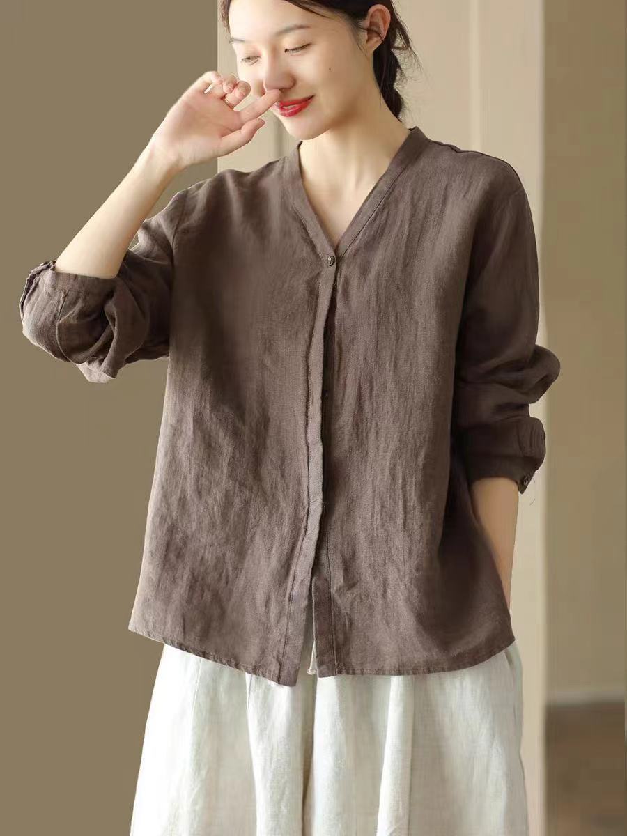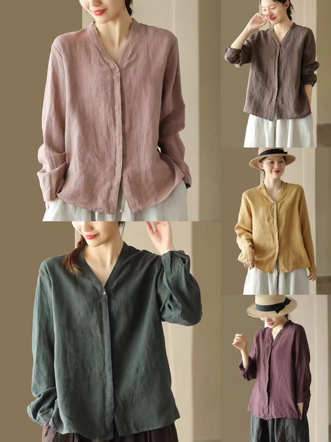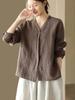 Cárdigan de temperamento literario nuevo de primavera y otoño 2025, camisa suelta casual de lino, manga larga, cuello en V, corto para mujer