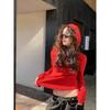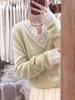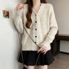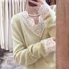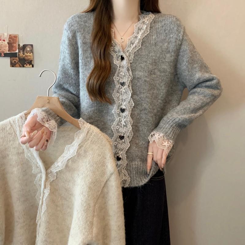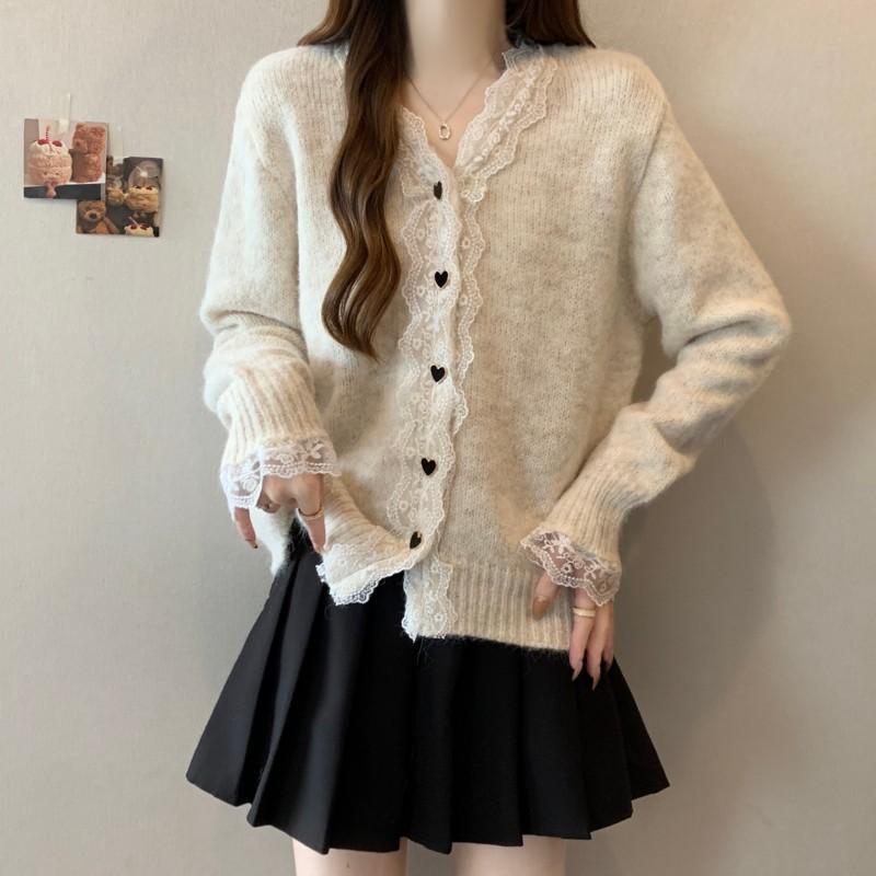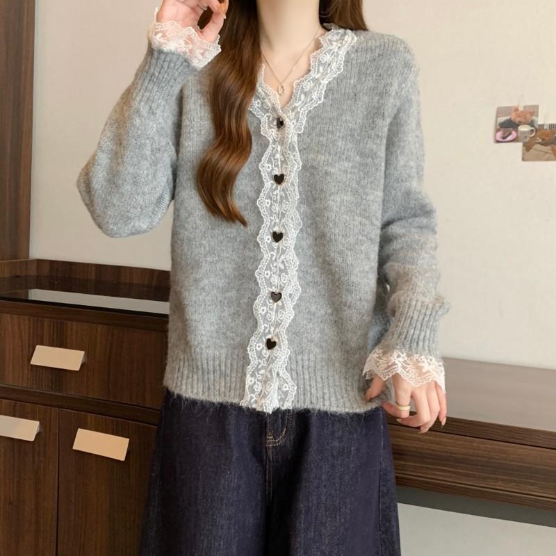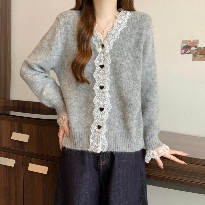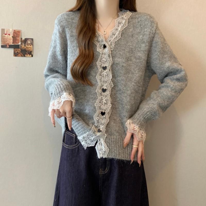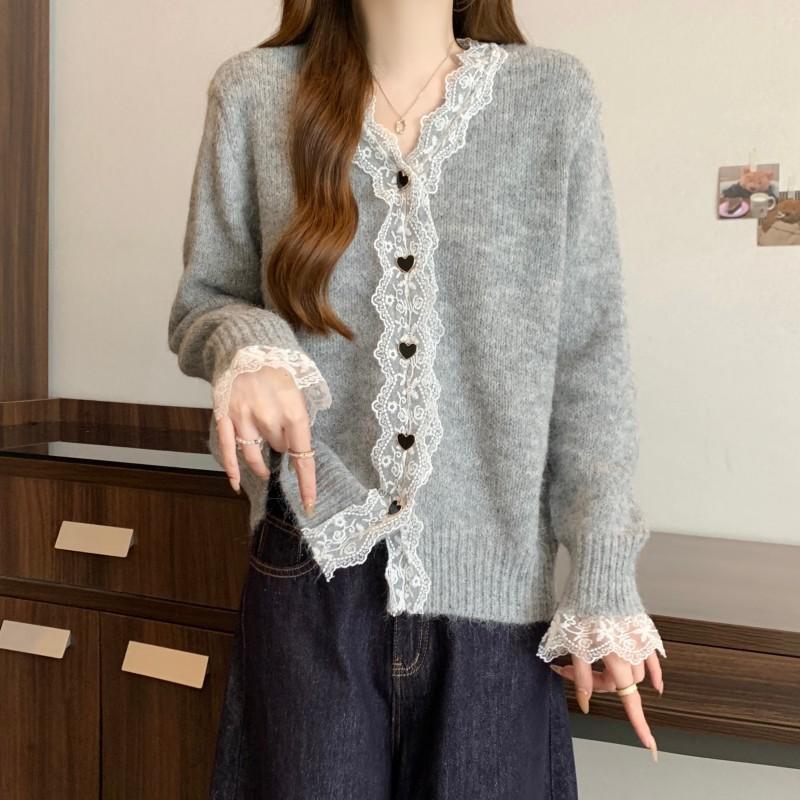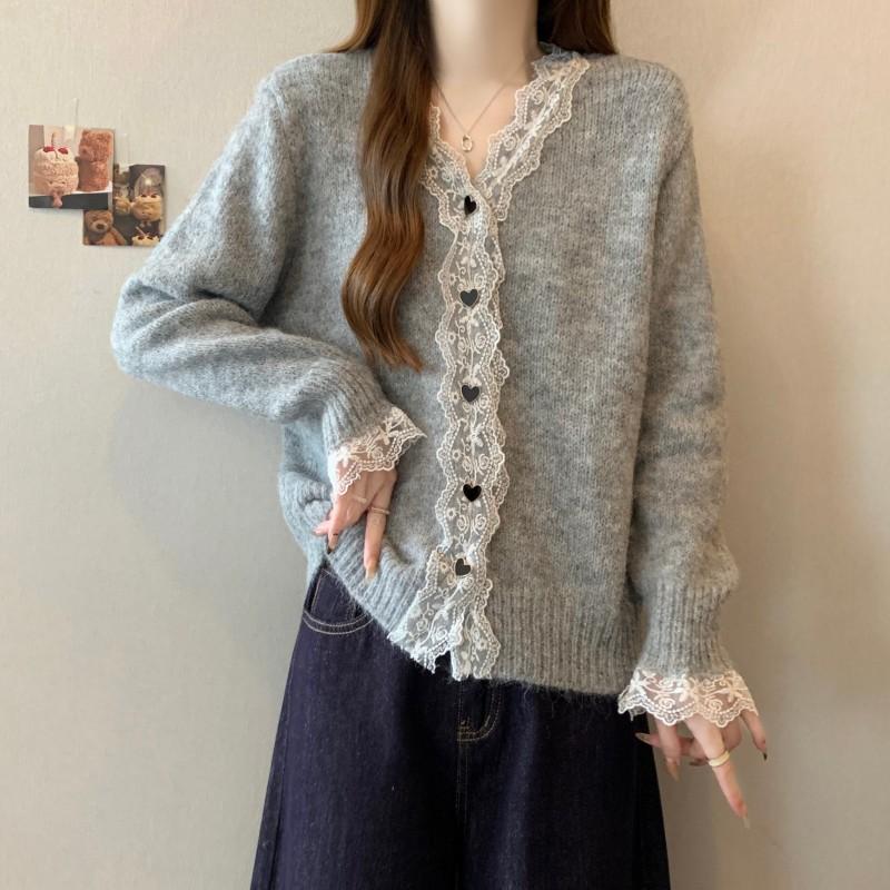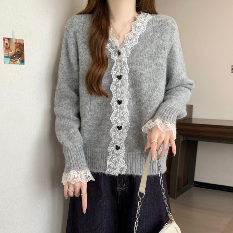 Cárdigan de Punto de Manga Larga con Cuello Empalmado y Adorno de Encaje Francés Nuevo de Otoño e Invierno