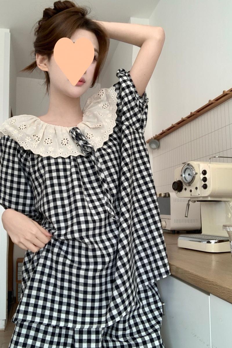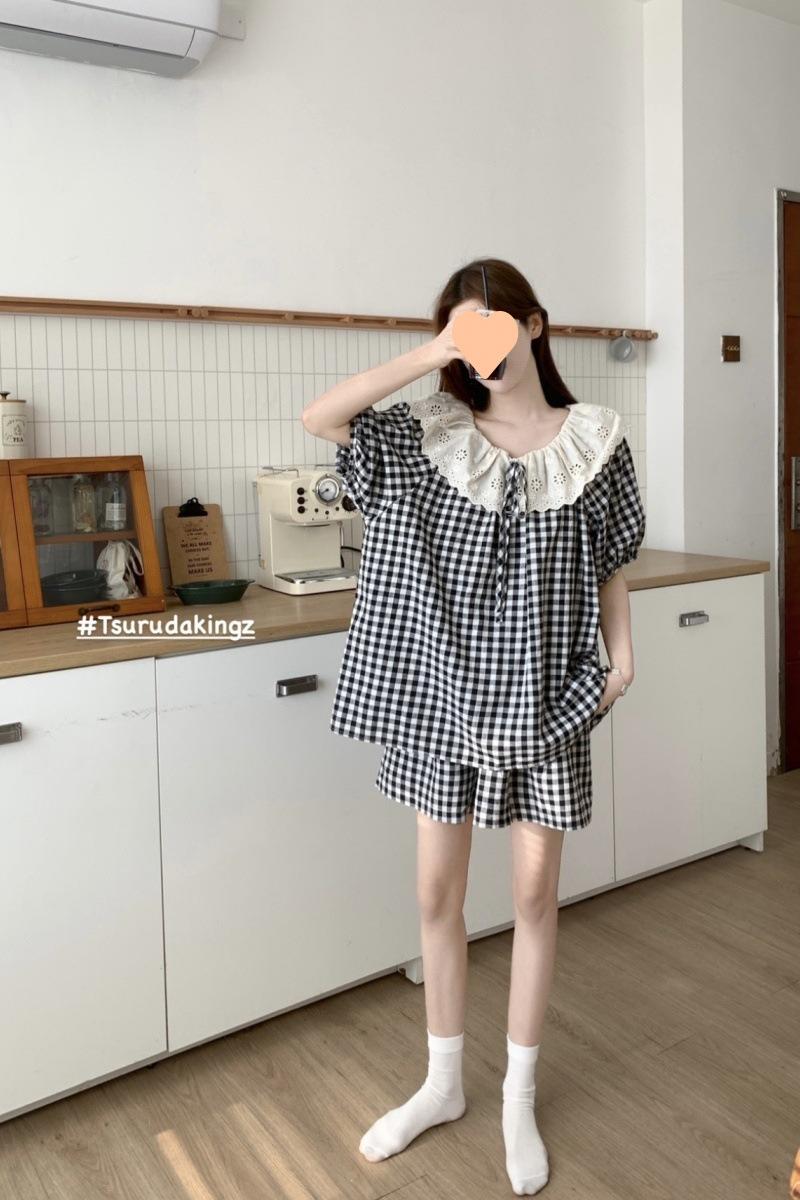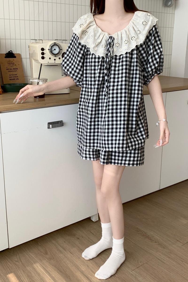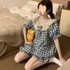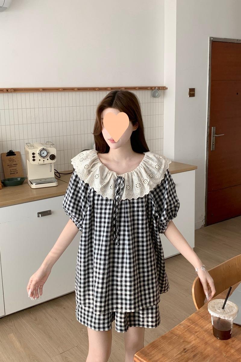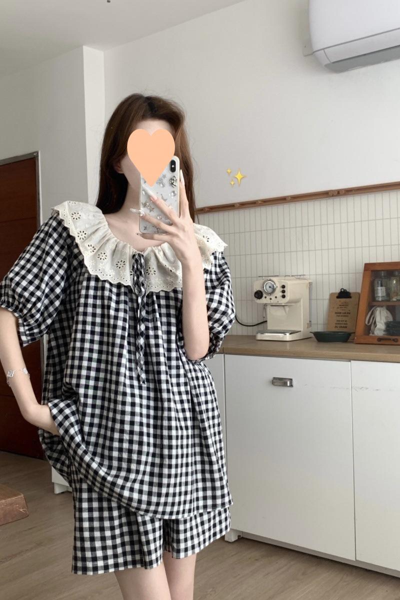 Estilo K Ins Encaje Dulce Cuadros Delgado Estudiante Chica Verano Manga Corta Shorts Ropa para Casa Pijama Conjunto Exterior