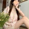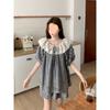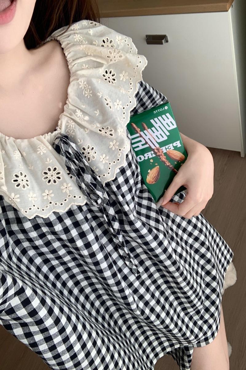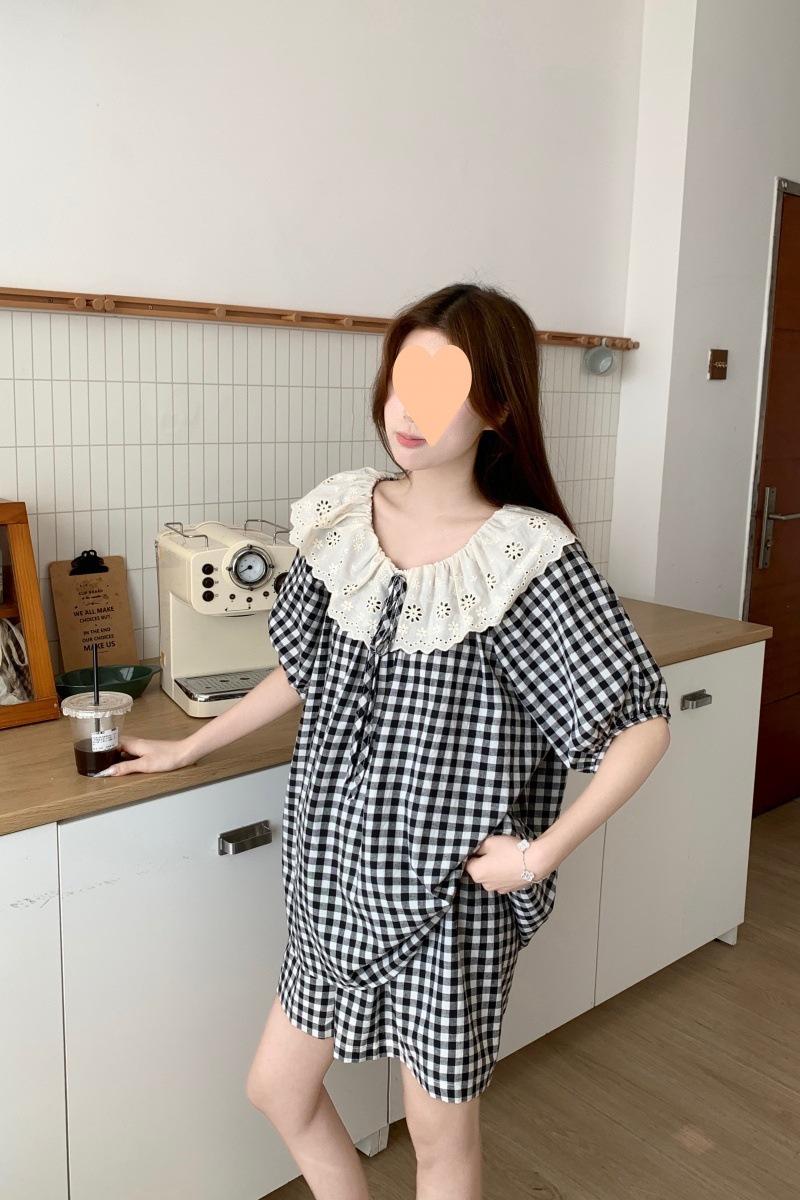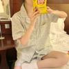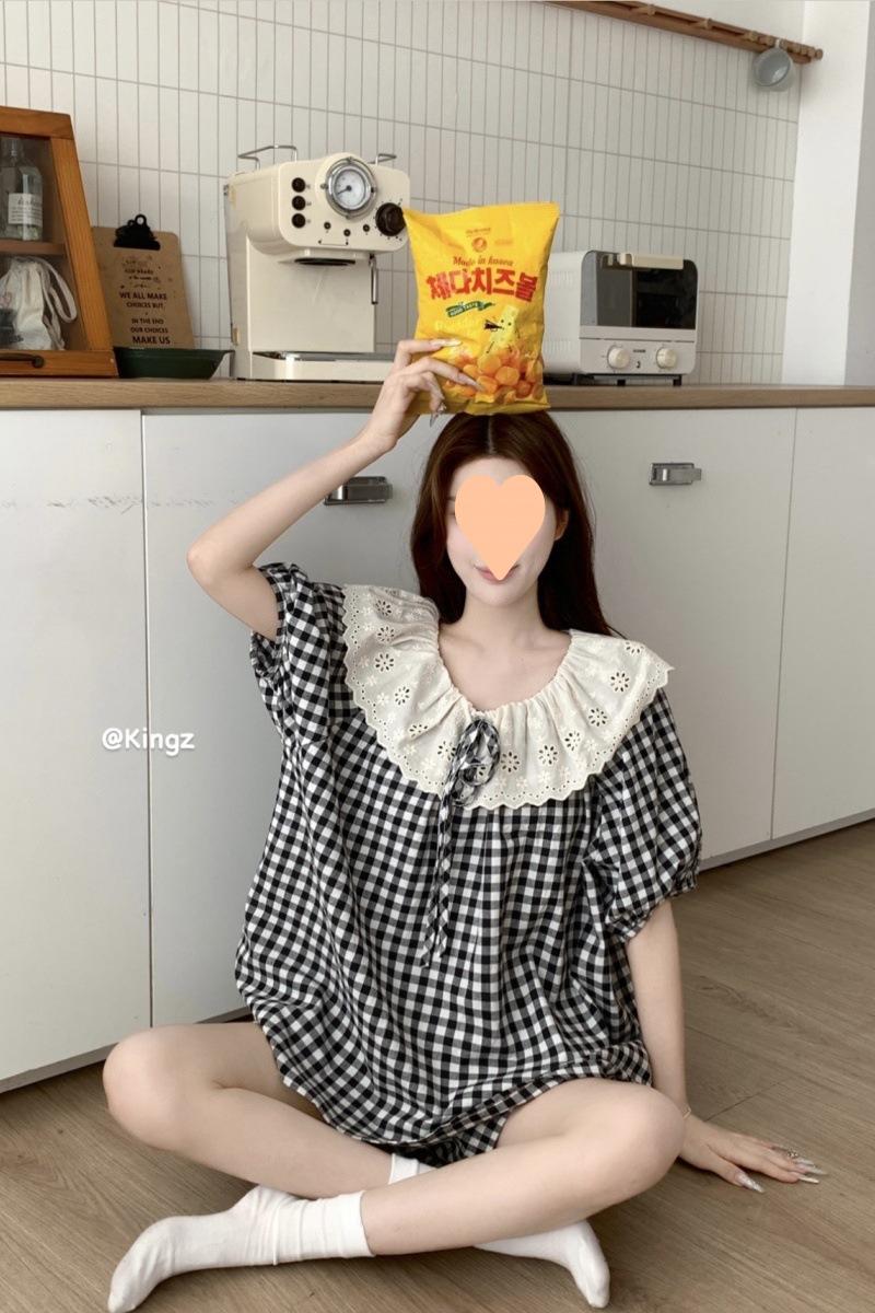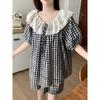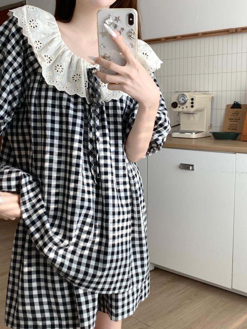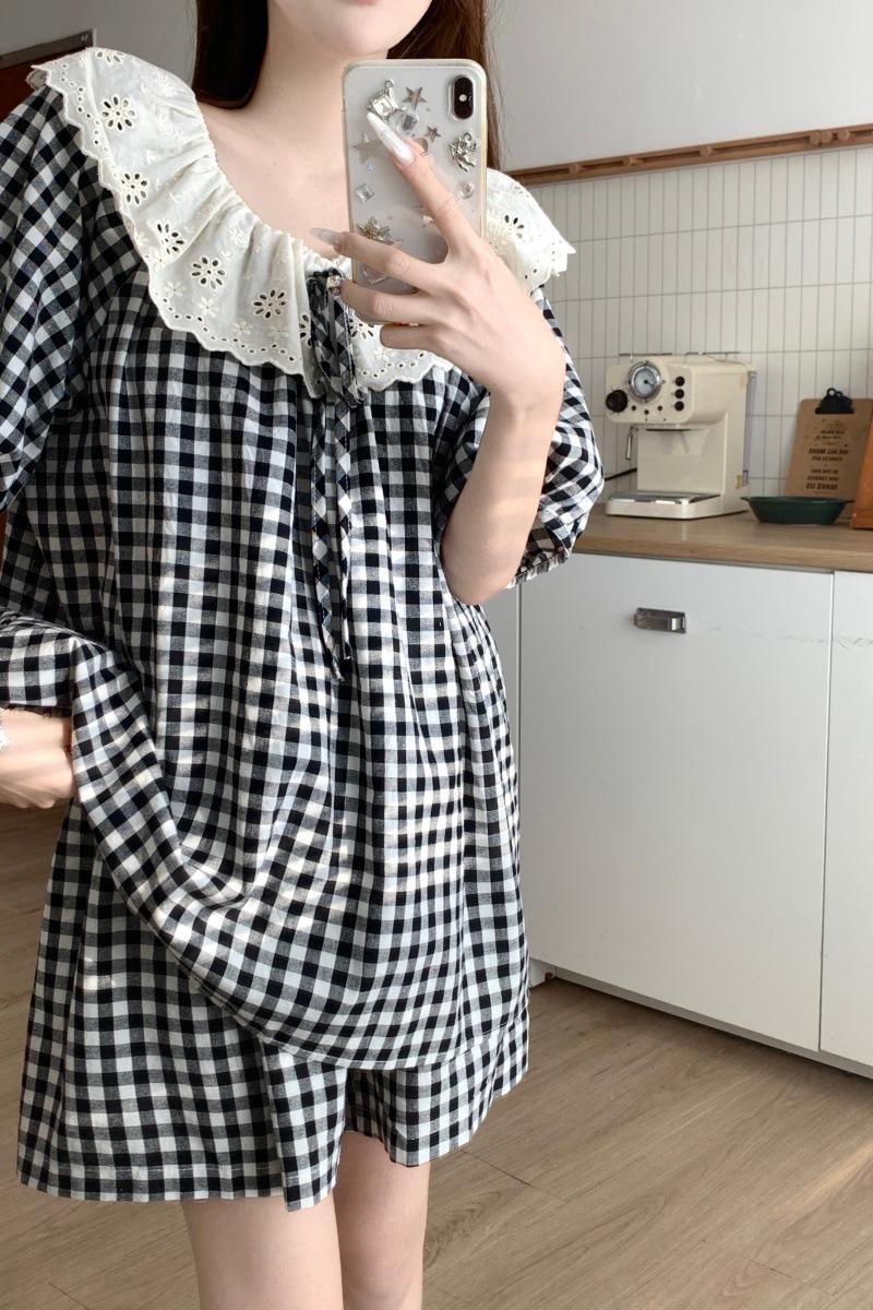 Estilo K Ins Encaje Dulce Cuadros Delgado Estudiante Chica Verano Manga Corta Shorts Ropa para Casa Pijama Conjunto Exterior