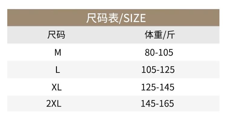 M (80-105 pounds), L (105-125 pounds), XL (125-145 pounds), 2XL (145-165 catties)