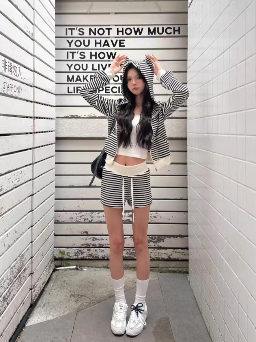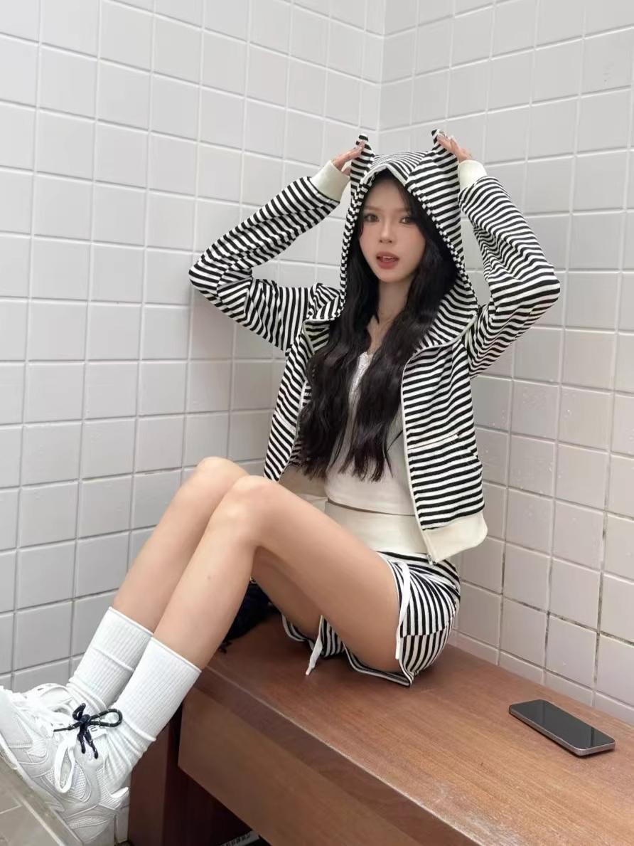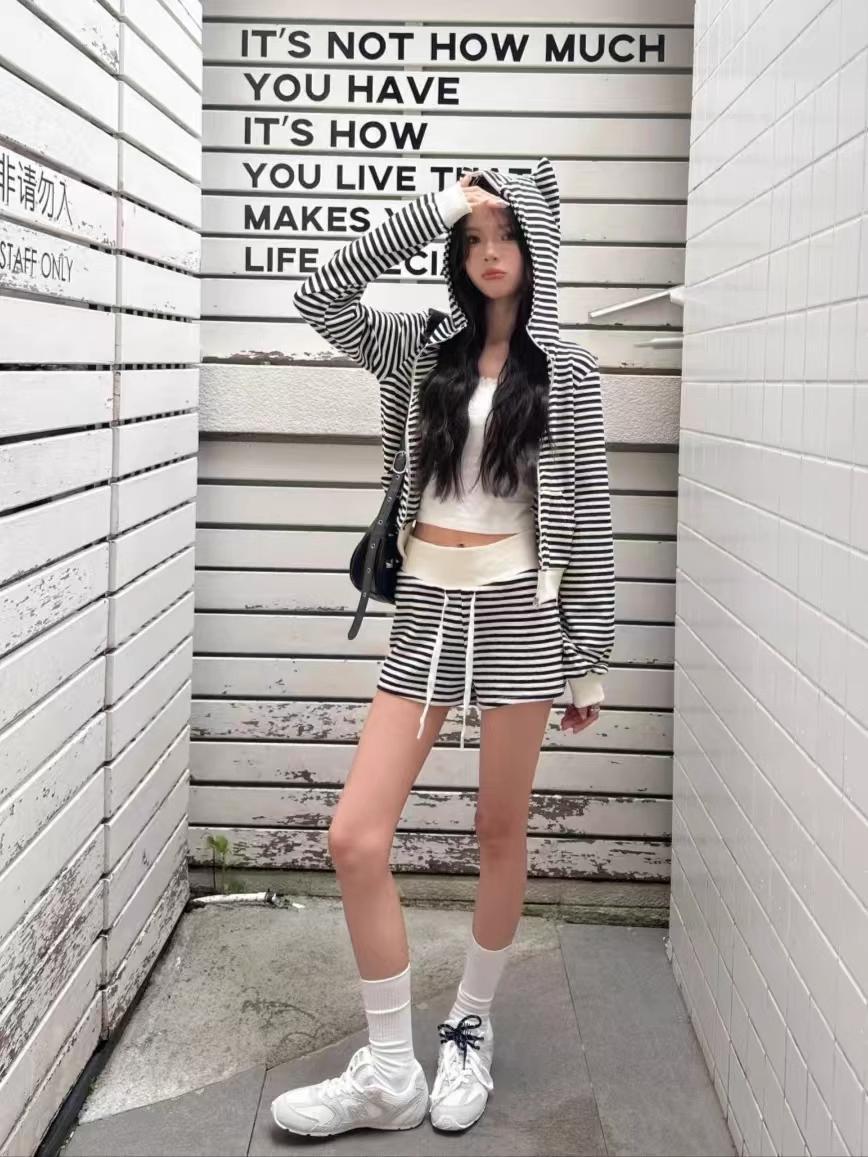Top holgado de manga larga con capucha a rayas estilo coreano, pijama de verano, pantalones para dormir, conjunto casual sexy para el hogar que se puede usar afuera