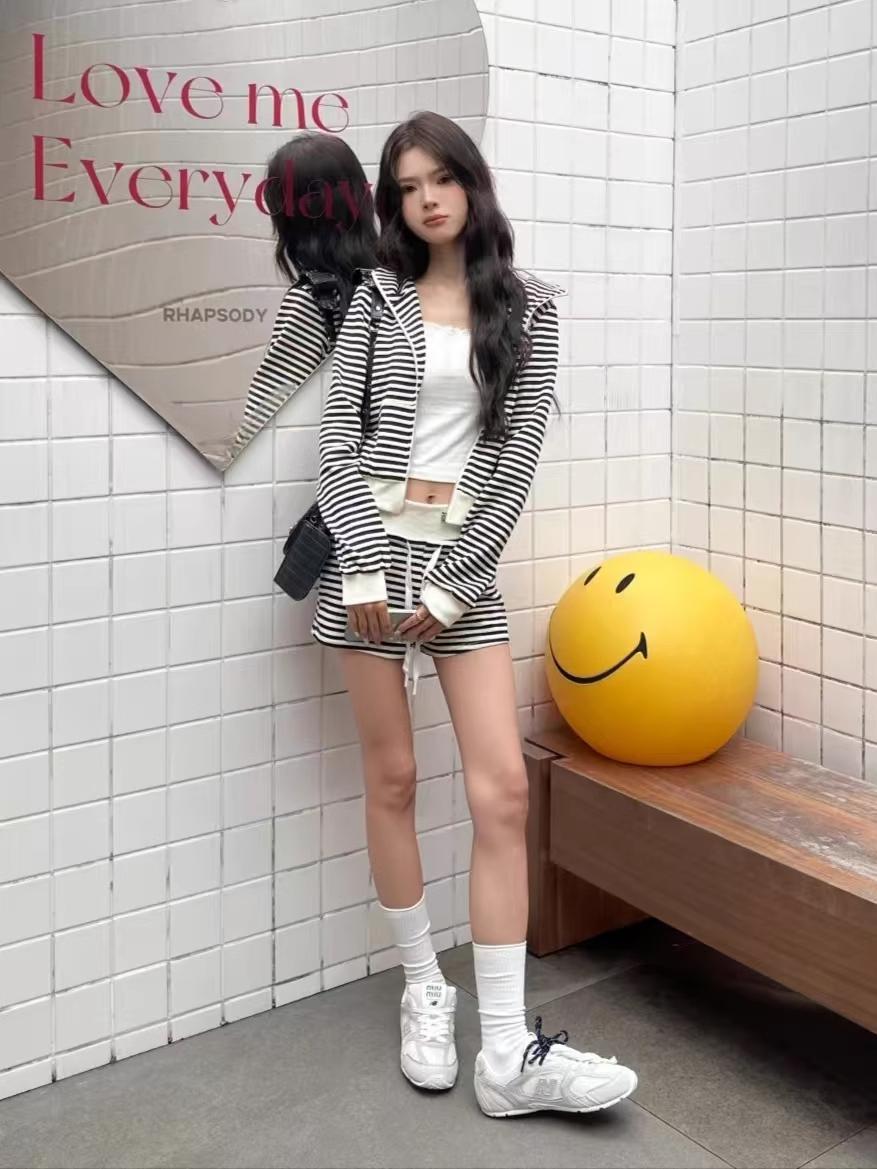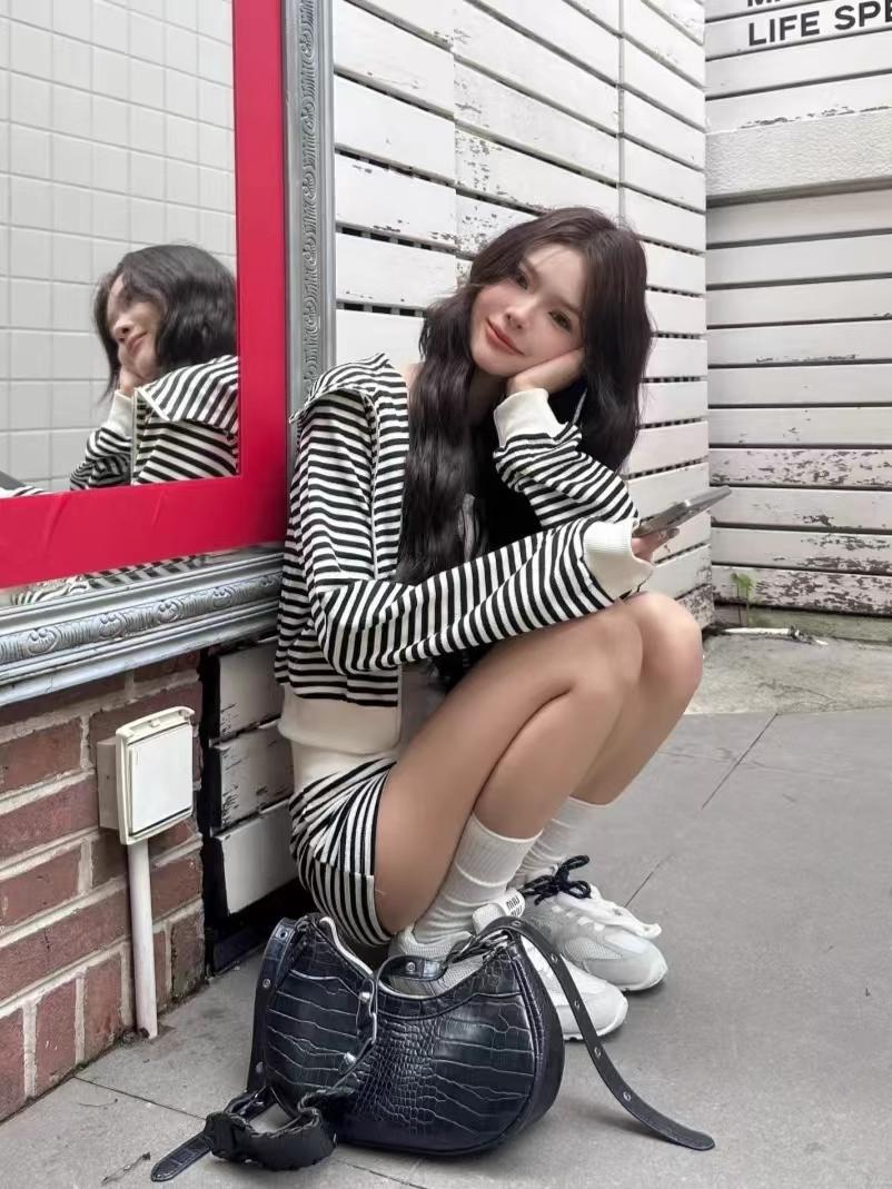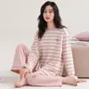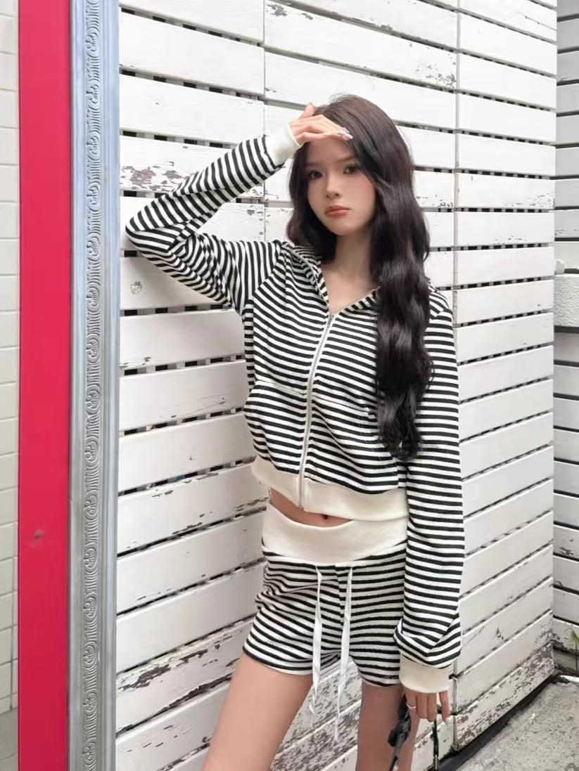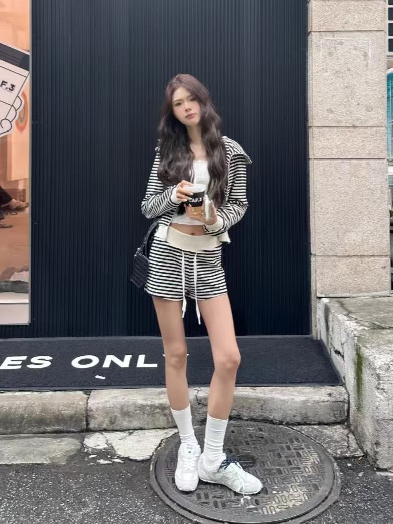 Top holgado de manga larga con capucha a rayas estilo coreano, pijama de verano, pantalones para dormir, conjunto casual sexy para el hogar que se puede usar afuera
