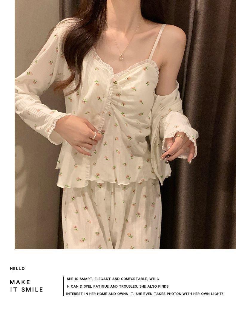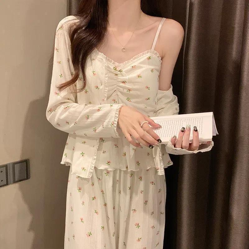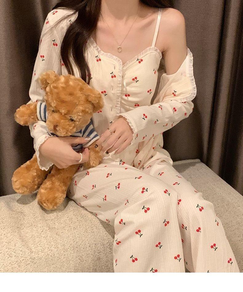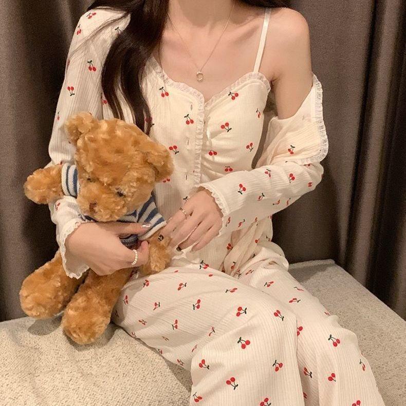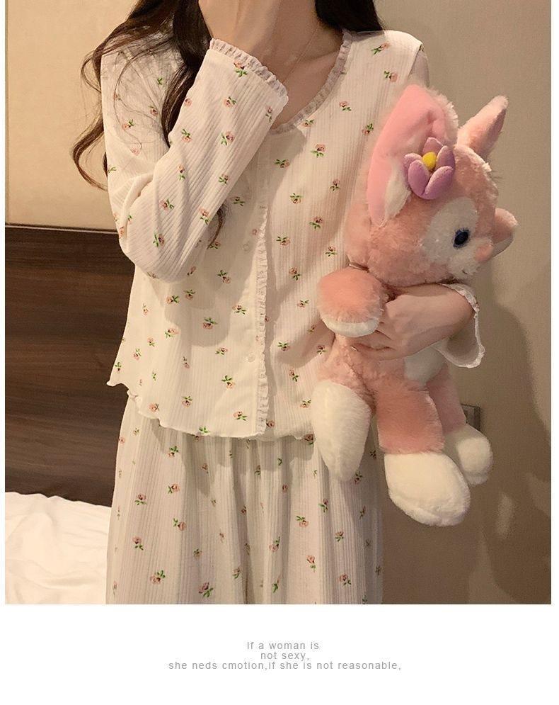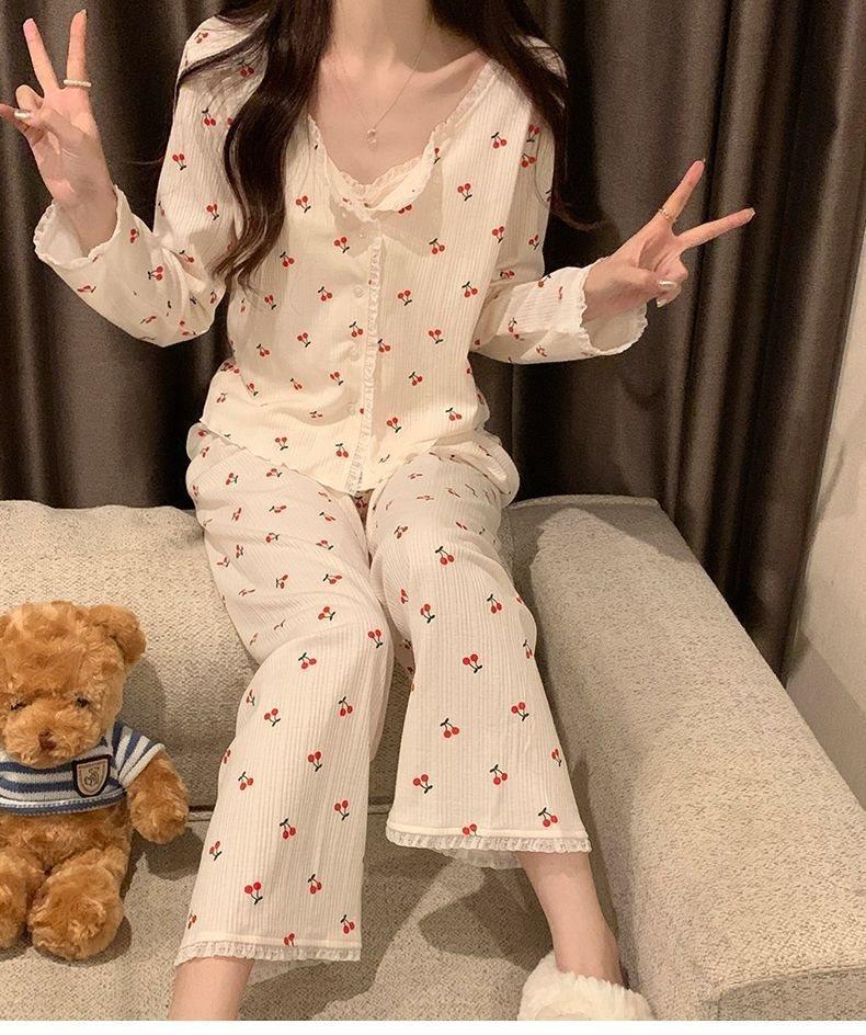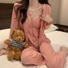 Pijama con Almohadillas para el Busto para Mujer Primavera y Otoño Estilo Pure Lust Pantalones de Manga Larga Dulce Casual Delgada Pequeña Conjunto para Estar en Casa