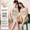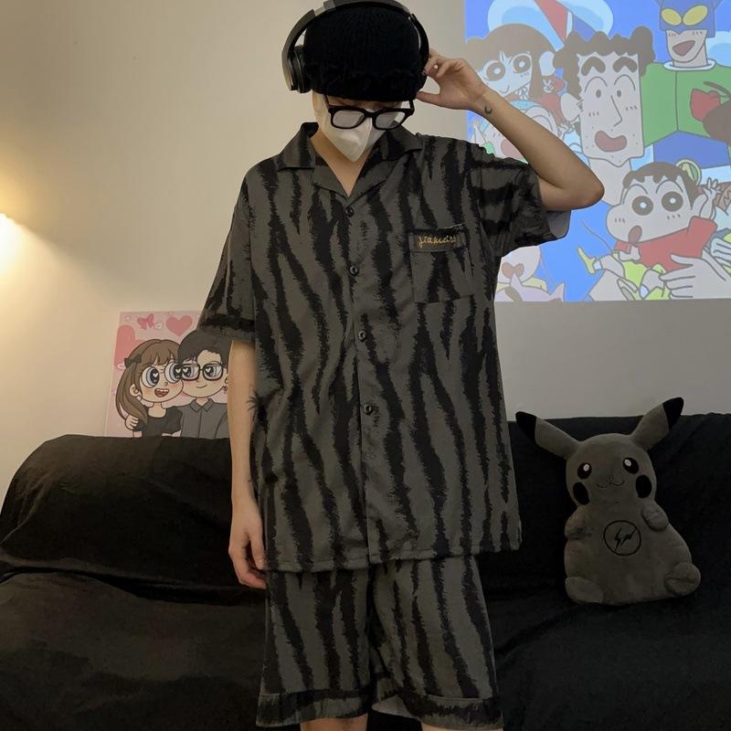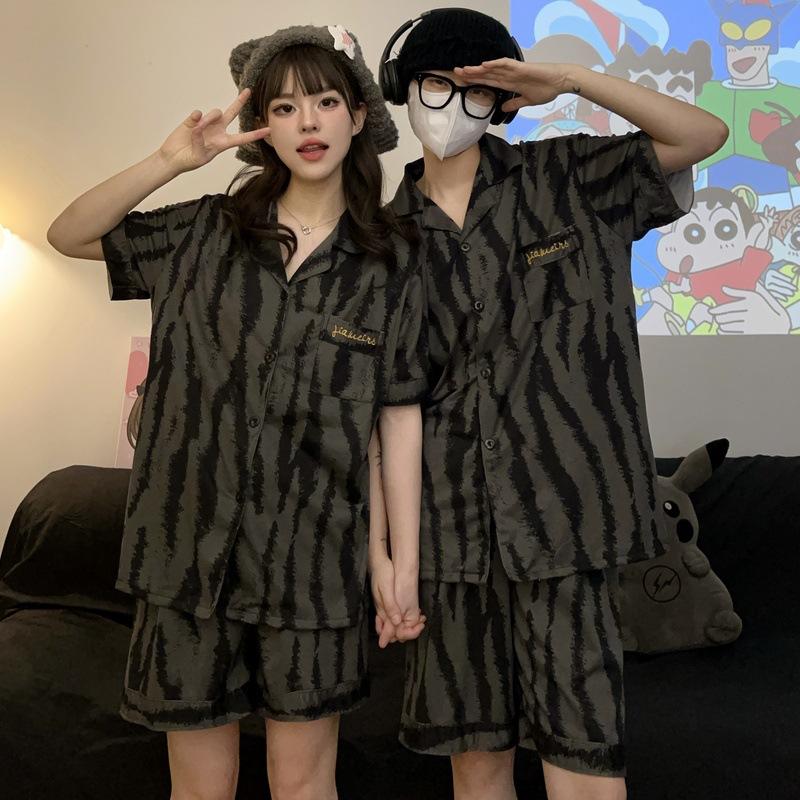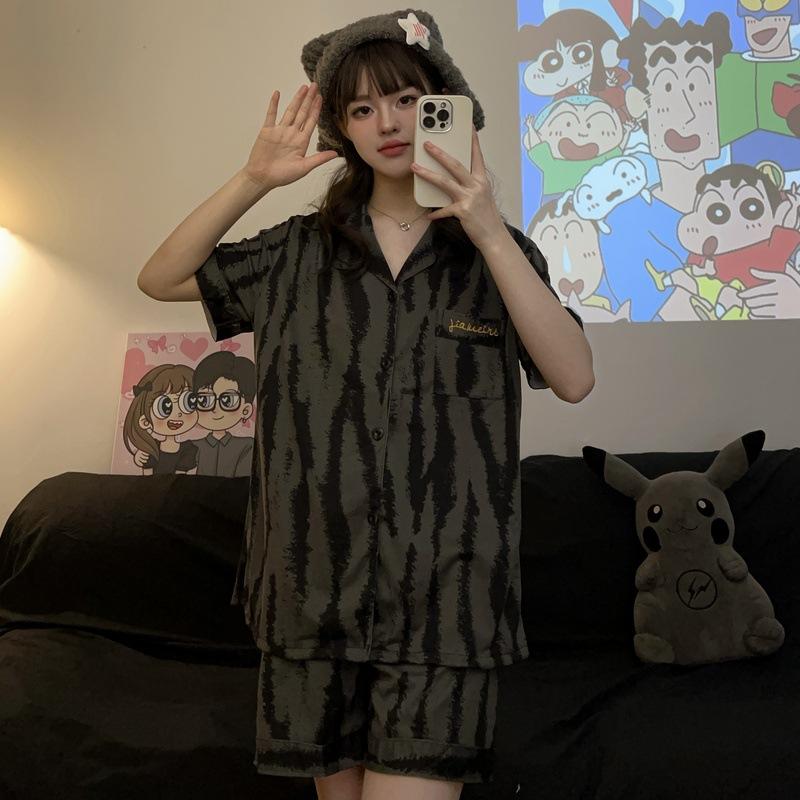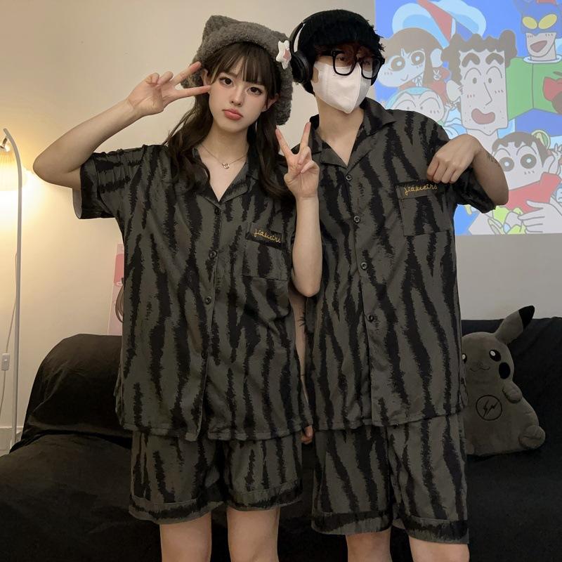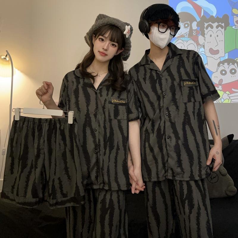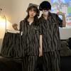 Pijama de Pareja en Stock de Fábrica Femenino Masculino de Alta Gama Rayado Negro Gris Primavera y Verano Manga Corta Shorts Sencillo Traje de Tres Piezas