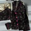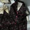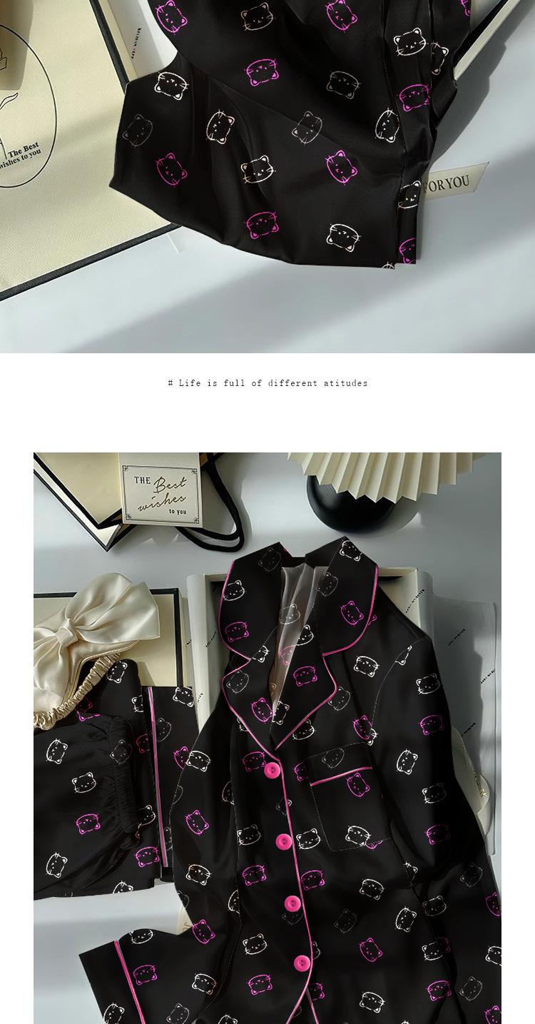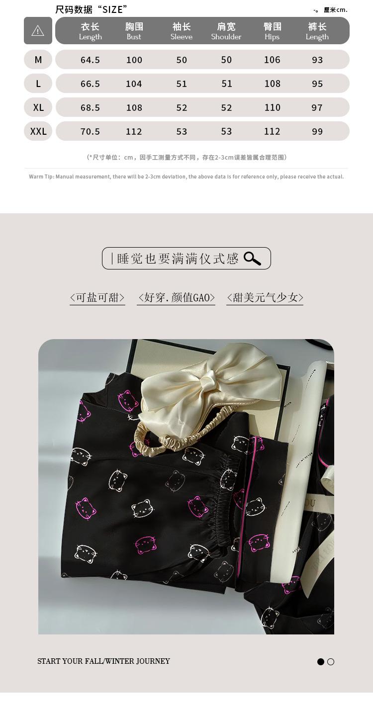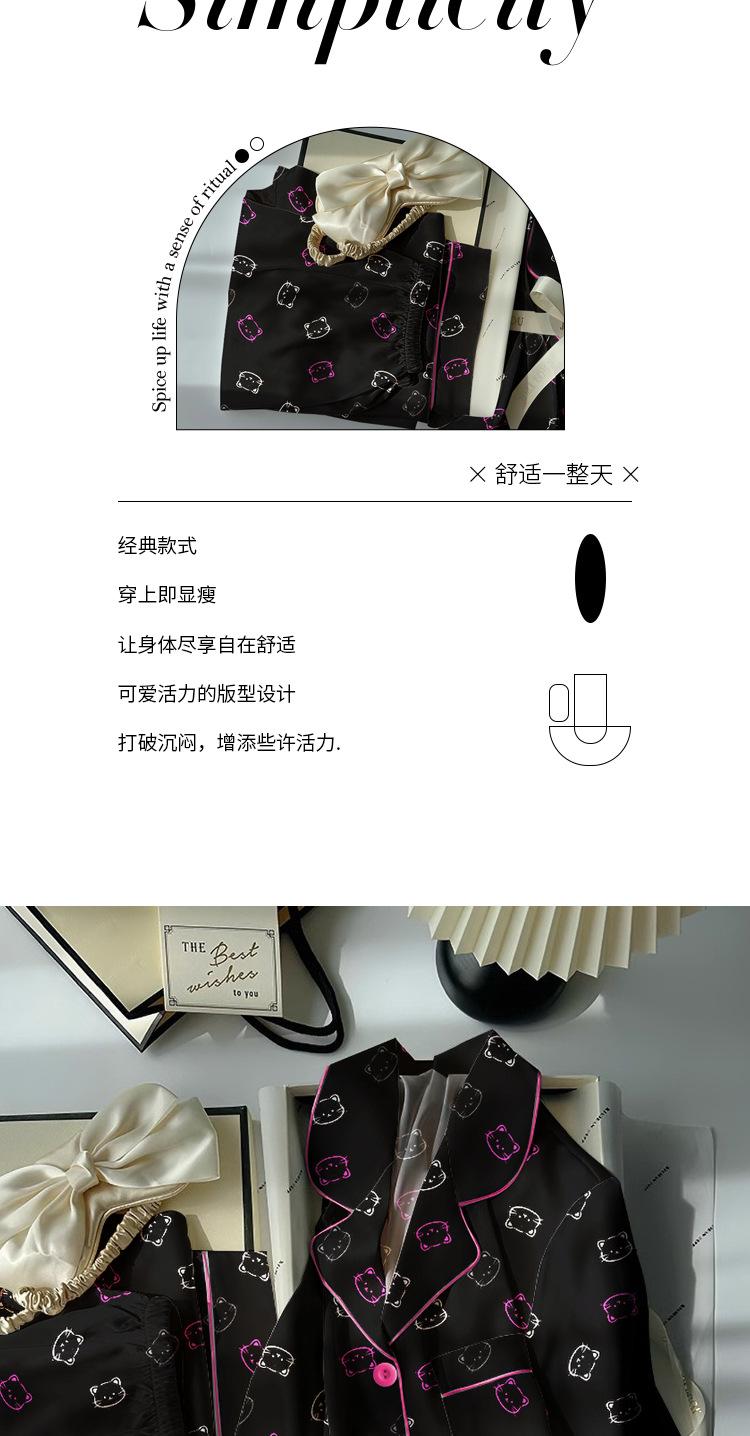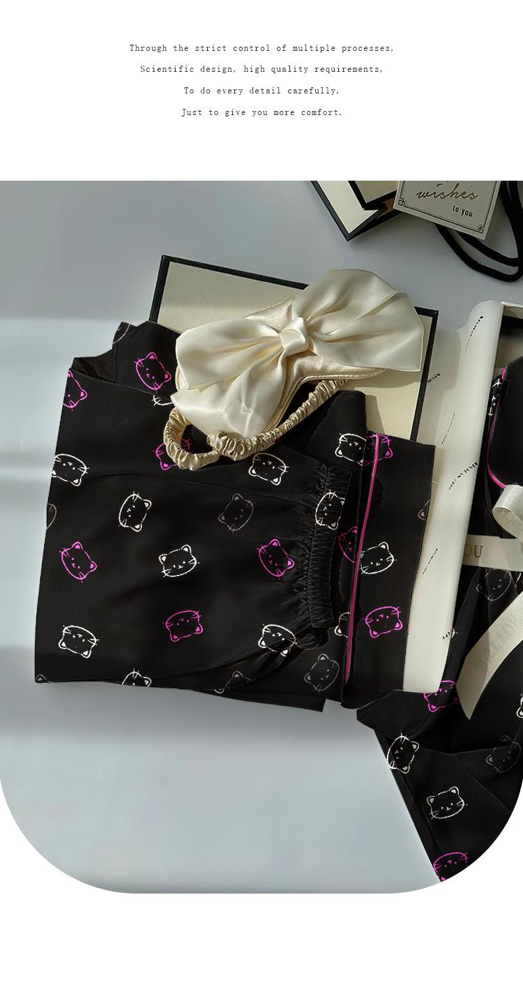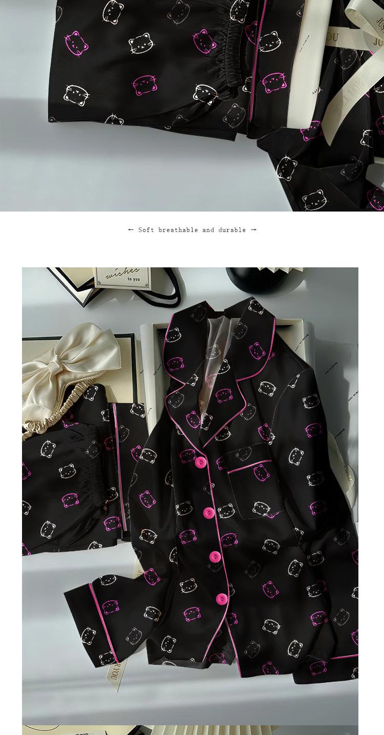 Otoño Nuevo Pijama de Mujer de Alta Gama Negro Gatito de Dibujos Animados Satén de Seda de Hielo Ropa para el Hogar Conjunto de Manga Larga Venta al por Mayor