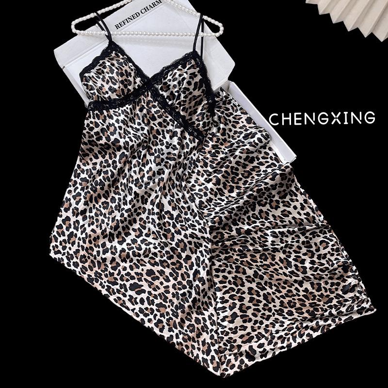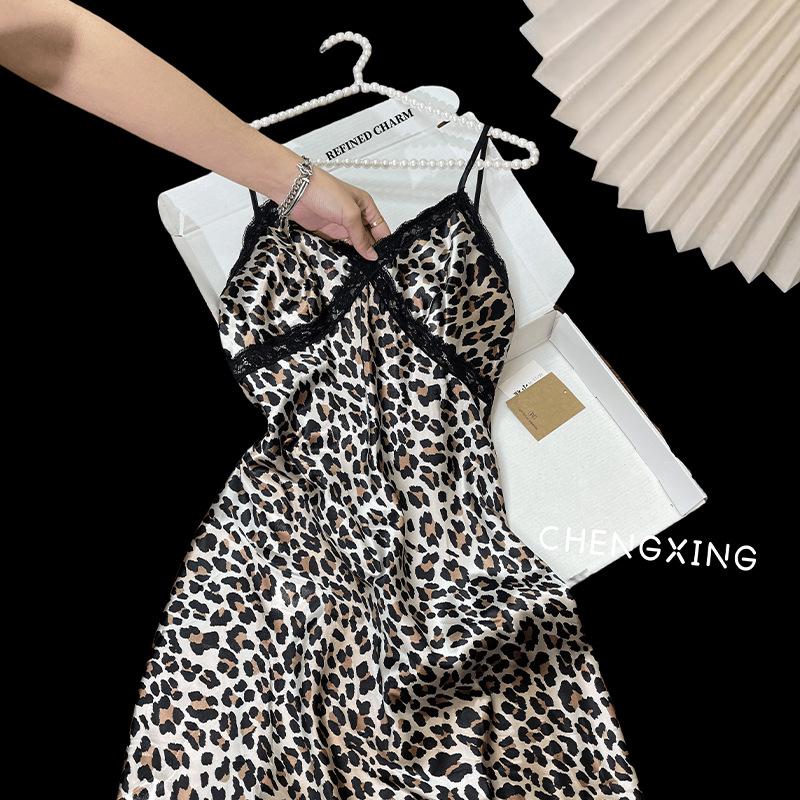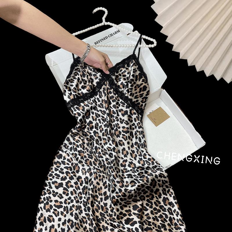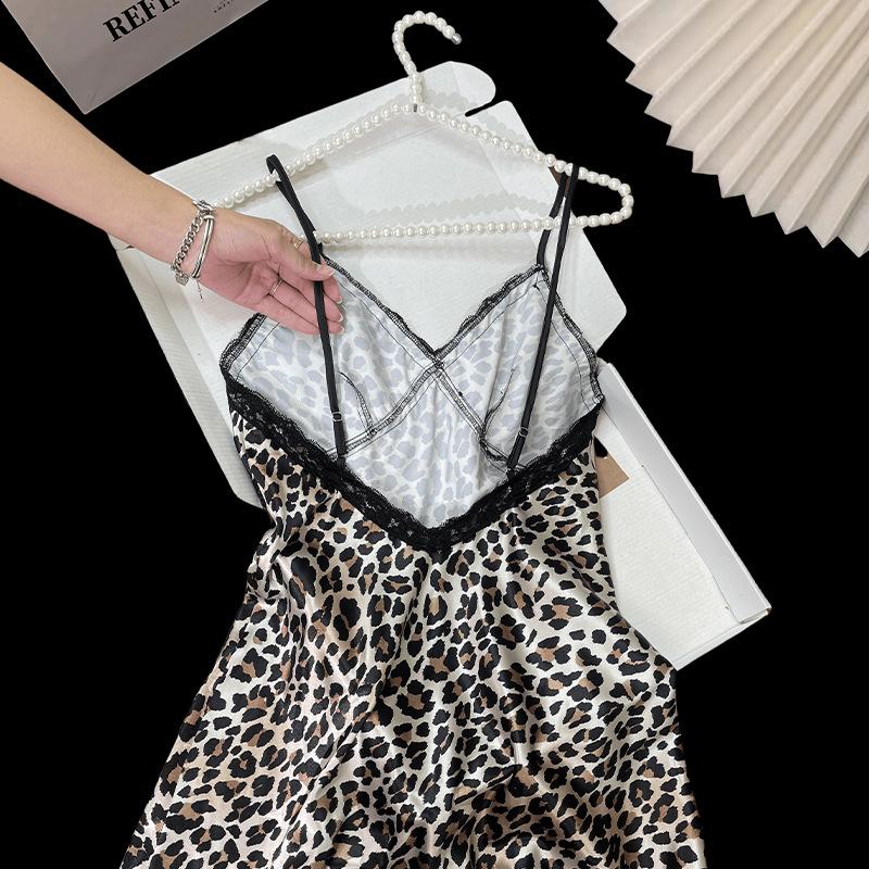 Camisón Sexy de Seda de Hielo para Mujer, Pijama Extra Largo con Estampado de Leopardo, Pijama de Tirantes Estilo Europeo y Americano con Almohadillas para el Busto, Ropa de Casa Francesa